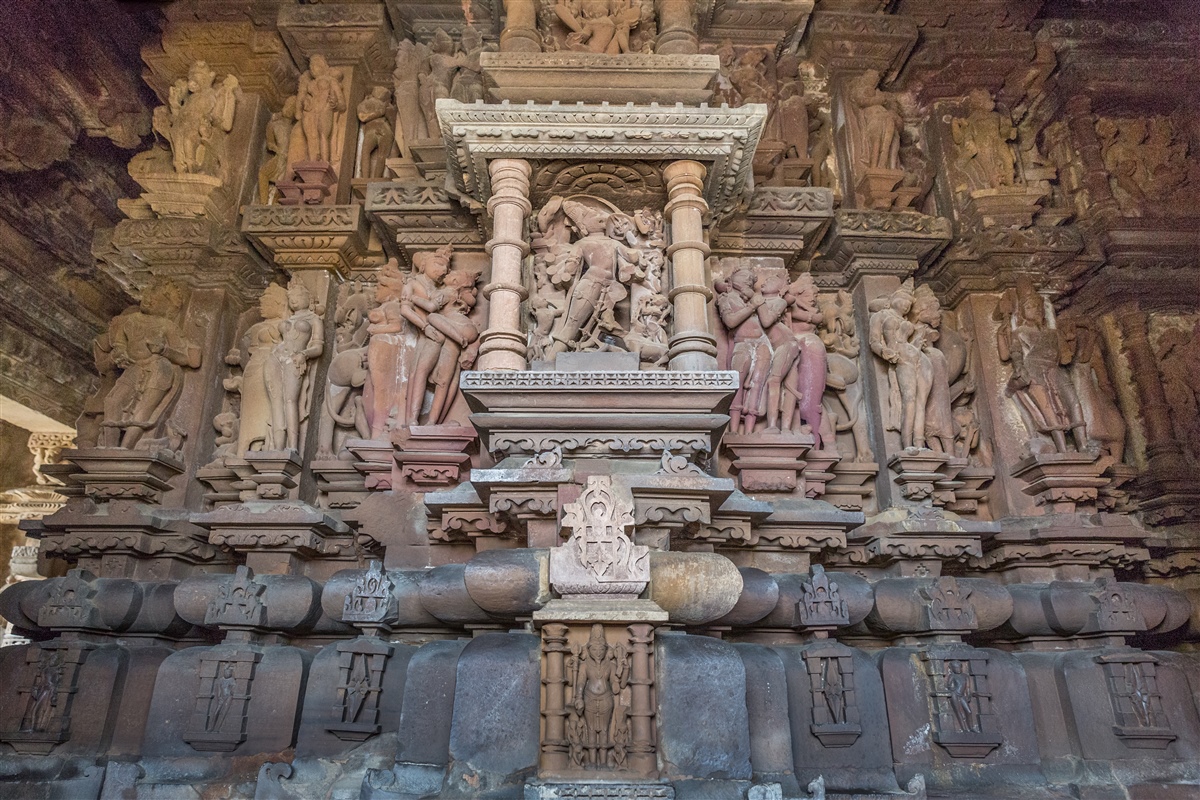 The representation of the Yali has been more thoroughly exploited in the Jain temples of Khajuraho, as compared to the erotic sculptures in the Western group. Yali (or Vyala) is a mythical creature which is considered as a mixture of two or more animals, commonly used as a decorative element in both North Indian (Nagara) and South Indian (Dravidian) temple architecture. The difference between the two styles will be the placement – in the Nagara style, these are carved on the outer walls in the form separators between the figures of various apsaras and other hindu deities, whereas in the Dravidian style there feature prominently in pillars bases and balustrades and are considered as guardians of the temples. Samarangana Sutradhara (the encyclopedia of Indian classical architecture) mentiones 16 different types of Vyalas.