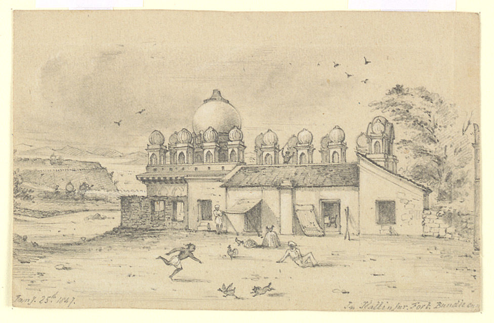 Pencil and wash drawing of a building inside Kalinjar Fort, Uttar Pradesh by Frederick Charles Maisey (1825-1892) in 1847. Lieutenant Maisey was based at Kalinjar from 1845 to 1847. This image is inscribed: ‘Jan 25th, 1847. In Kallinjur Fort, Bundlecun.’