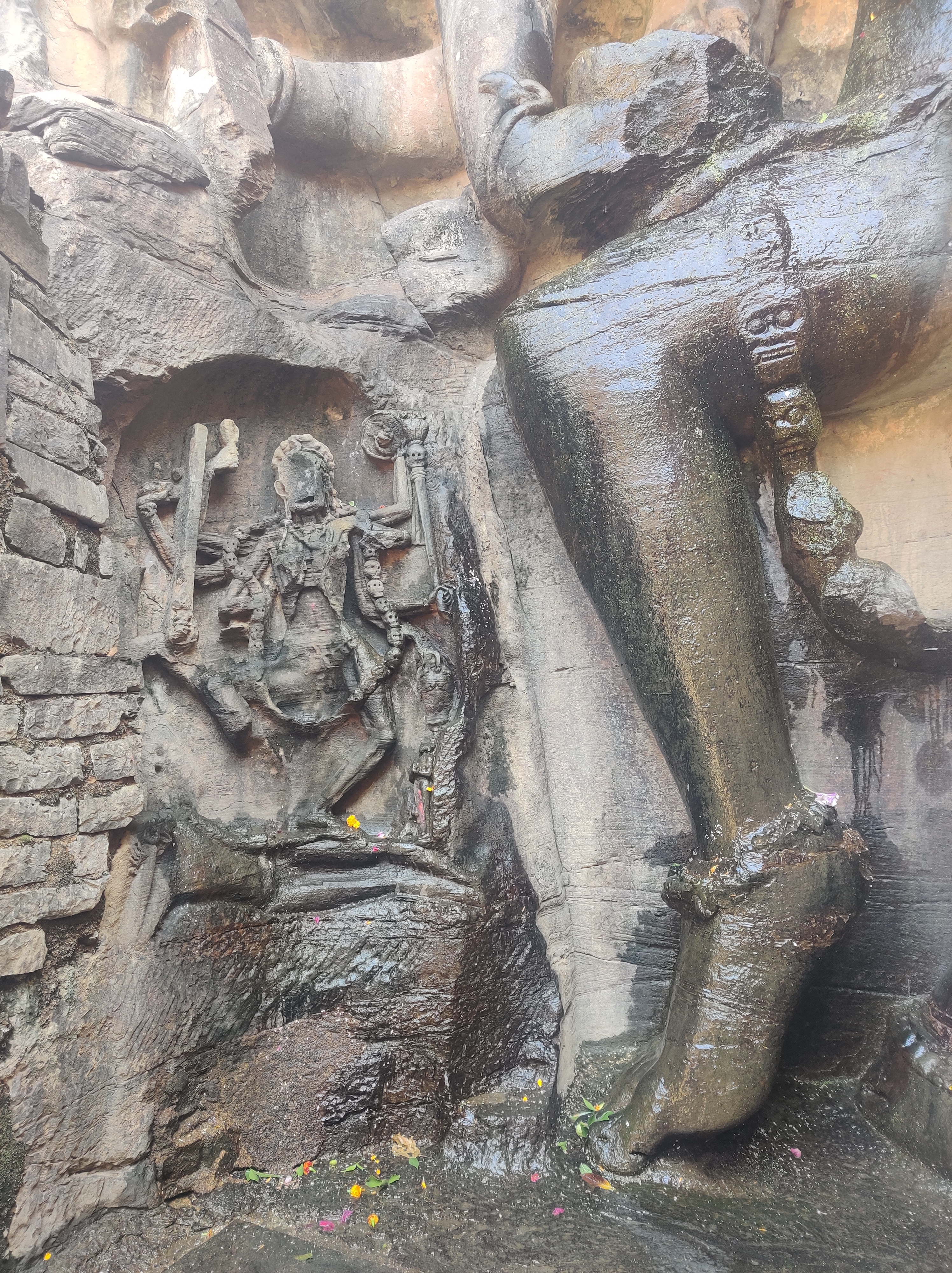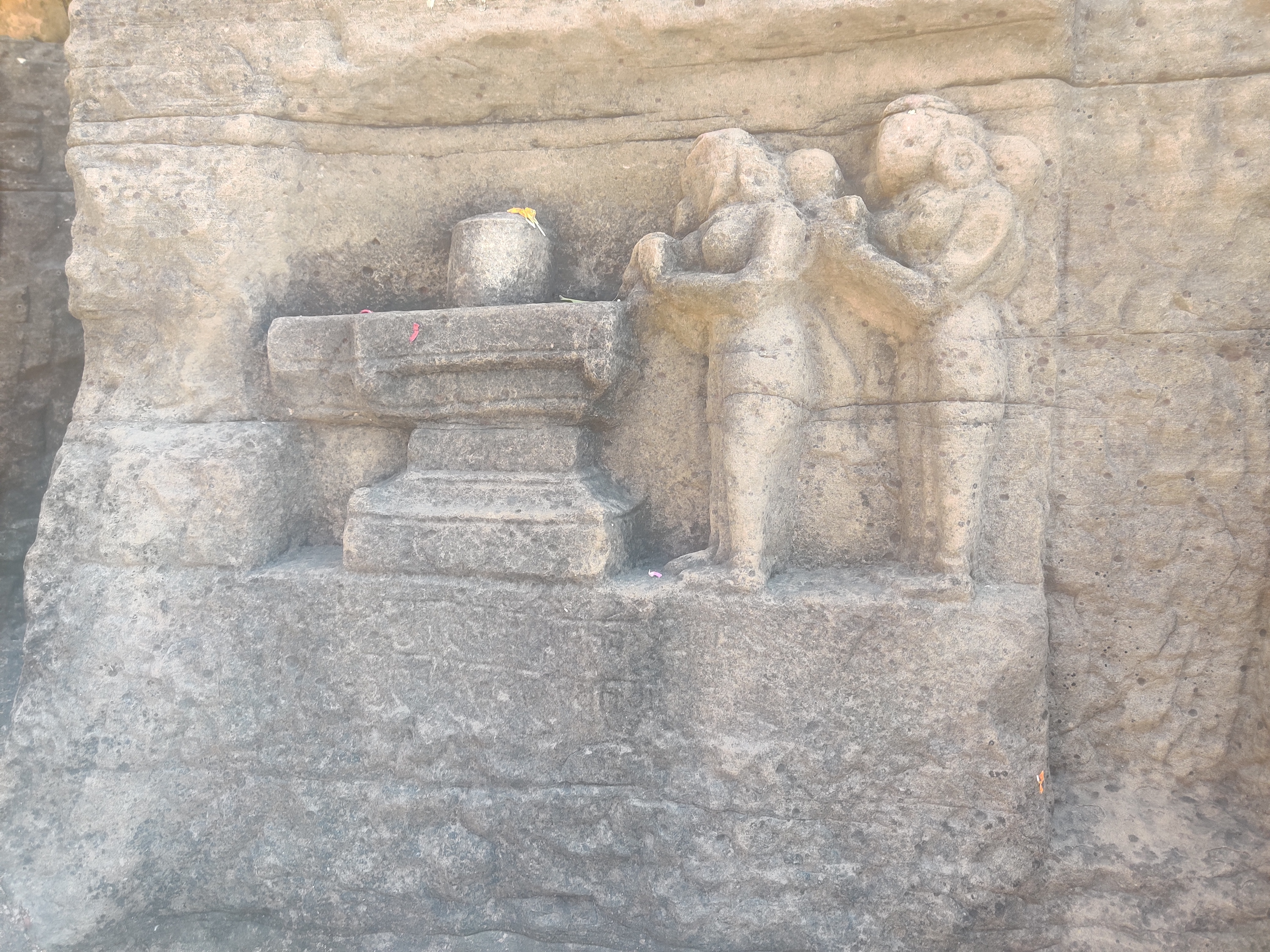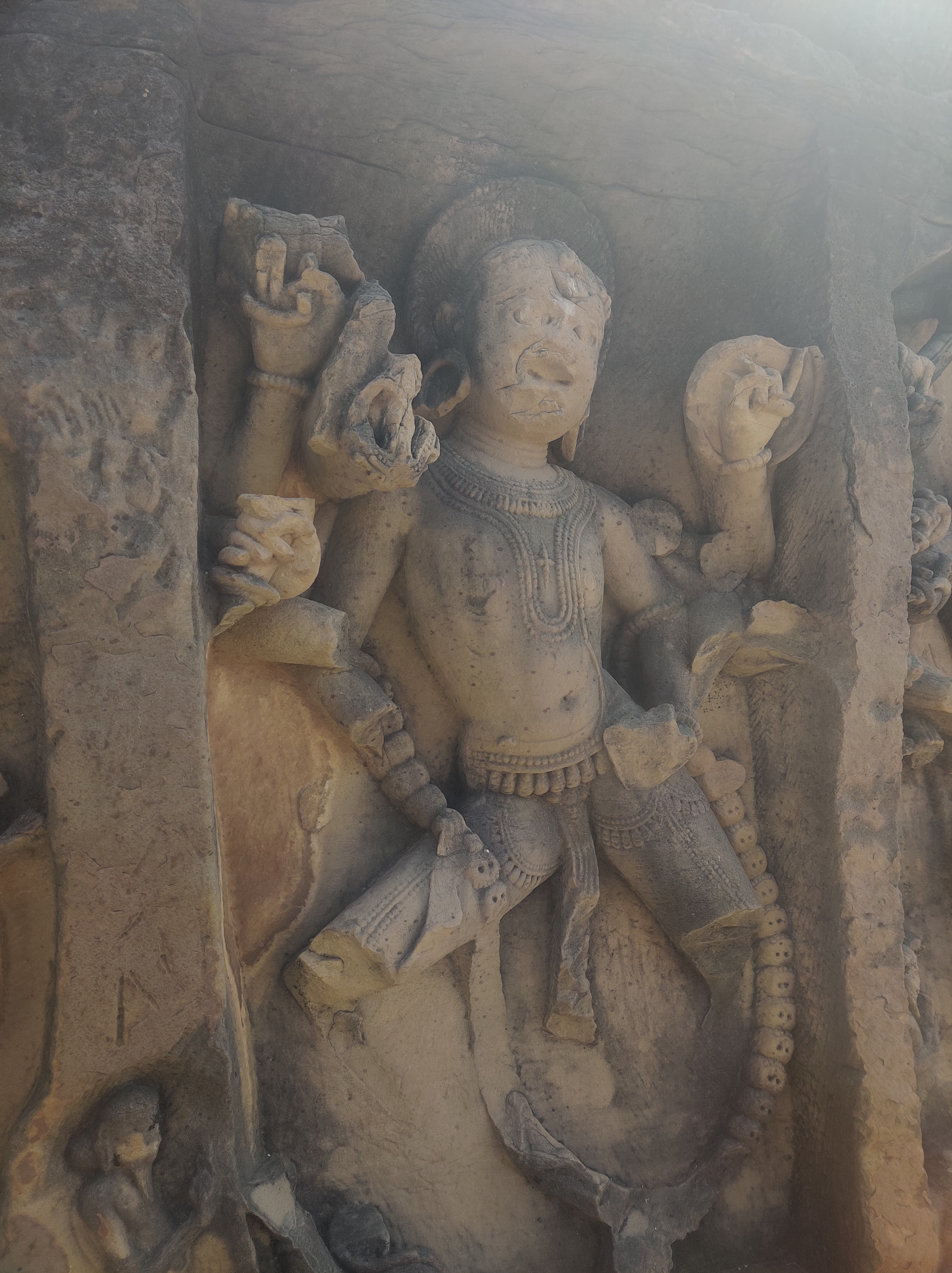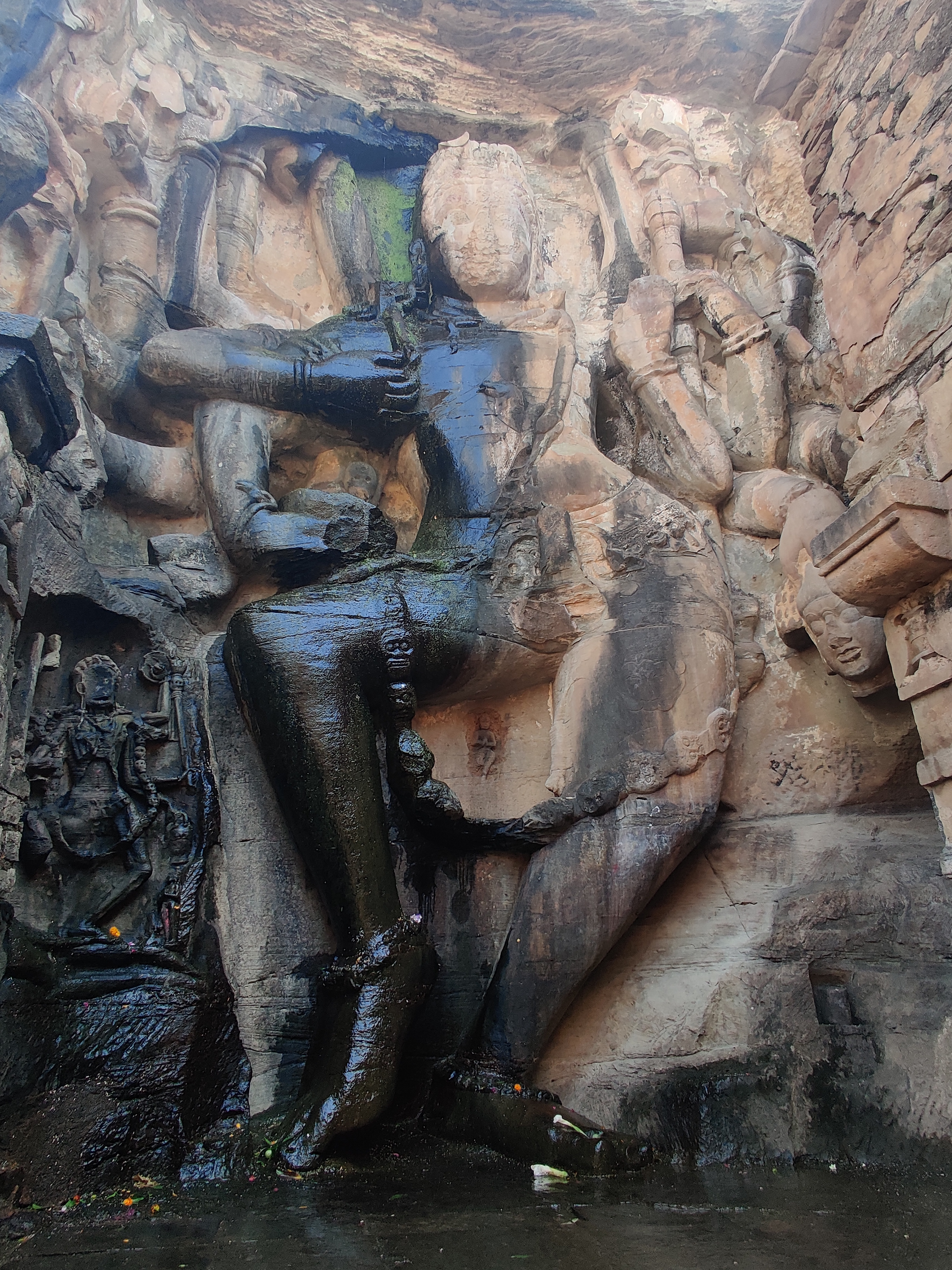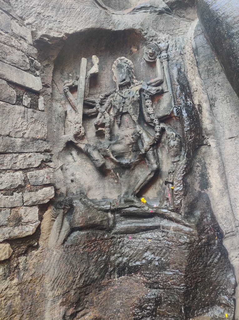 The main attraction of the Kalinjar fort is the Neelkanth Temple, built by the Chandela ruler Paramaditya Dev. Within the cave are two large lingams, which seem to have grown organically out of the wall. The Shiva lingam here is of blue stone and has a popular lore associated with it. It is said that during the great churning of the ocean (Amruth-manthan), Shiva drank the poison Hallahal in order to protect the world from its poison, thus turning his throat blue (hence the name Neelkantha). Despite being an omnipotent, the poison was so potent that it causes great irritation and discomfort to the great Lord. As a result, he took refuge in the caves of Kalinjar to soothe his throat. Hence, it is said that even today, the Shivalinga keeps dripping water only from the lower half of the lingam, as if it is still sweating, while rest of the lingam remains dry. The name of the fort also originates from this very source –