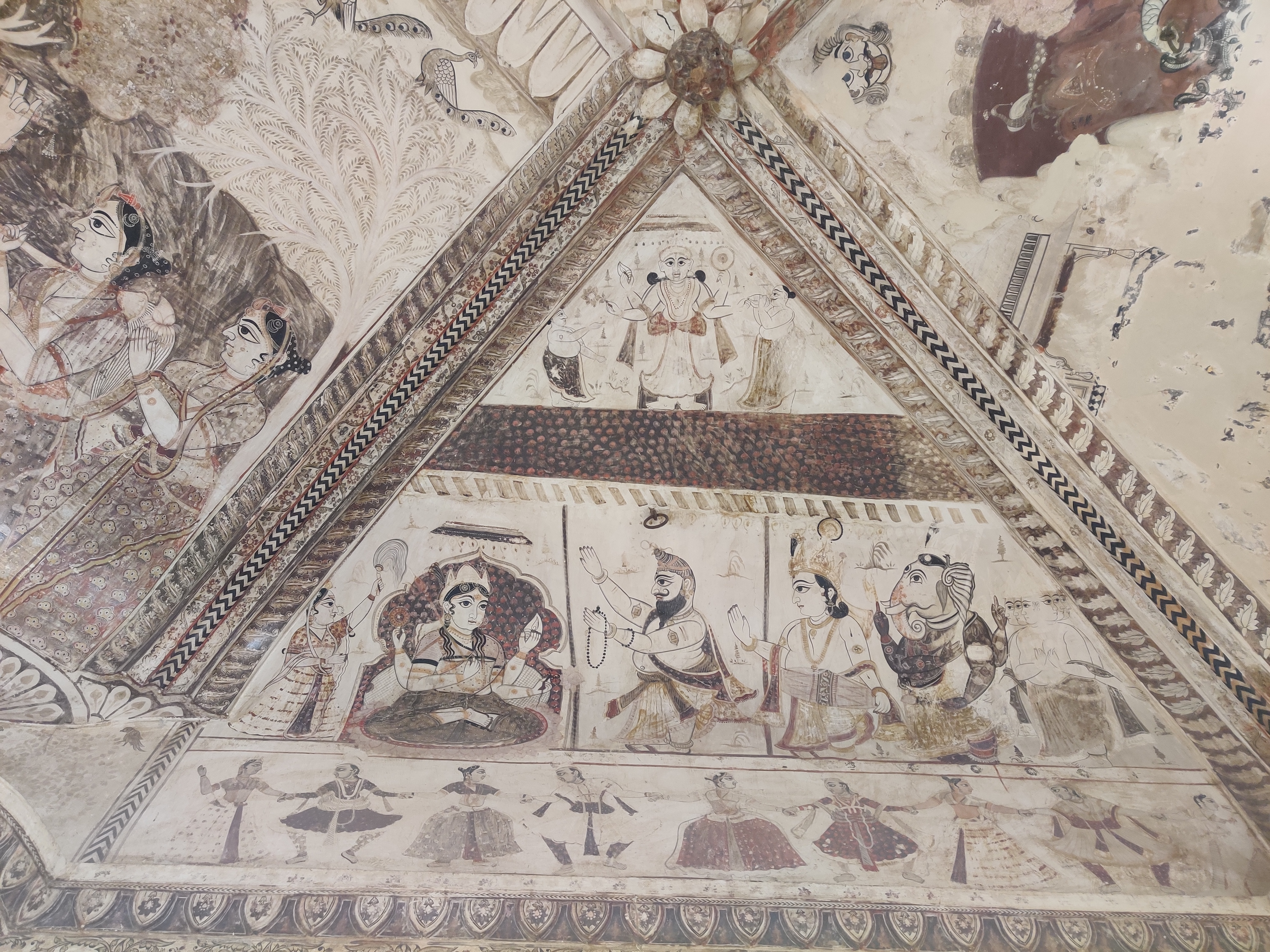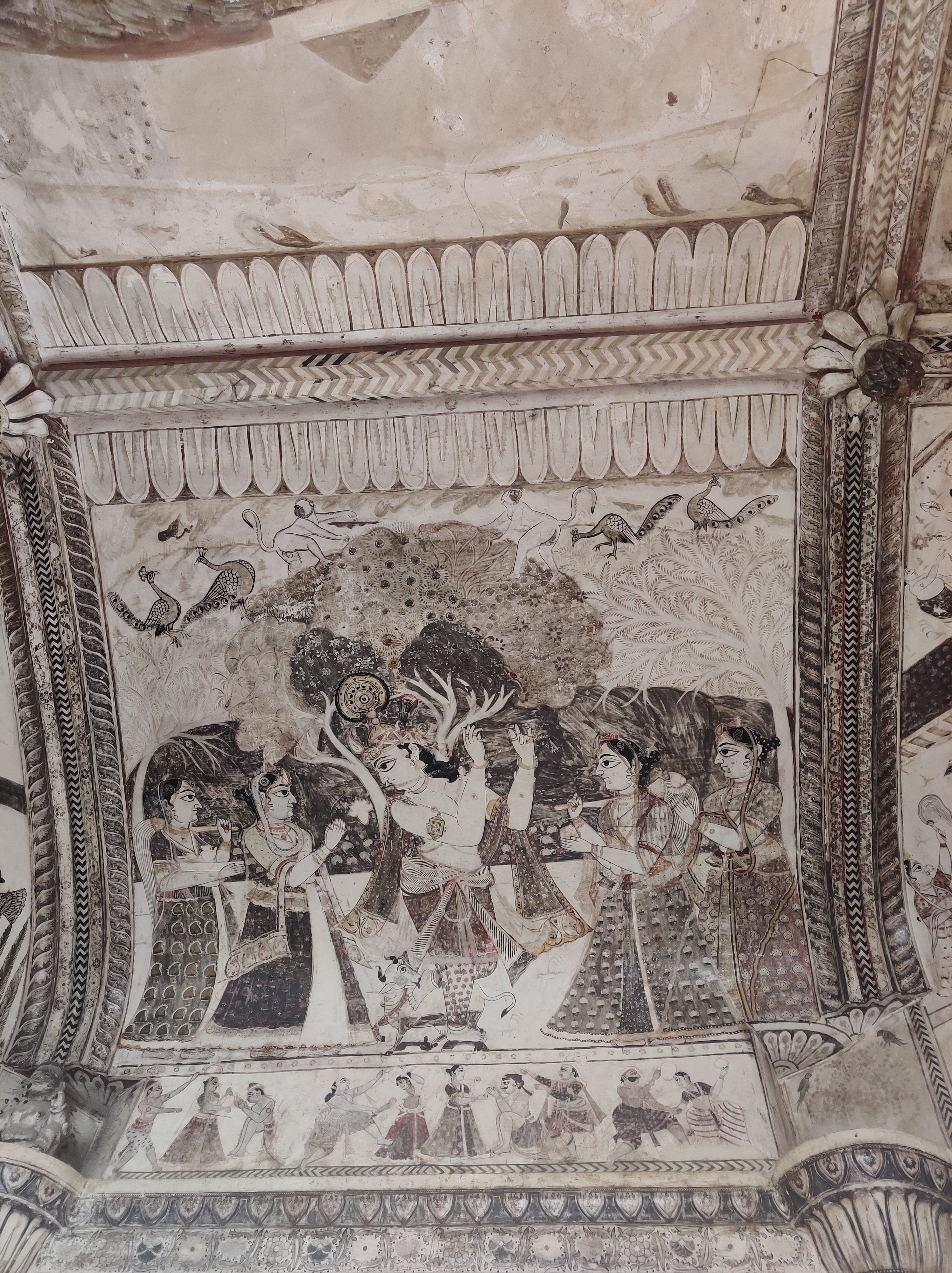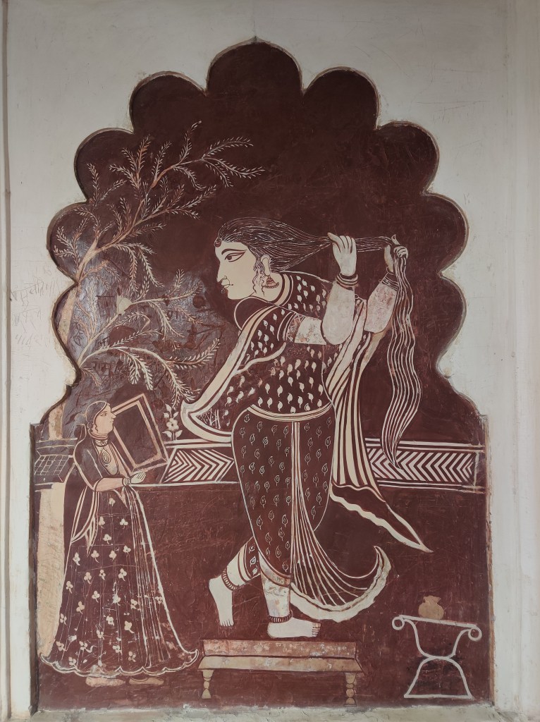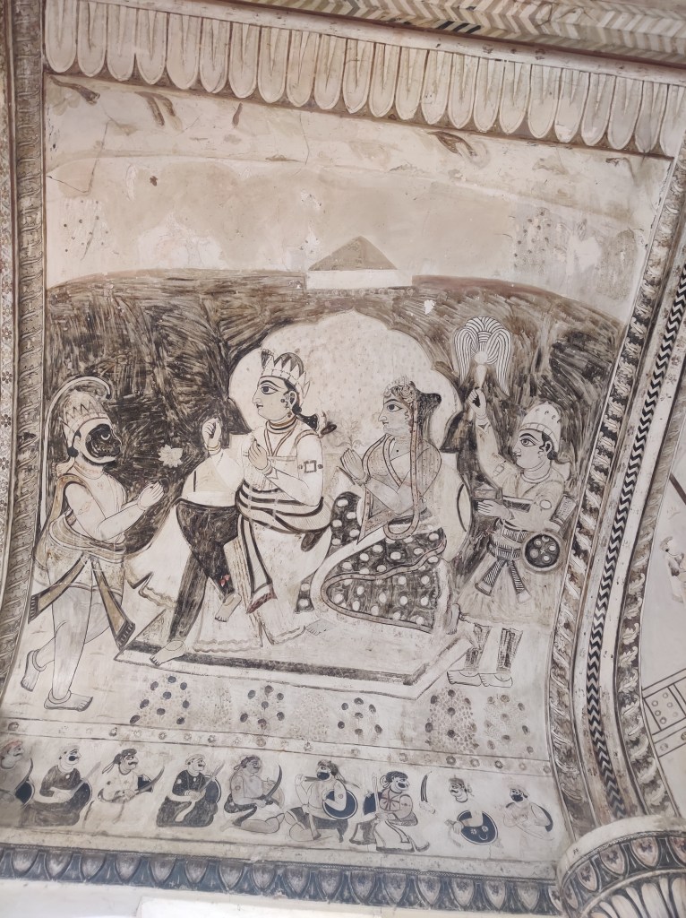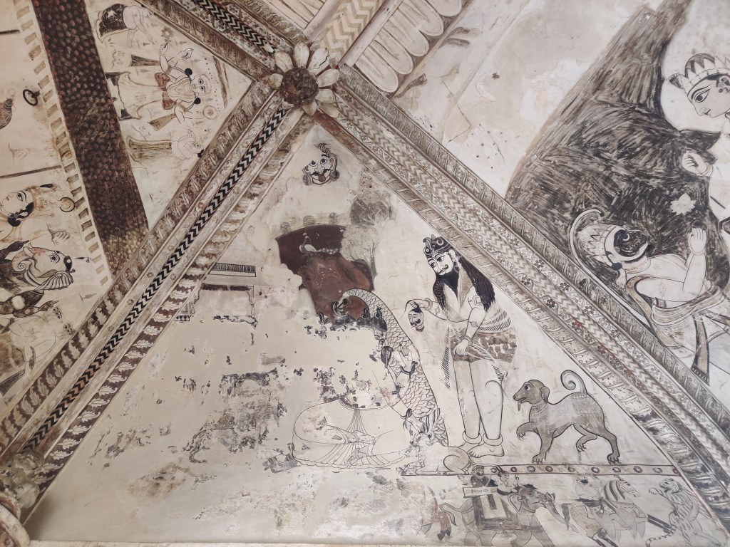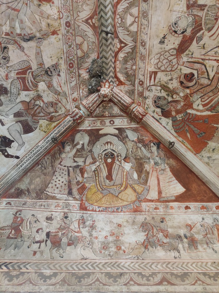 If the exterior itself feels surreal for a temple, you will forget all that once you set your foot across the threshold. The walls are covered with the traditional Bundeli wall paintings, that are still used as inspiration for designing sarees. In Bundelkhand region, painting is usually done by a caste of professional painters called Chiteras. Mud plaster base composed of red clay and cow dung mixture is used, over which linear patterns are etched with fingers, in a process called as ‘Lipai’.