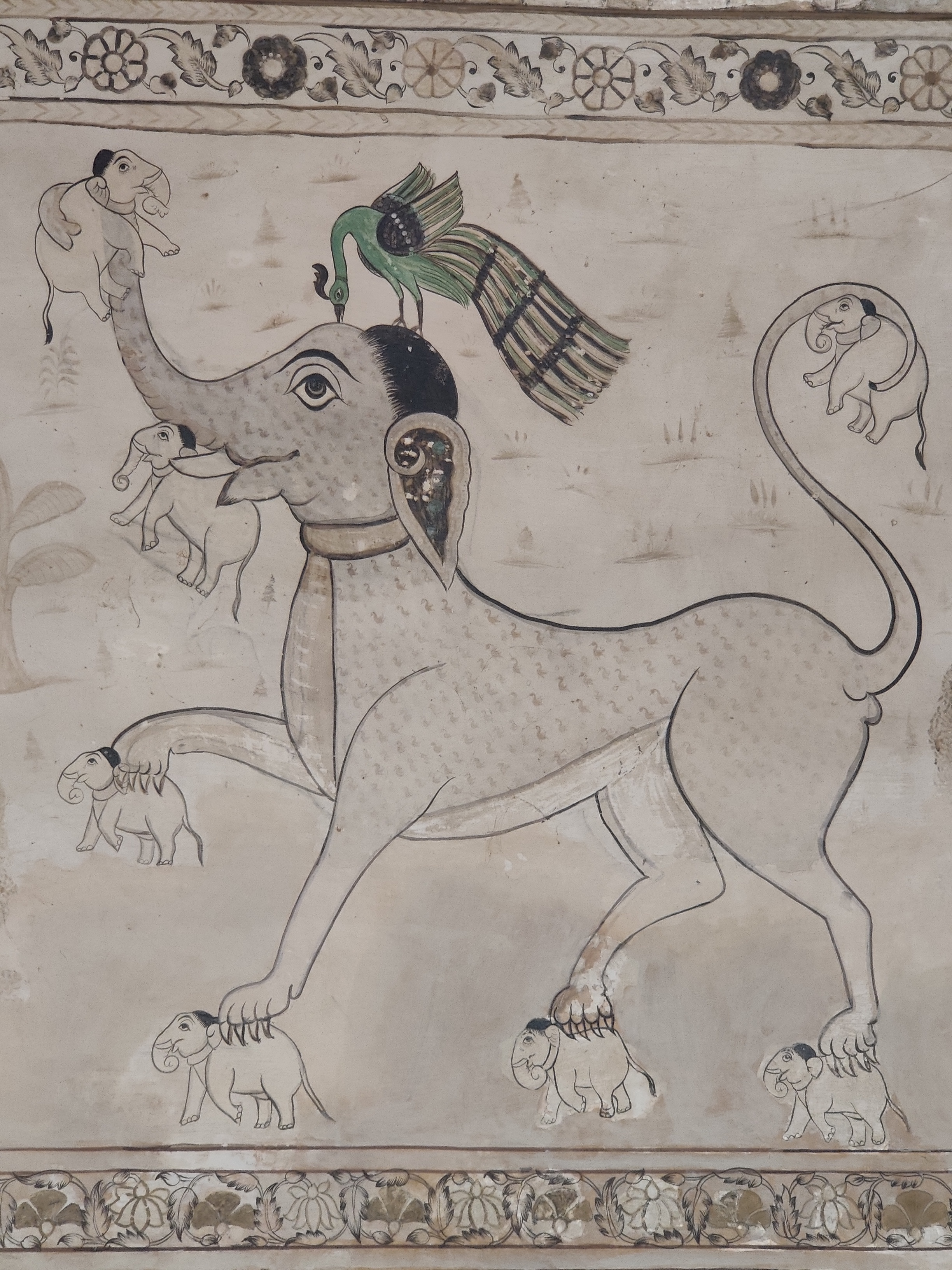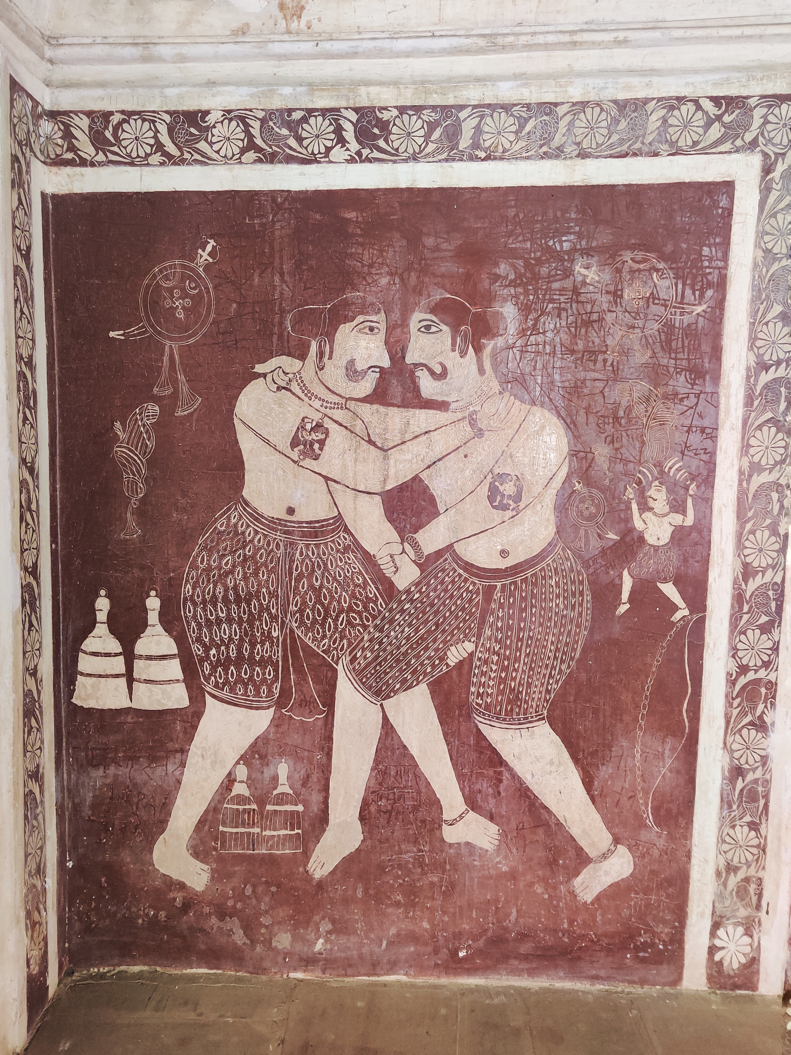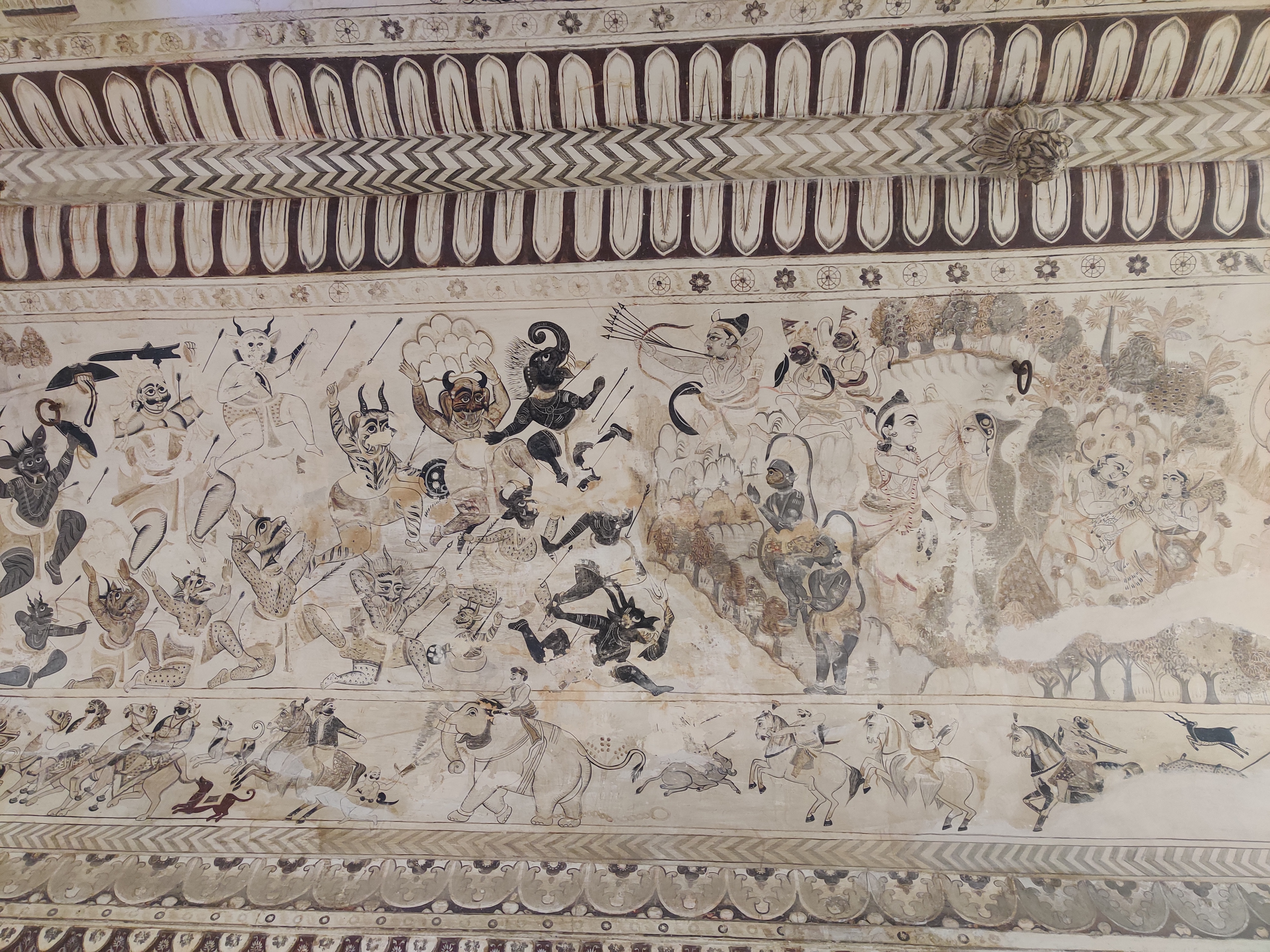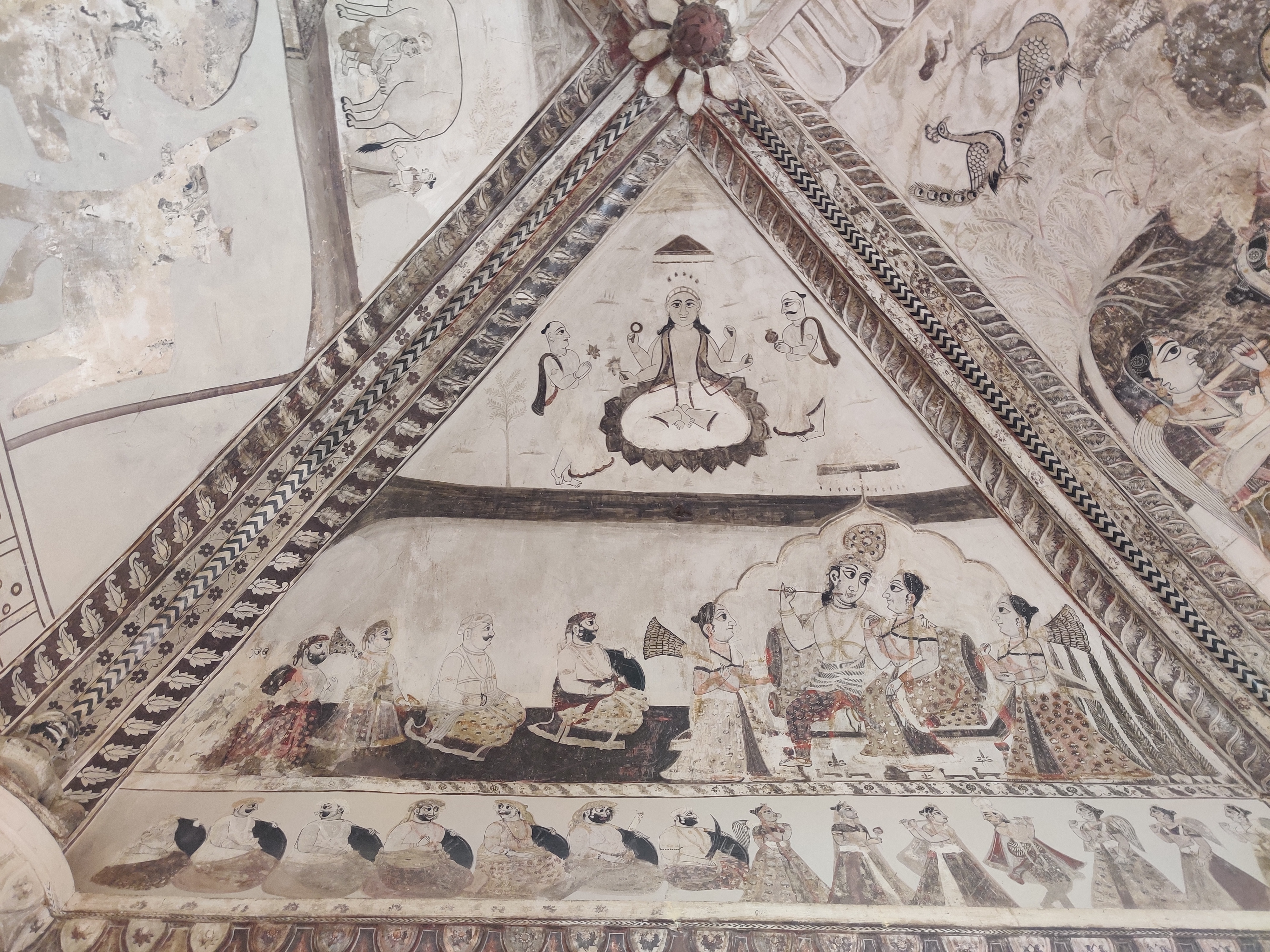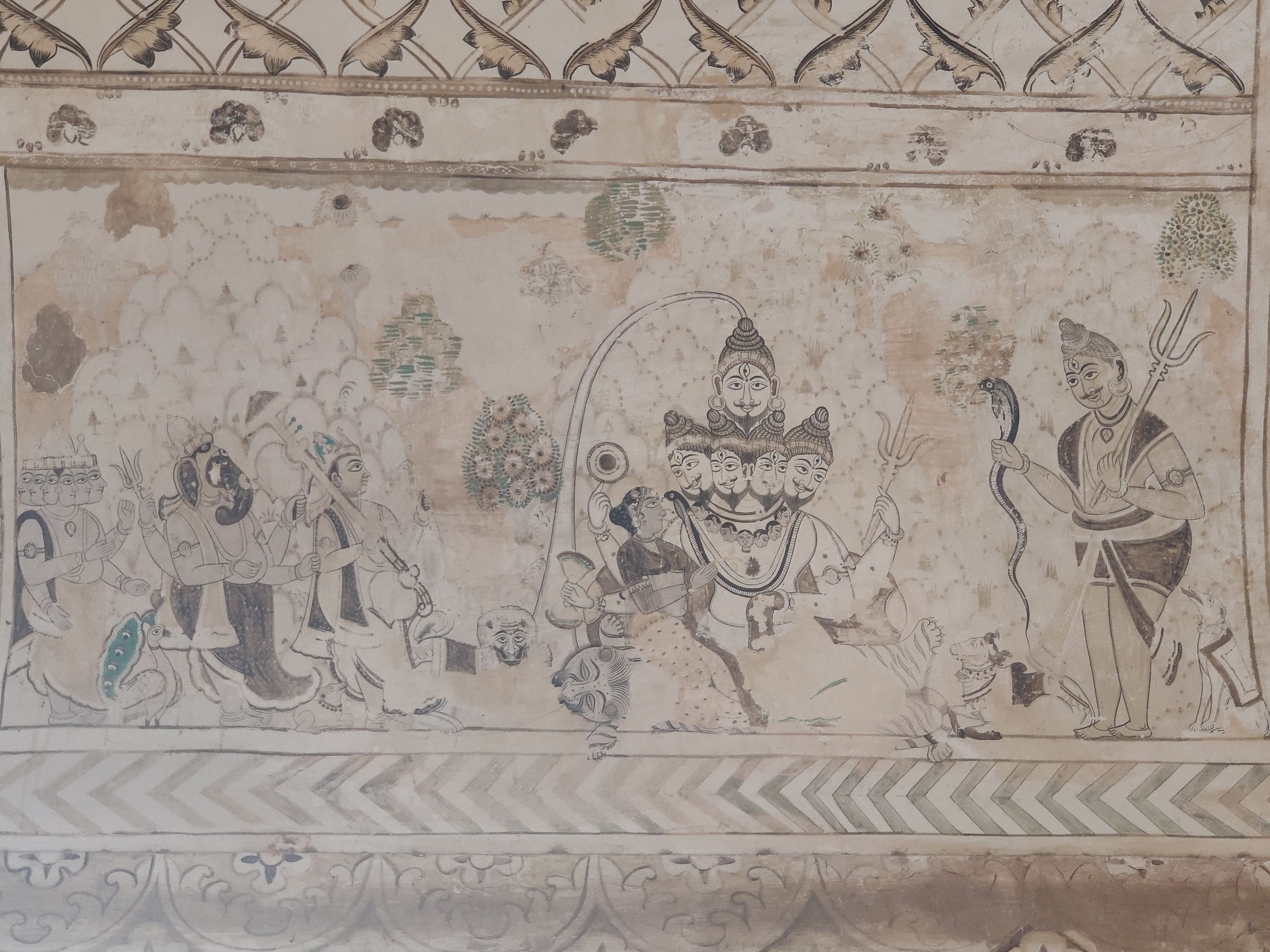 If the exterior itself feels surreal for a temple, you will forget all that once you set your foot across the threshold. The walls are covered with the traditional Bundeli wall paintings, that are still used as inspiration for designing sarees. In Bundelkhand region, painting is usually done by a caste of professional painters called Chiteras. Mud plaster base composed of red clay and cow dung mixture is used, over which linear patterns are etched with fingers, in a process called as ‘Lipai’.