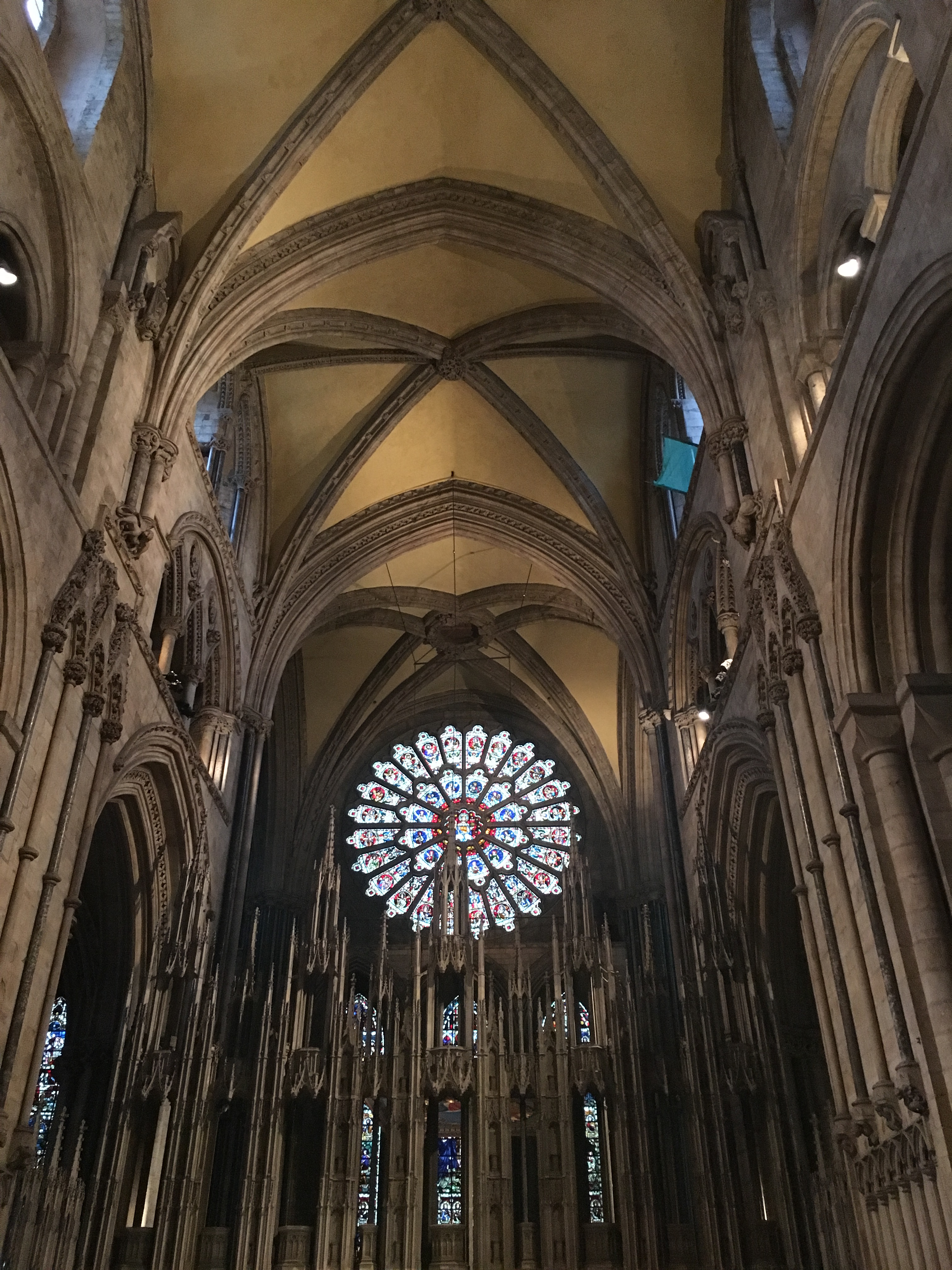 The Rose Window, one of the largest in Europe, was produced in the year 1515 by the workshop of Master Glazier Robert Petty. The outer panels contain two red Lancastrian roses, alternating with panels containing two red and white Tudor roses. This alluded to the union of the Houses of Lancaster and York through the marriage of Henry VII and Elizabeth of York in 1486, and may have been designed to enforce the legitimacy of the new ruling house of Tudor. Early in the morning of 9th July 1984, York Minster suffered a serious fire in its south transept, as a result of lightning, causing the roof to collapse. The heat even cracked the 7000 glass pieces in the Rose Window in about 40,000 places, but miraculously it stayed intact.