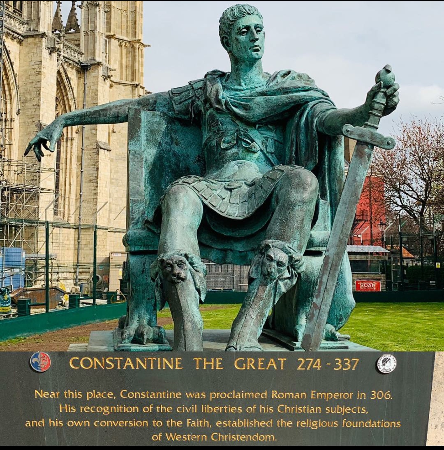 Just on the frontsteps of the Minster, stands a beautiful bluish-green tinged statue of Emperor Constantine who, on 25 July 306 AD, was proclaimed Emperor of the Western Roman Empire by his troops in York (then Eboracum), an important Roman stronghold in Britain. As the placard suggests, he was the first Roman emperor who professed himself to Christianity. Throughout his life, Constantine ascribed his success to his conversion to Christianity and the support of the Christian God. He not only initiated the evolution of the Roman empire into a Christian state but also provided the impulse for a distinctively Christian culture that prepared the way for the growth of Byzantine and Western medieval culture.