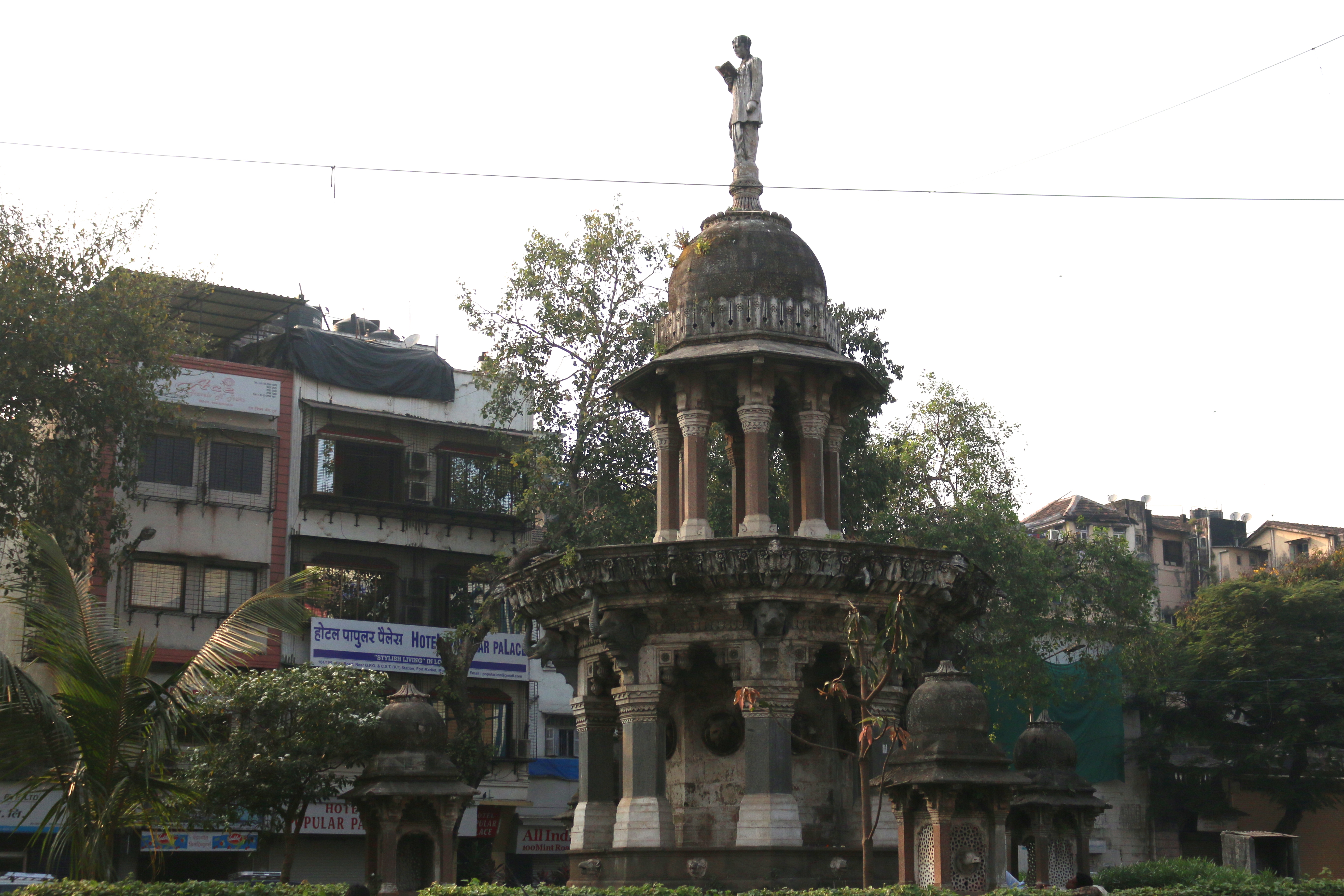 Standing at the Mint Road junction is the 40-ft high Mulji Jetha Fountain, an Indo-Saracenic monument designed by architect Frederick William Stevens and John Griffiths. The fountain is a memorial to Dharamsi Mulji, the only son of Ratansi Mulji, a self-made and philanthropic cotton-merchant, who died due to a disease in 1889.