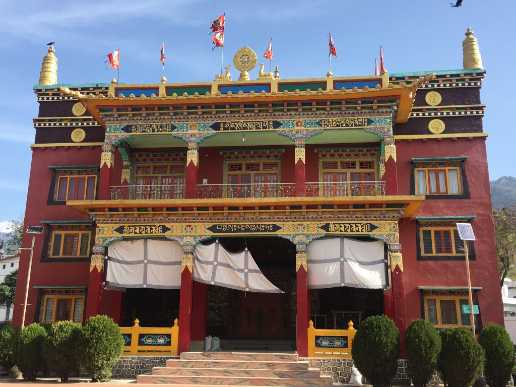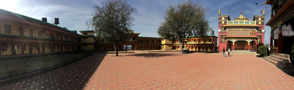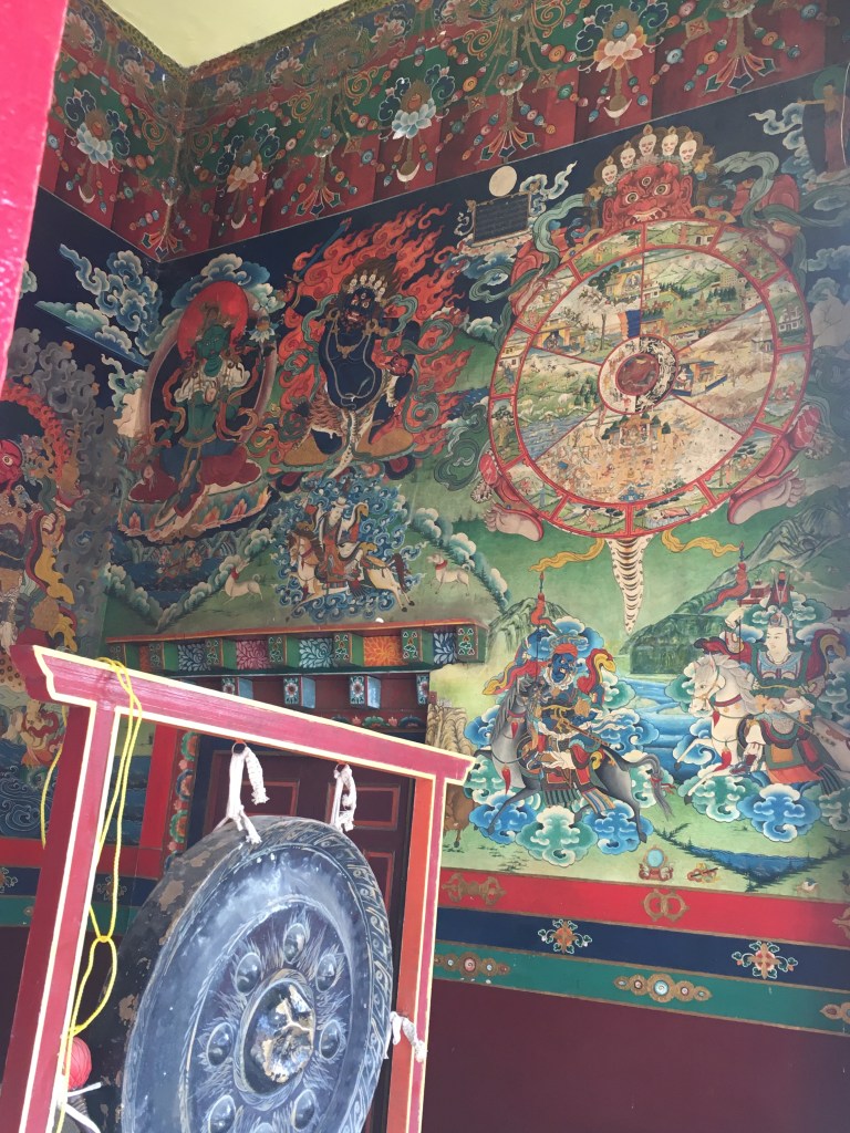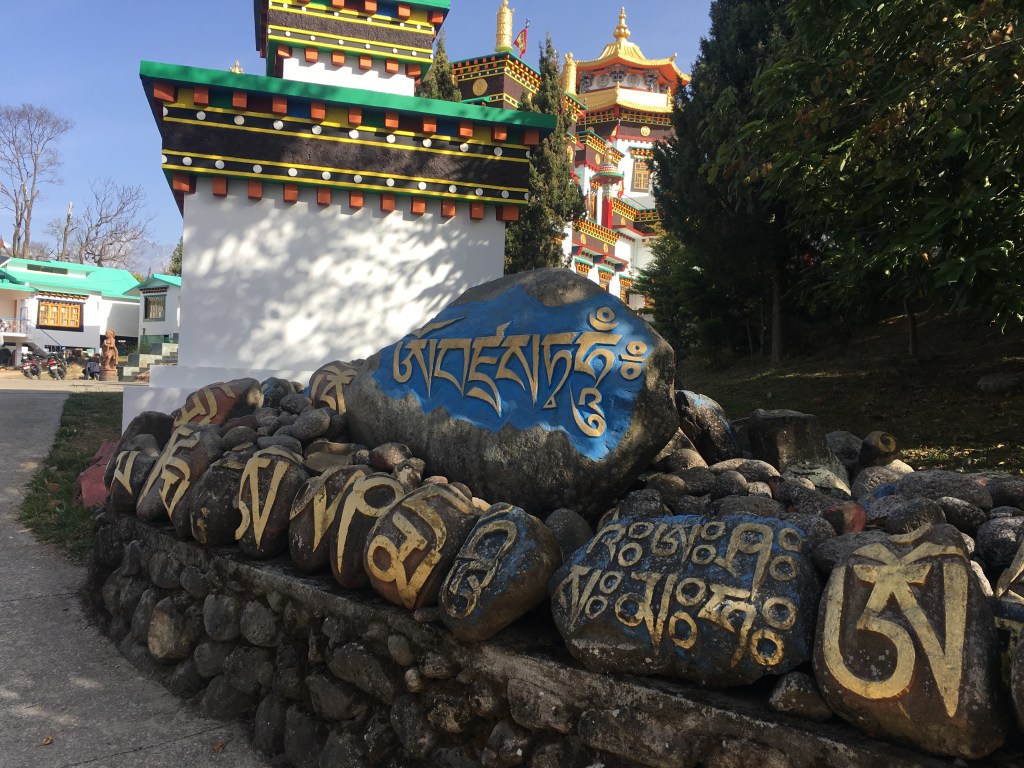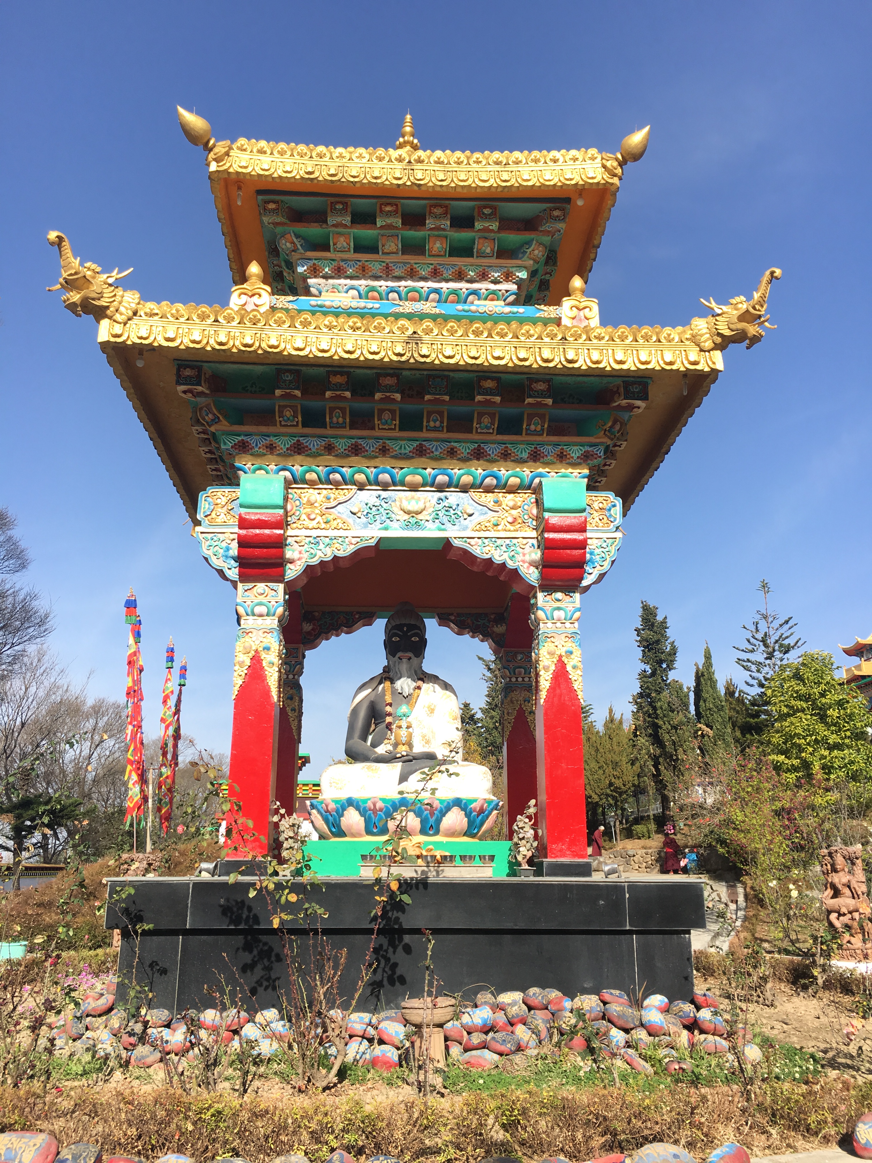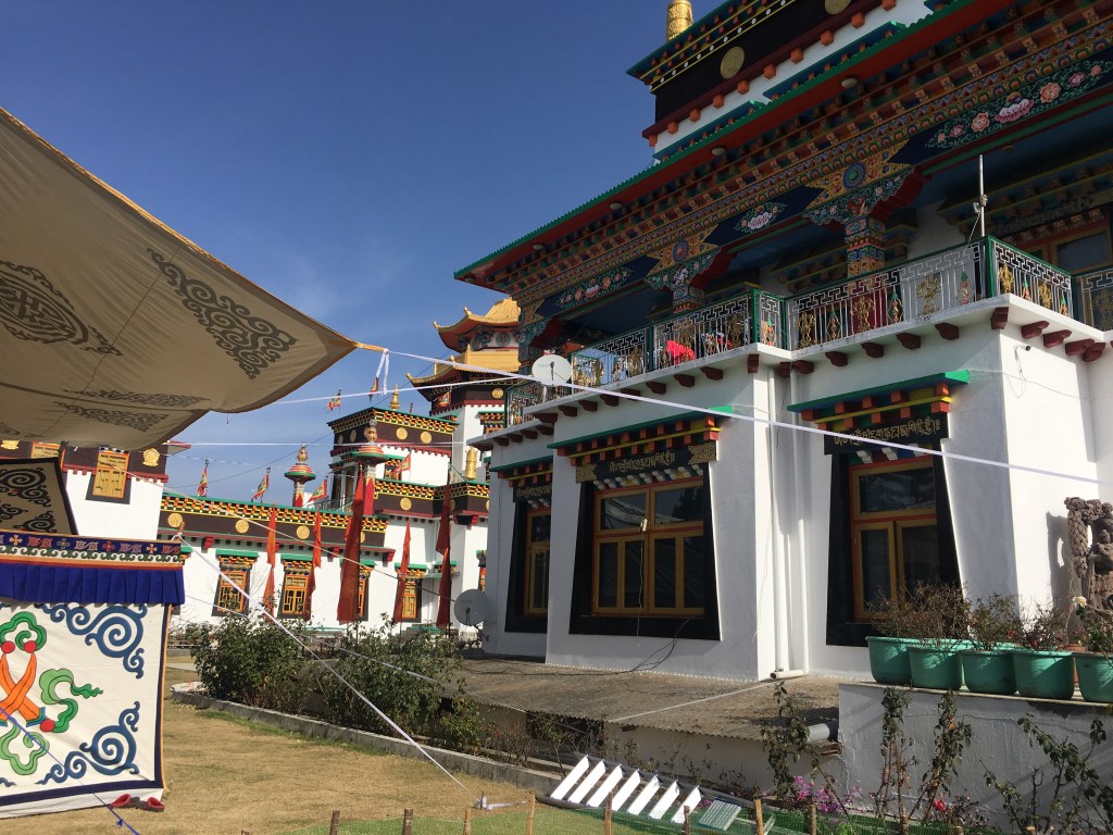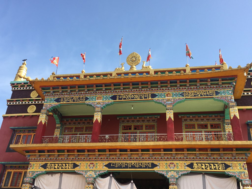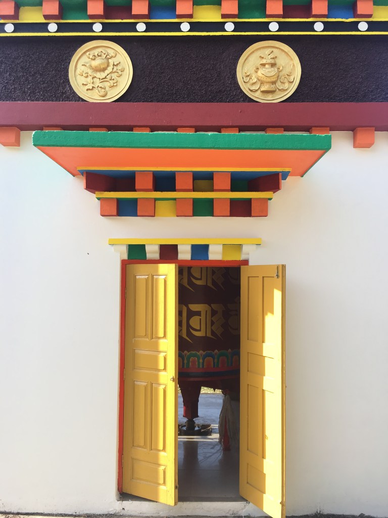 8 white pillars, ornately painted, sit upon red and blue rocks of all sizes, each with gold prayer chants illustrated on them creating a picturesque welcome to the monastery. The expansive courtyard consists of monk’s boarding, set in a semi-circle, facing a massive monastery and a solitary tree with a beautiful golden statue of Lord Buddha beneath it. There is a huge, grand statue of Padmasambhaya in the main hall but unfortunately it was closed when we visited. FYI, the 1999 Hollywood movie called ‘The Cup’ was entirely shot right here – it was about 2 young football-obsessed monks who desperately try to obtain a TV to watch the World Cup Finals in the monastery.