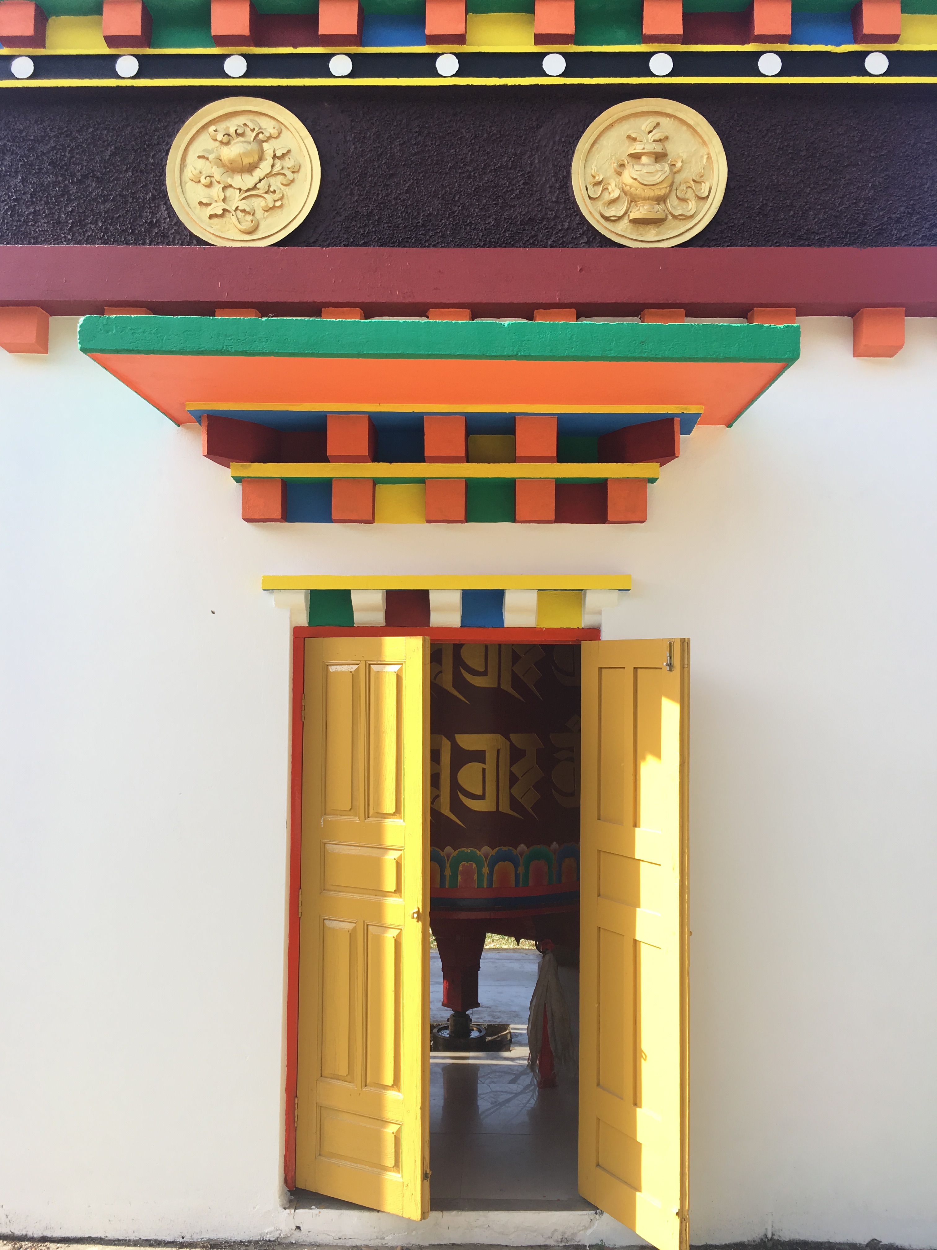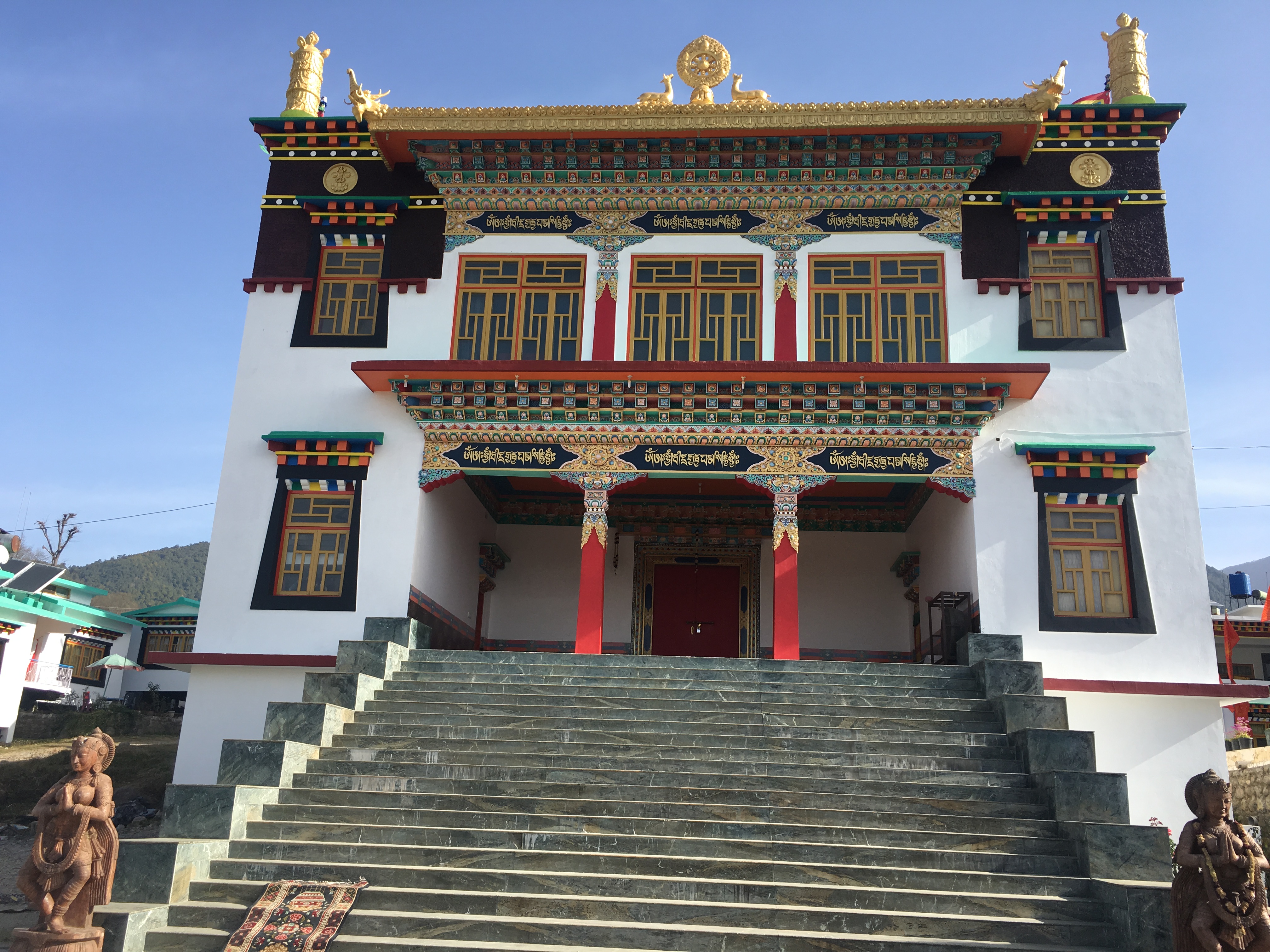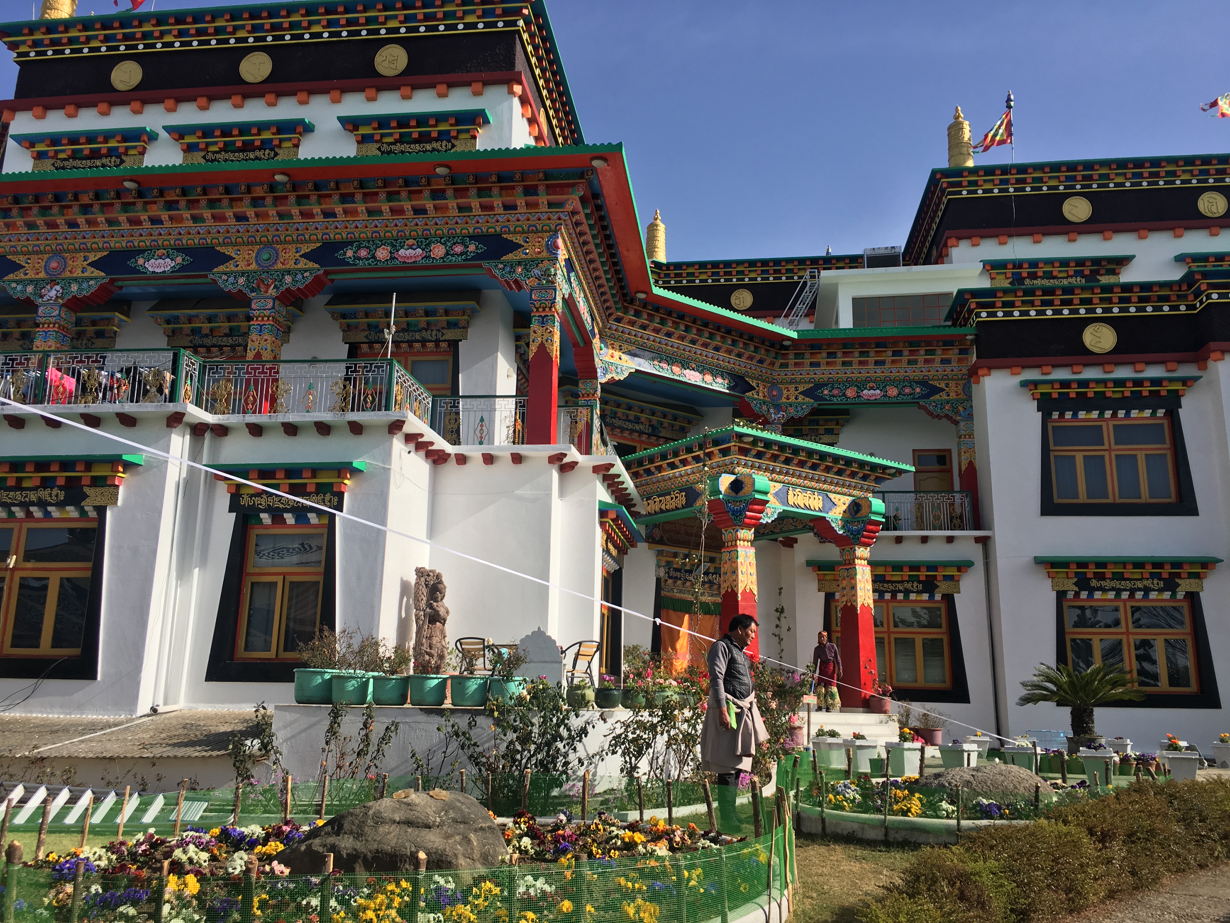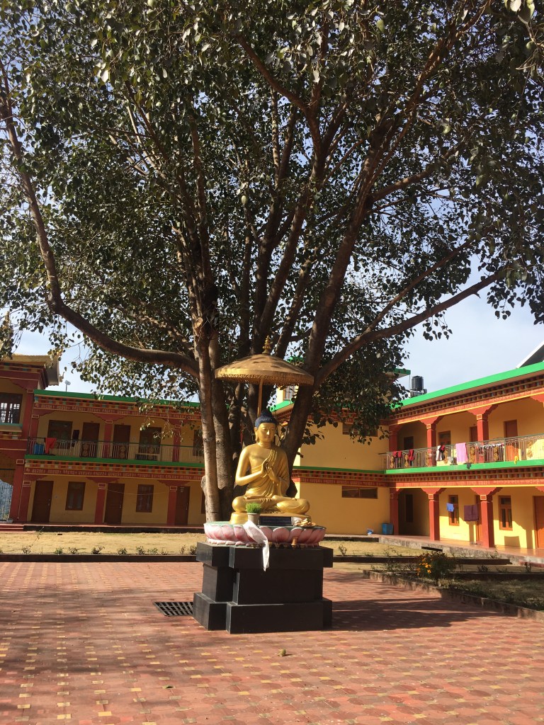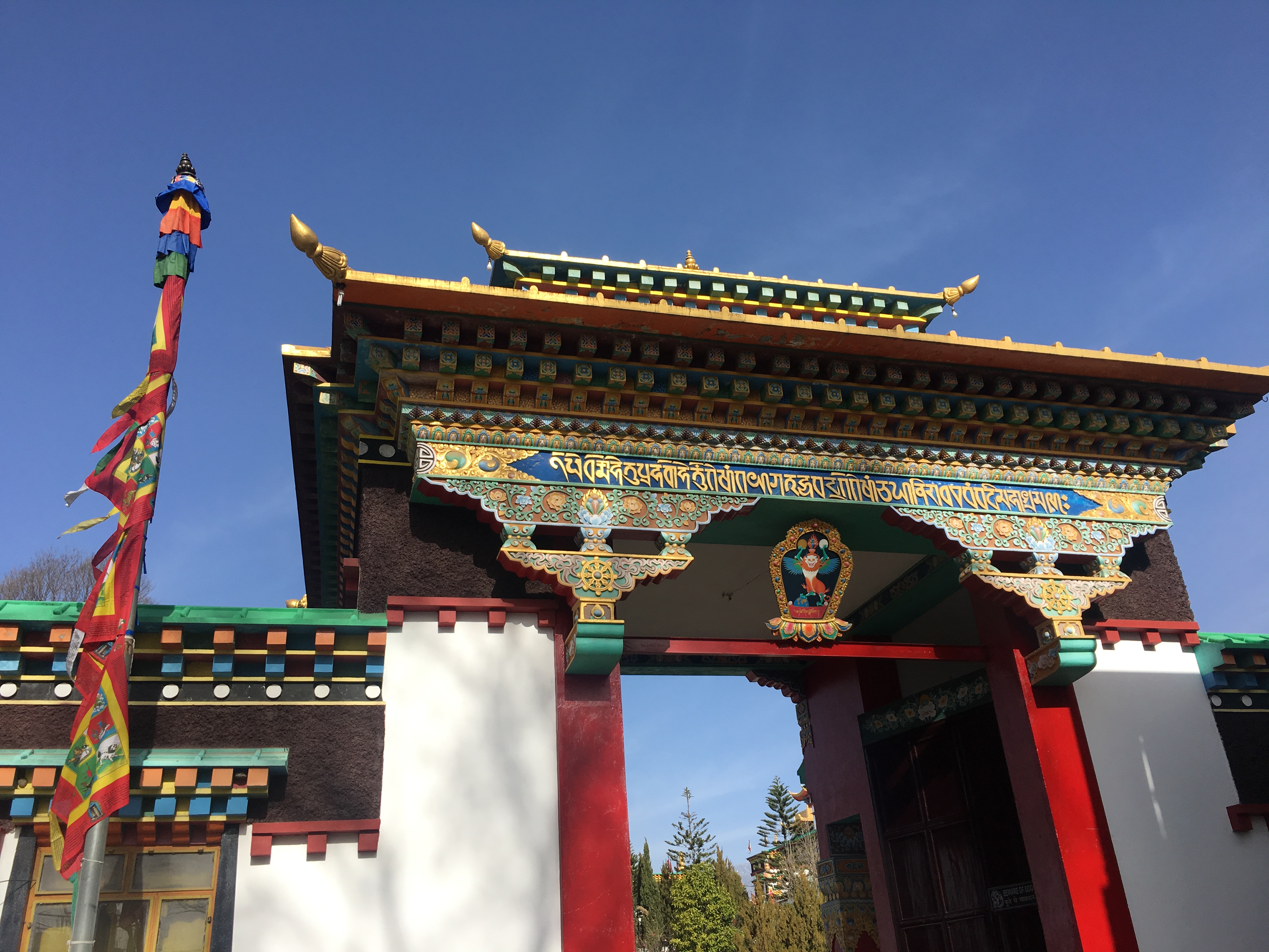 8 white pillars, ornately painted, sit upon red and blue rocks of all sizes, each with gold prayer chants illustrated on them creating a picturesque welcome to the monastery. The expansive courtyard consists of monk’s boarding, set in a semi-circle, facing a massive monastery and a solitary tree with a beautiful golden statue of Lord Buddha beneath it. There is a huge, grand statue of Padmasambhaya in the main hall but unfortunately it was closed when we visited. FYI, the 1999 Hollywood movie called ‘The Cup’ was entirely shot right here – it was about 2 young football-obsessed monks who desperately try to obtain a TV to watch the World Cup Finals in the monastery.