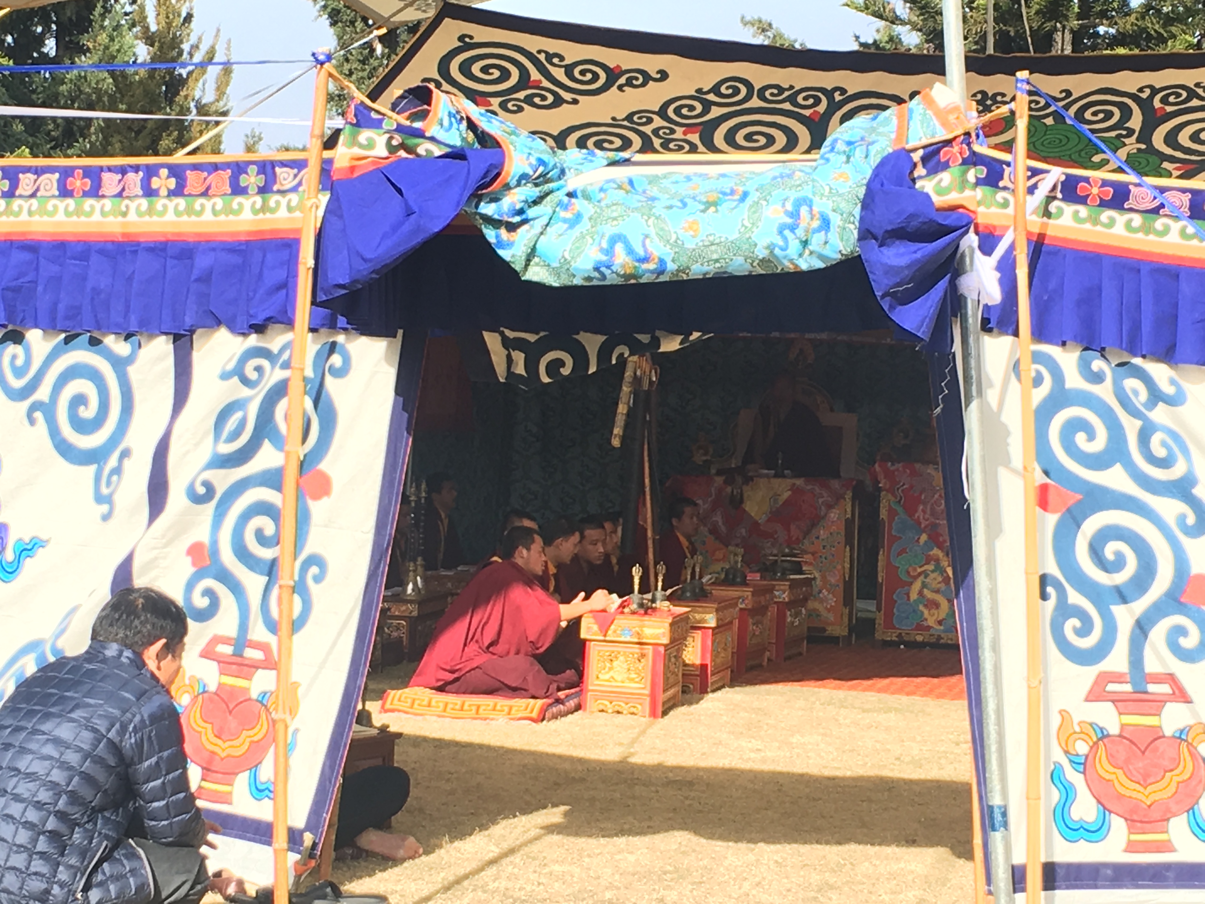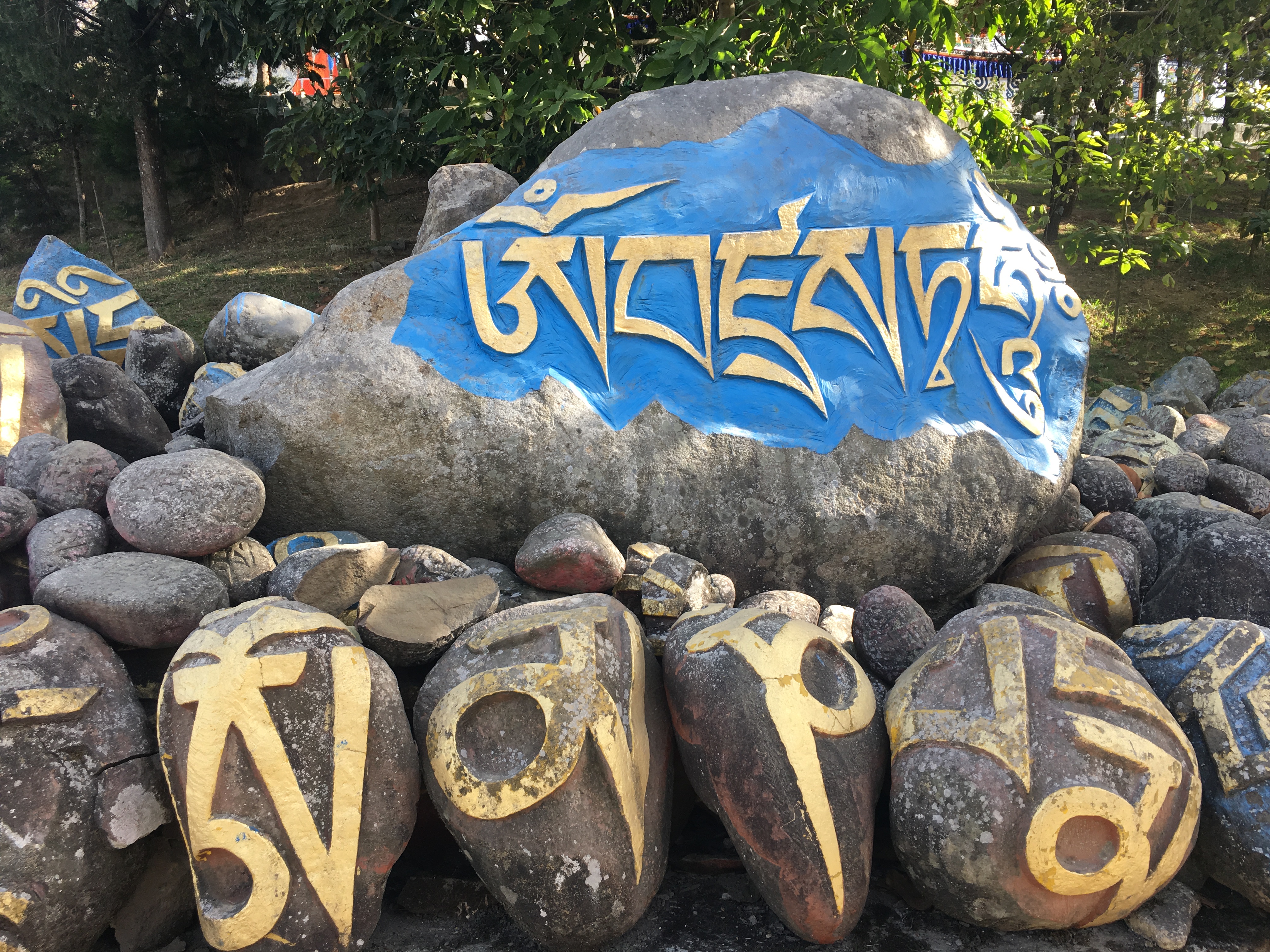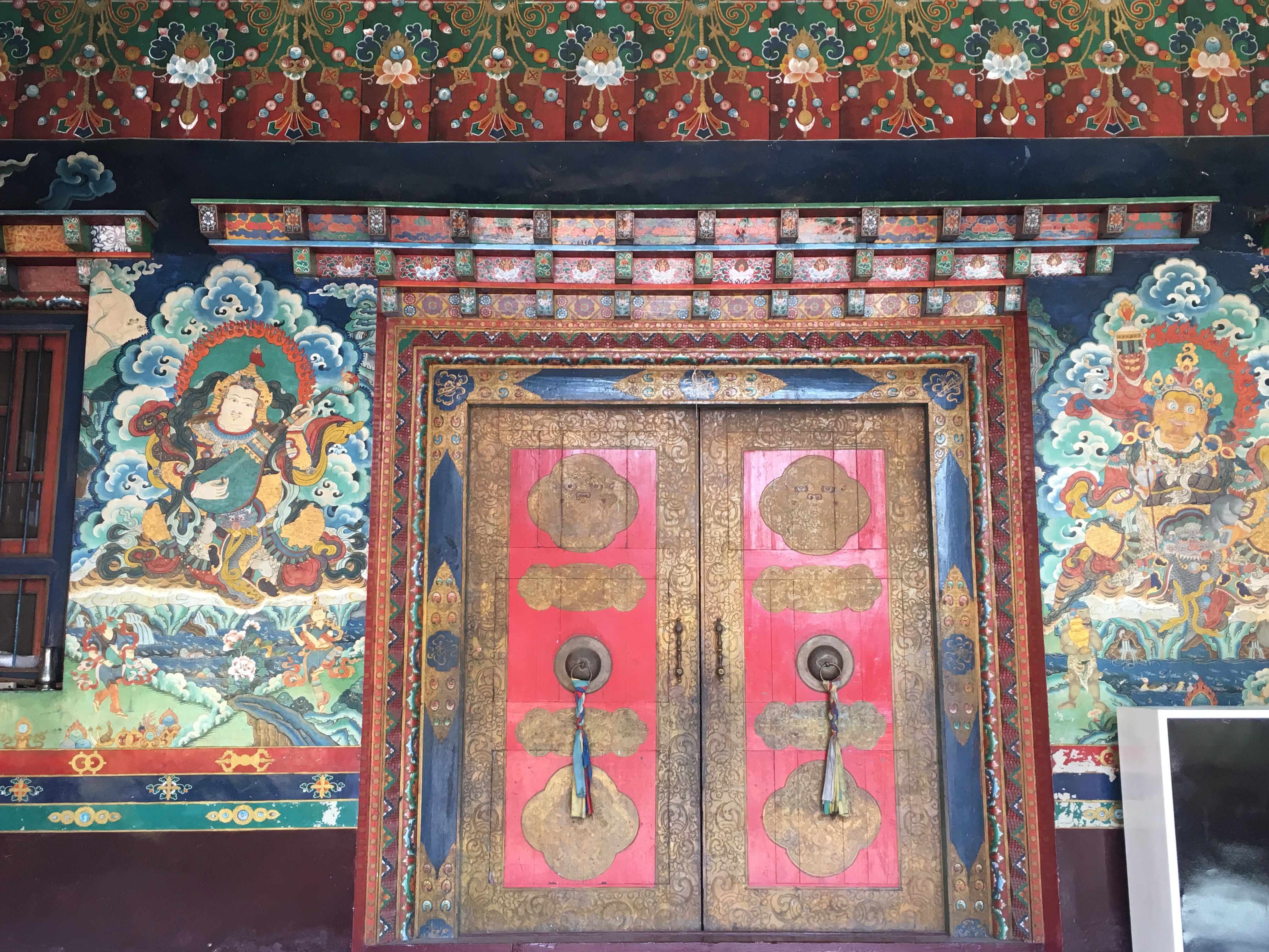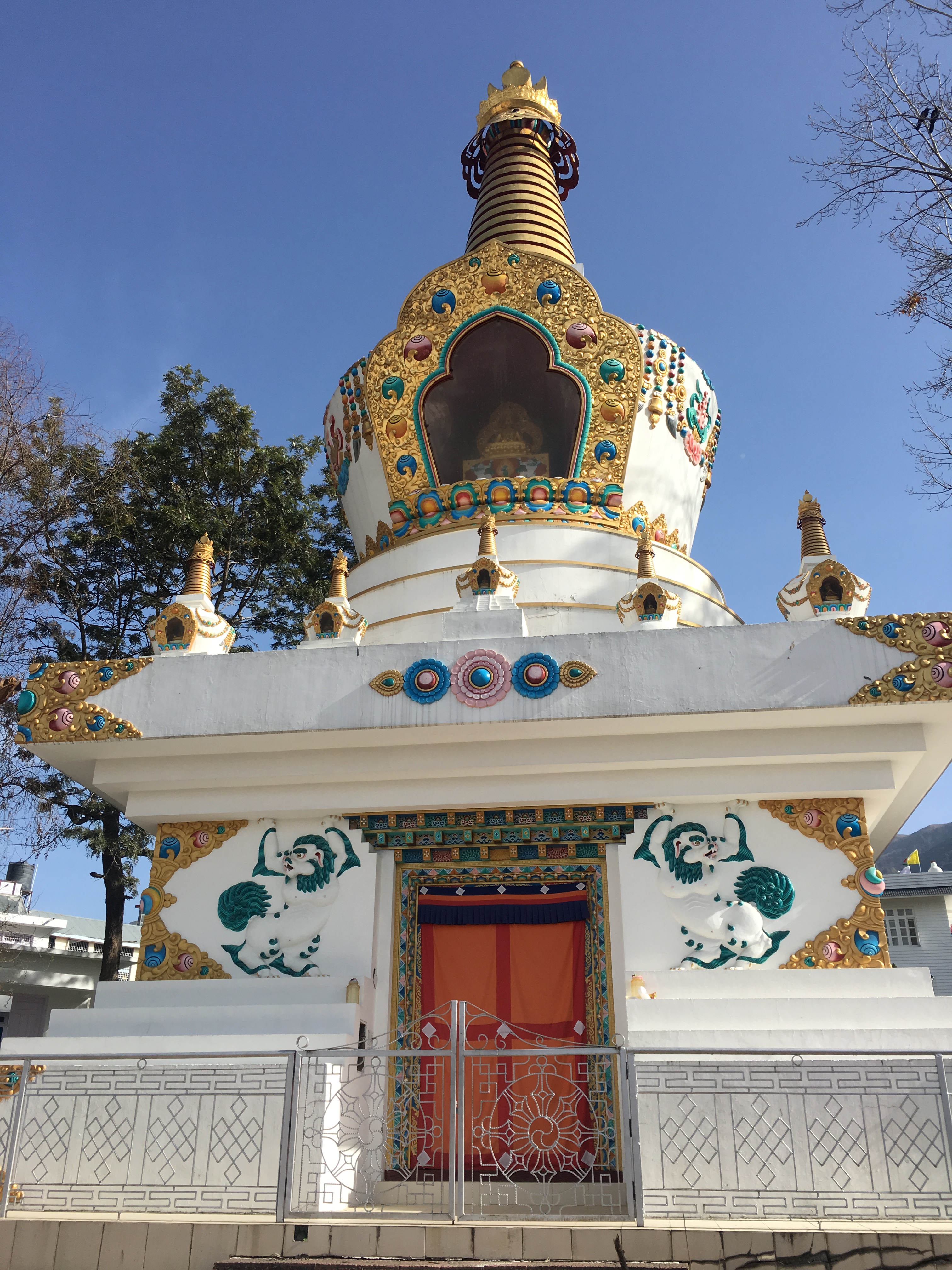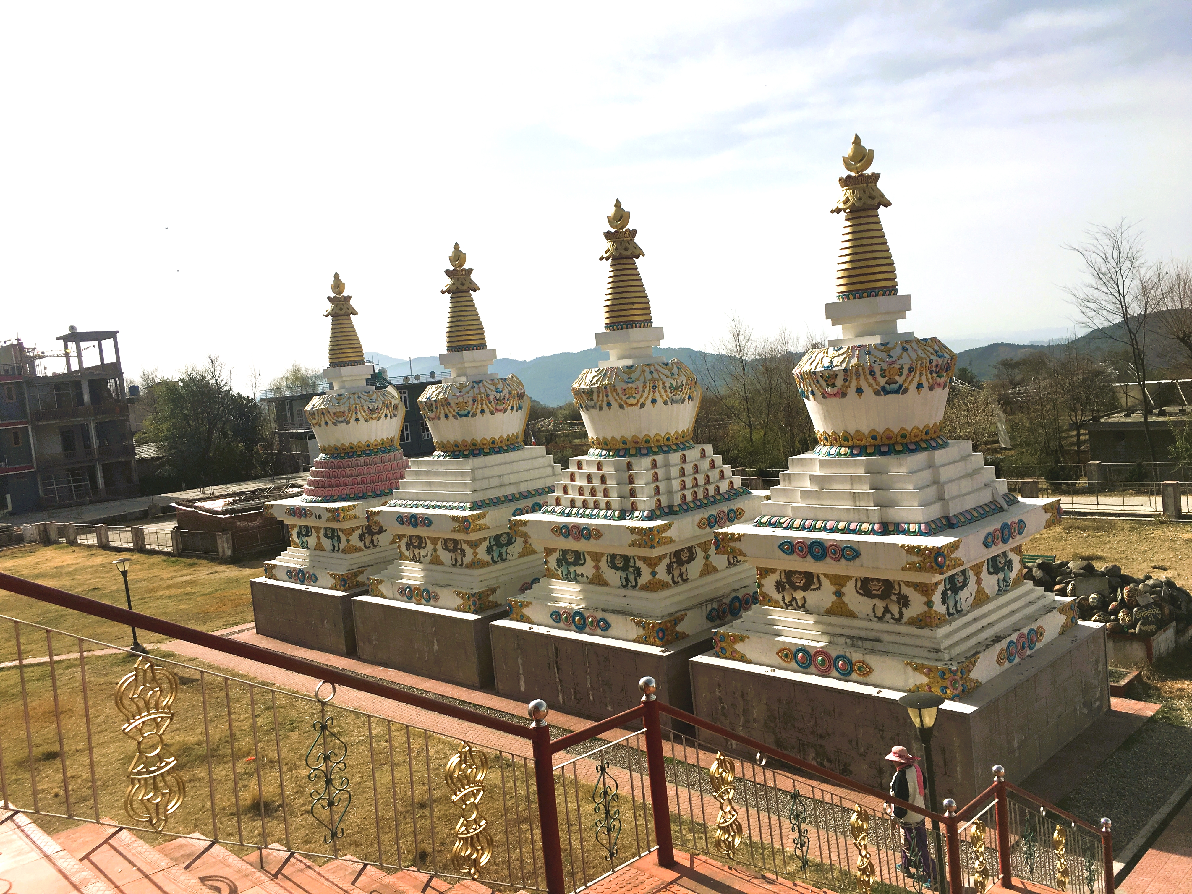 8 white pillars, ornately painted, sit upon red and blue rocks of all sizes, each with gold prayer chants illustrated on them creating a picturesque welcome to the monastery. The expansive courtyard consists of monk’s boarding, set in a semi-circle, facing a massive monastery and a solitary tree with a beautiful golden statue of Lord Buddha beneath it. There is a huge, grand statue of Padmasambhaya in the main hall but unfortunately it was closed when we visited. FYI, the 1999 Hollywood movie called ‘The Cup’ was entirely shot right here – it was about 2 young football-obsessed monks who desperately try to obtain a TV to watch the World Cup Finals in the monastery.