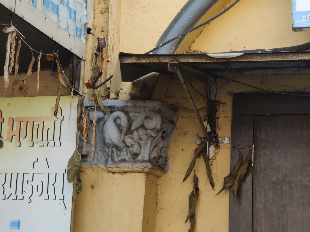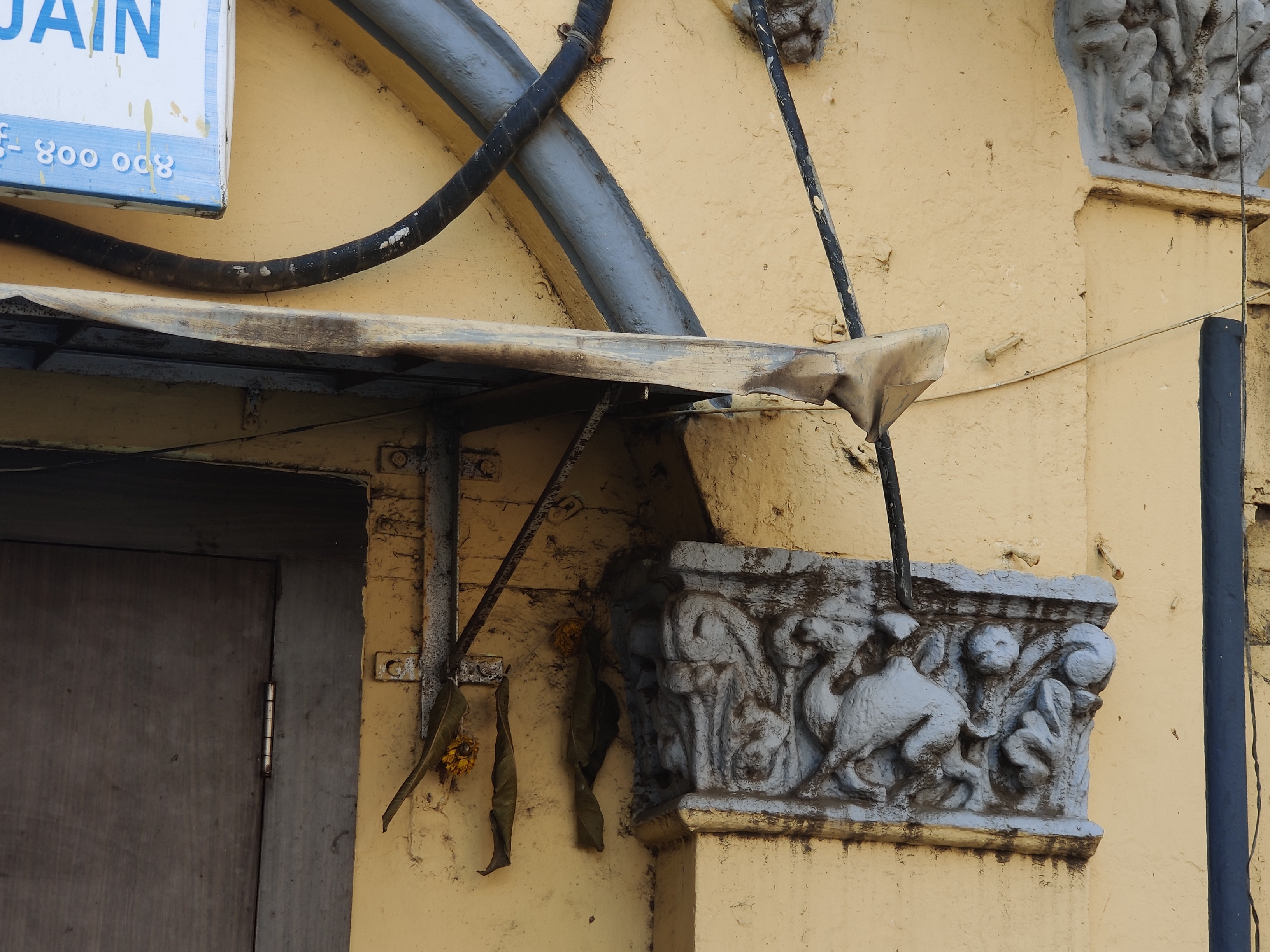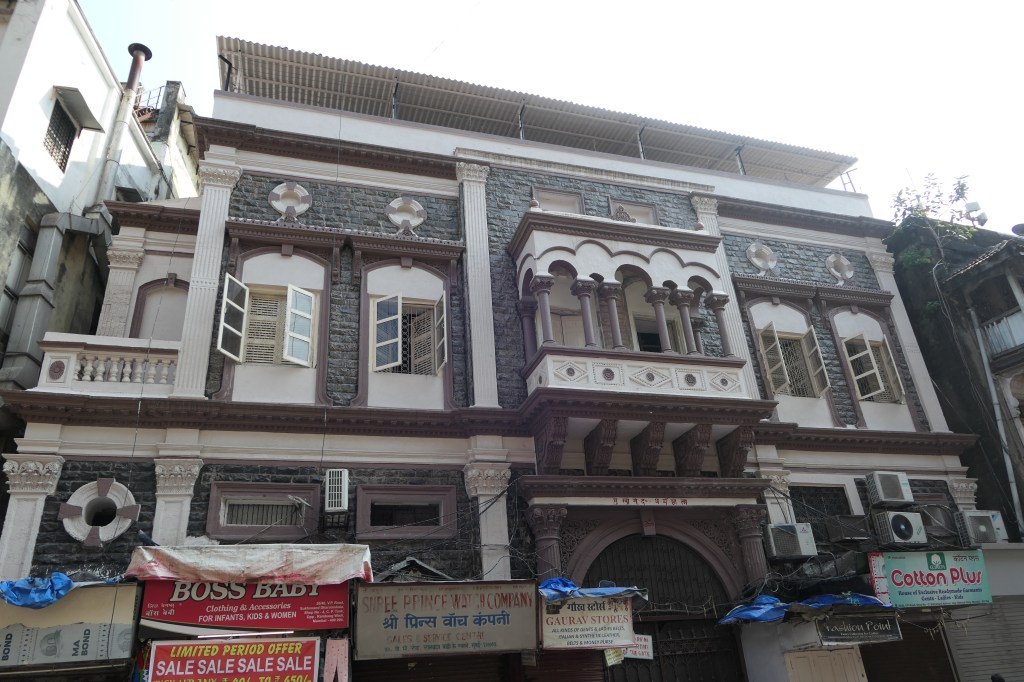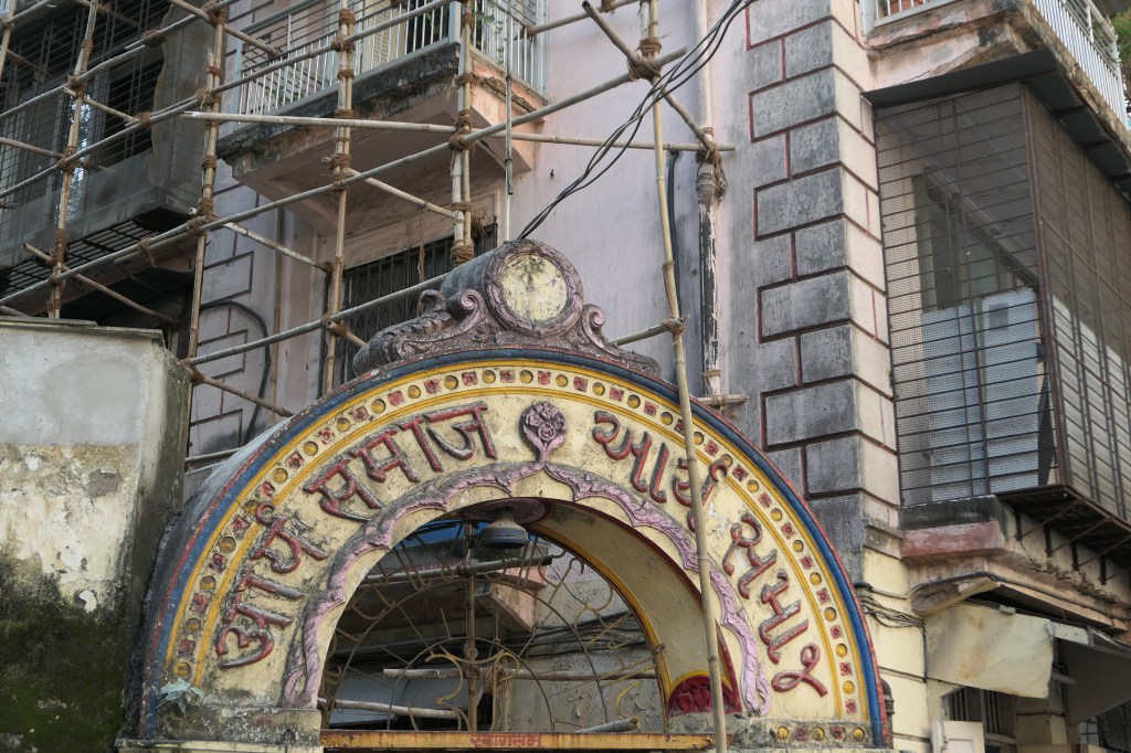 From animal refugee centre, next stop is the human refugee centre. Ok, refugee is a strong word here in this context. Built in the early-20th century, along the busy Vithalbhai Patel Road in the market areas of Bhuleshwar area, the haveli-style Sukhanand Dharmashala offers cheap shelter to individuals who used to venture into the promiseland of Mumbai for medical reasons. Architects and heritage enthusiasts identify the building as Grade III “Baroque revival grey stone” building designed in the “hybrid Colonial style of architecture”. The façade uses a combination of elements – semi-circular arches, segmental, round and rectangular fenestrations as well as a colonnaded projecting balcony supported by carved stone brackets as the showpiece of the main façade, over the grand entrance archway. The entrance archway is flanked on either side by decorative columns and decorative carvings within the spandrels of the arch.