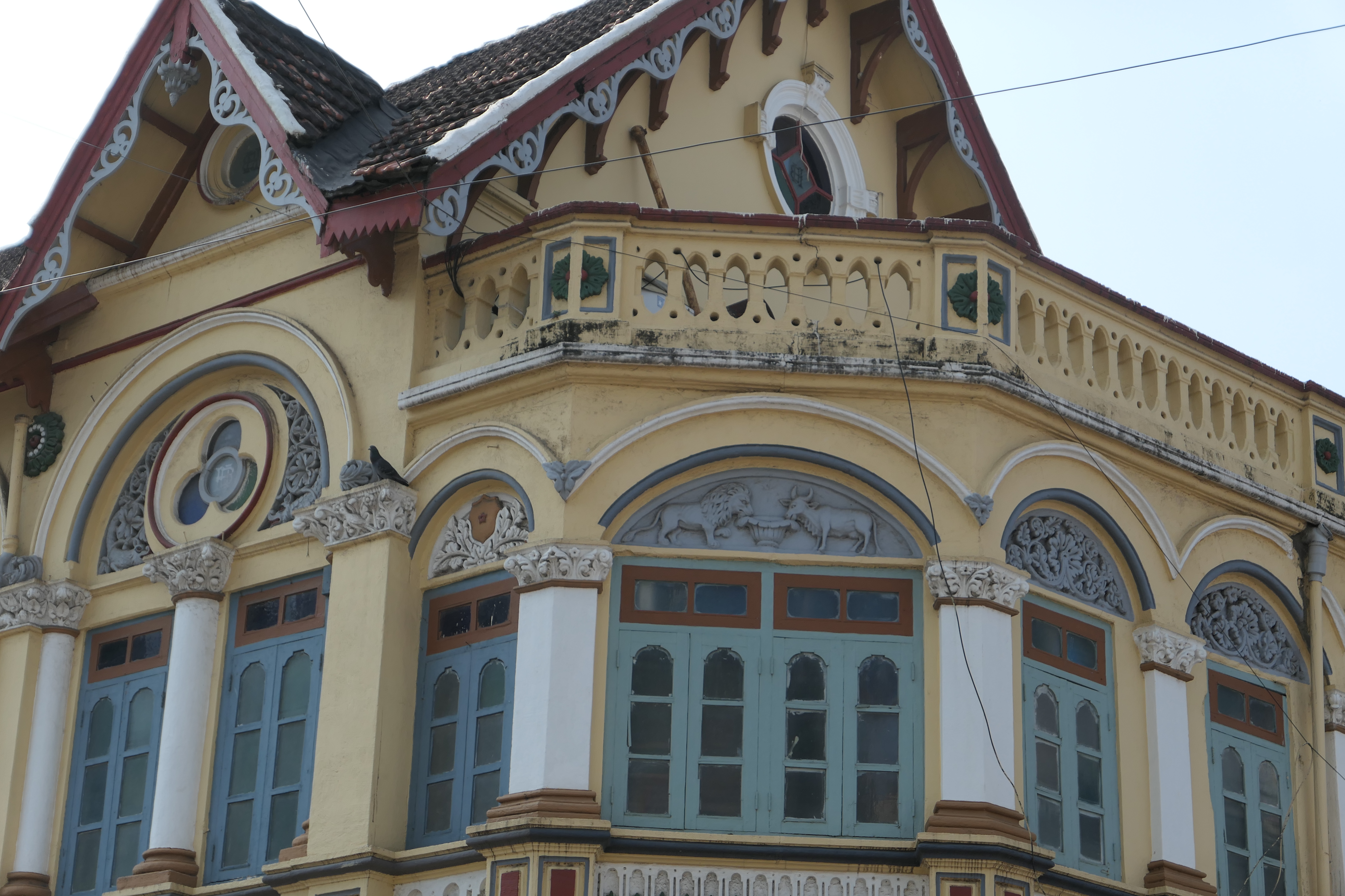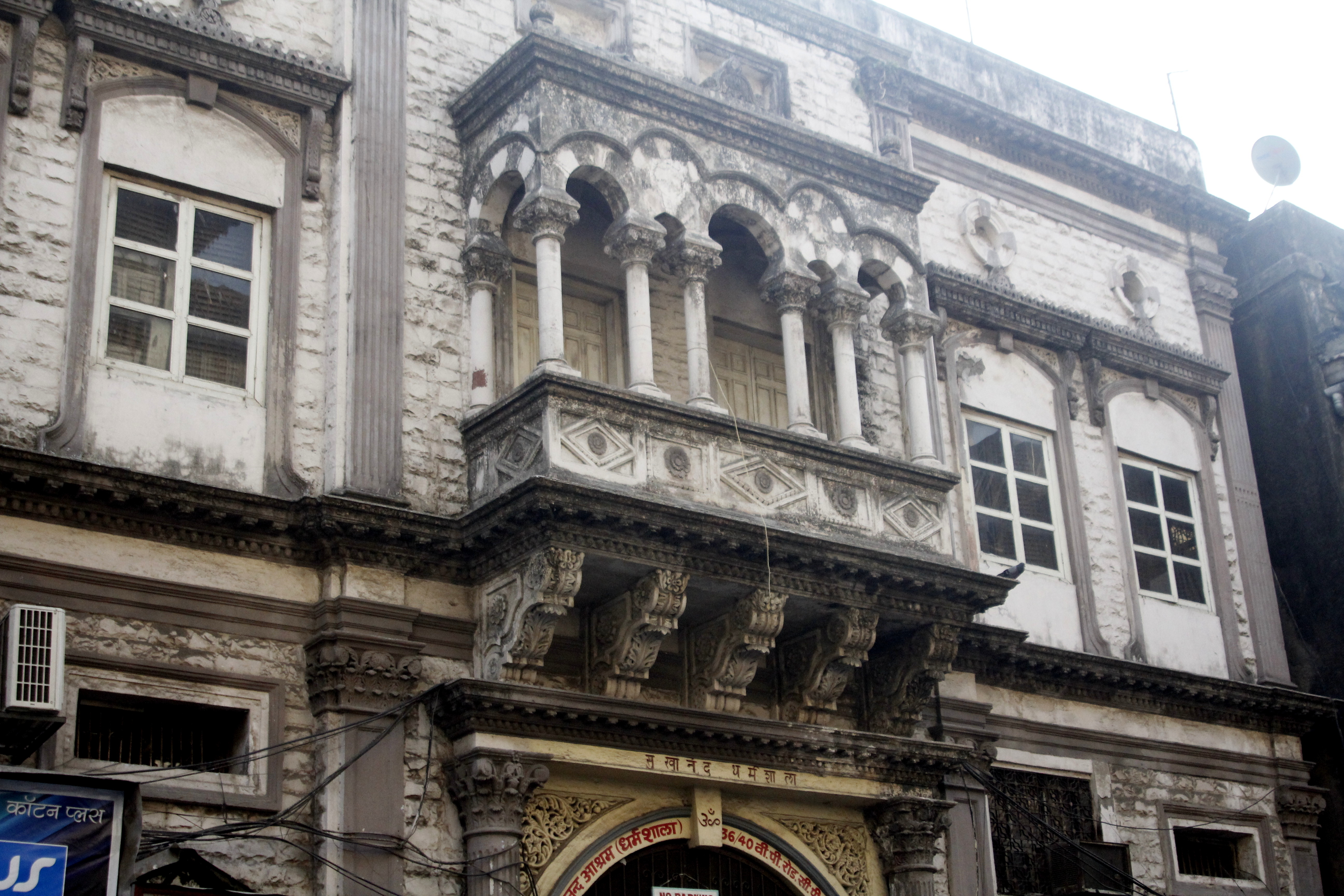 This ground-plus-one structure has a footprint that is larger than the bookstore that also published Premchand’s Godaan. The Gothic facade of this building has Western ornamentation such as trefoils (a raised outline of a three-lobed leaf) and finials (slender, carved projections crowning the apices of its roofs). Numerous brackets at doorways boasts of animal motifs, while the lion and cow etched within the arch of Hira Baug, a Jain dharamshala, provides a glimpse to the Jain philosophy of ‘live and let live’.