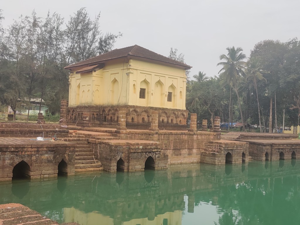 Safa masjid, the oldest mosque of Goa, stands true to testament of time and a tumultous history. Built by Ibrahim Adil Shah II in 1560 at Ponda, the mosque is unique to say the least, truly justifying its name ‘safa’ which means pure in arabic. The single chambered mosque has a modest prayer room and an olden style terracotta roof. The overall structural framework is very atypical to normal mosque architecture, and gives a very distinct impression of a 16th century Portuguese home. Maybe that’s the reason why the mosque survived the Goa Inquisition? Who knows! However, the star attraction of Safa Masjid is the huge laterite stone masonry tank with turquoise waters that is located within the mosque complex. The tank has over 40 hammams built in Mihrab style of architecture.