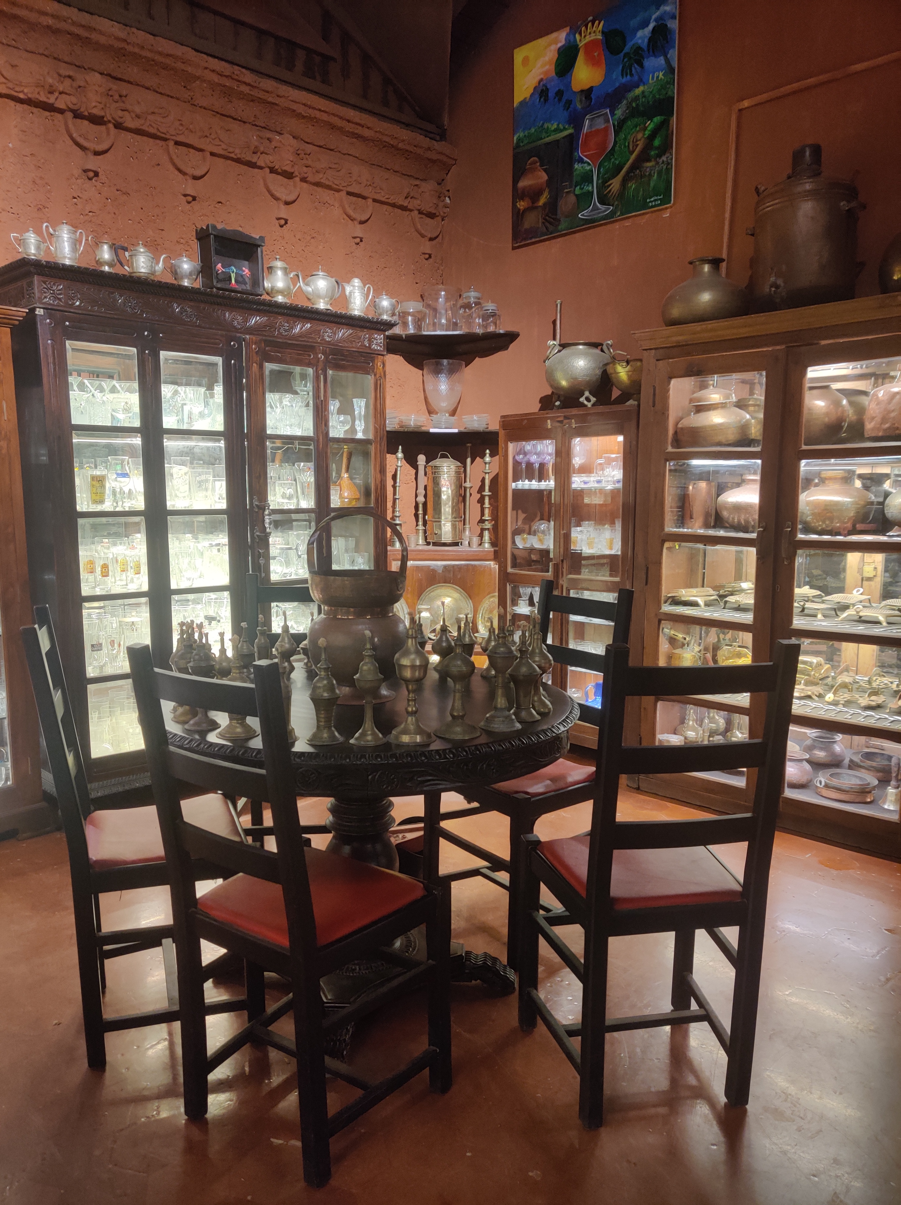 Inside the museum, there are ancient garrafãos and mud pots that were used to store and rest feni, an antique alcohol shot dispenser, a sugarcane crusher for cocktails, glass pint holders for long journeys, chalices, snifters, inclined wine glasses, the world’s tallest shot glass made in Poland, a Queen Elizabeth II coronation glass with gold work, and crystal glasses that give out the most melodious ring when clinked, silver water pots, corkscrew juicers, mixers, jiggers and innumerable other alcohol paraphernalia.