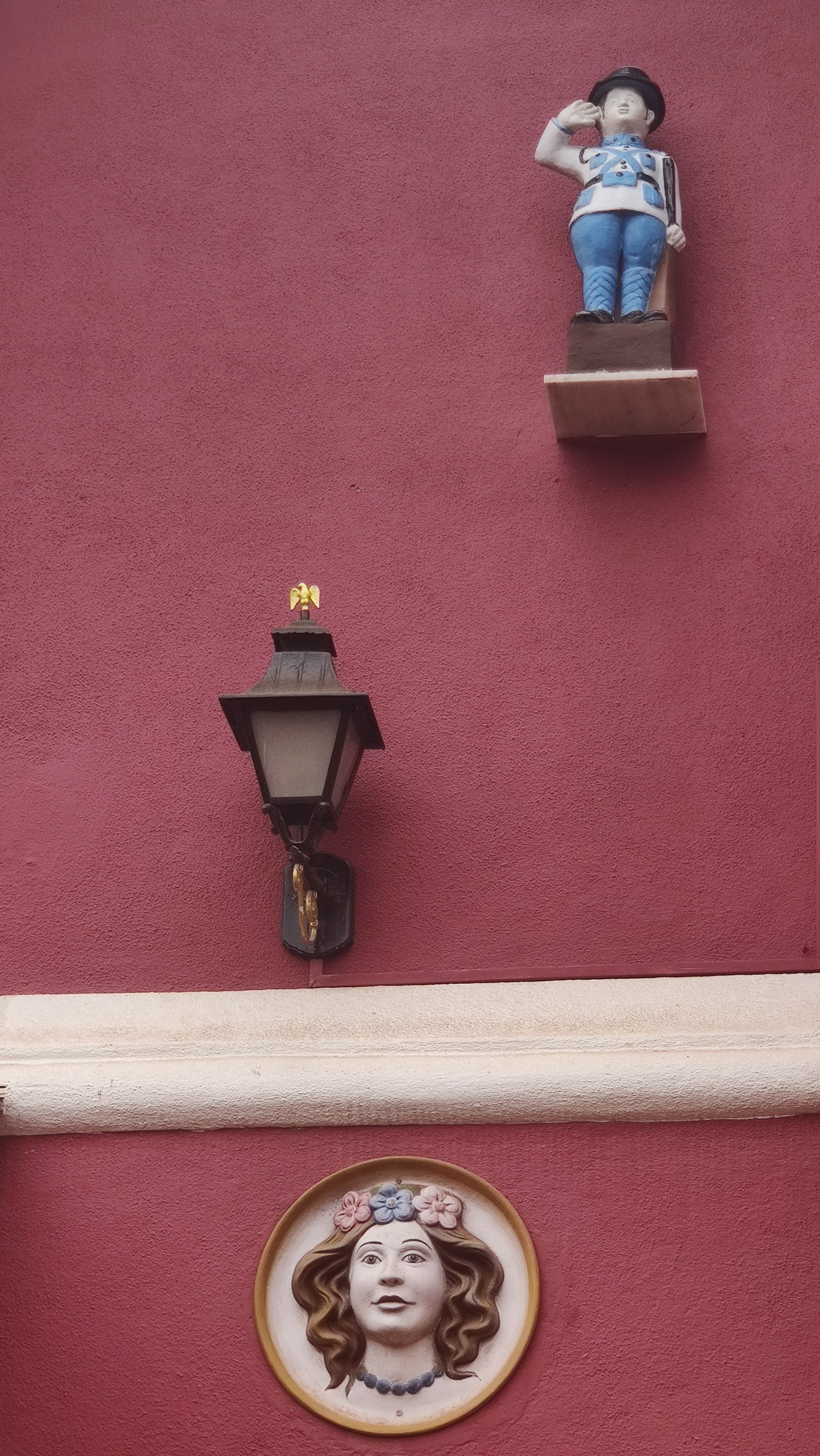 Another Portuguese symbol that is often seen at the houses of Fontainhas is the soldado (soldier). The soldados were an important part of the society and a figurative portrayal of a protector. It is said that presence of a mid-salute soldier denotes that one of the family members were part of the Portuguese army. It also represents the social status of the house owner.