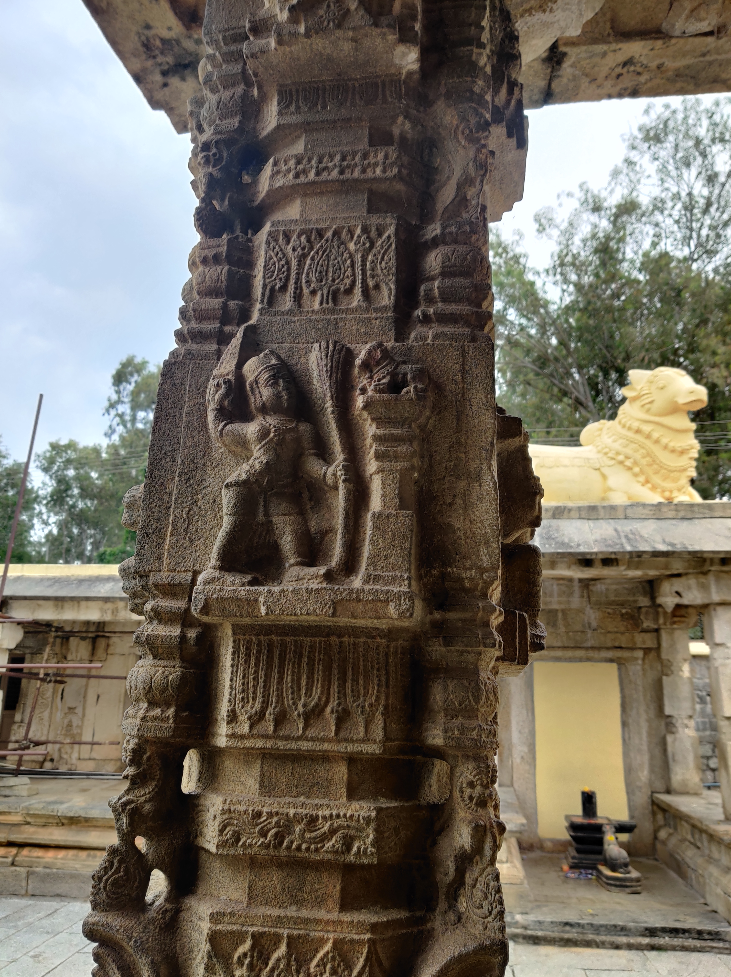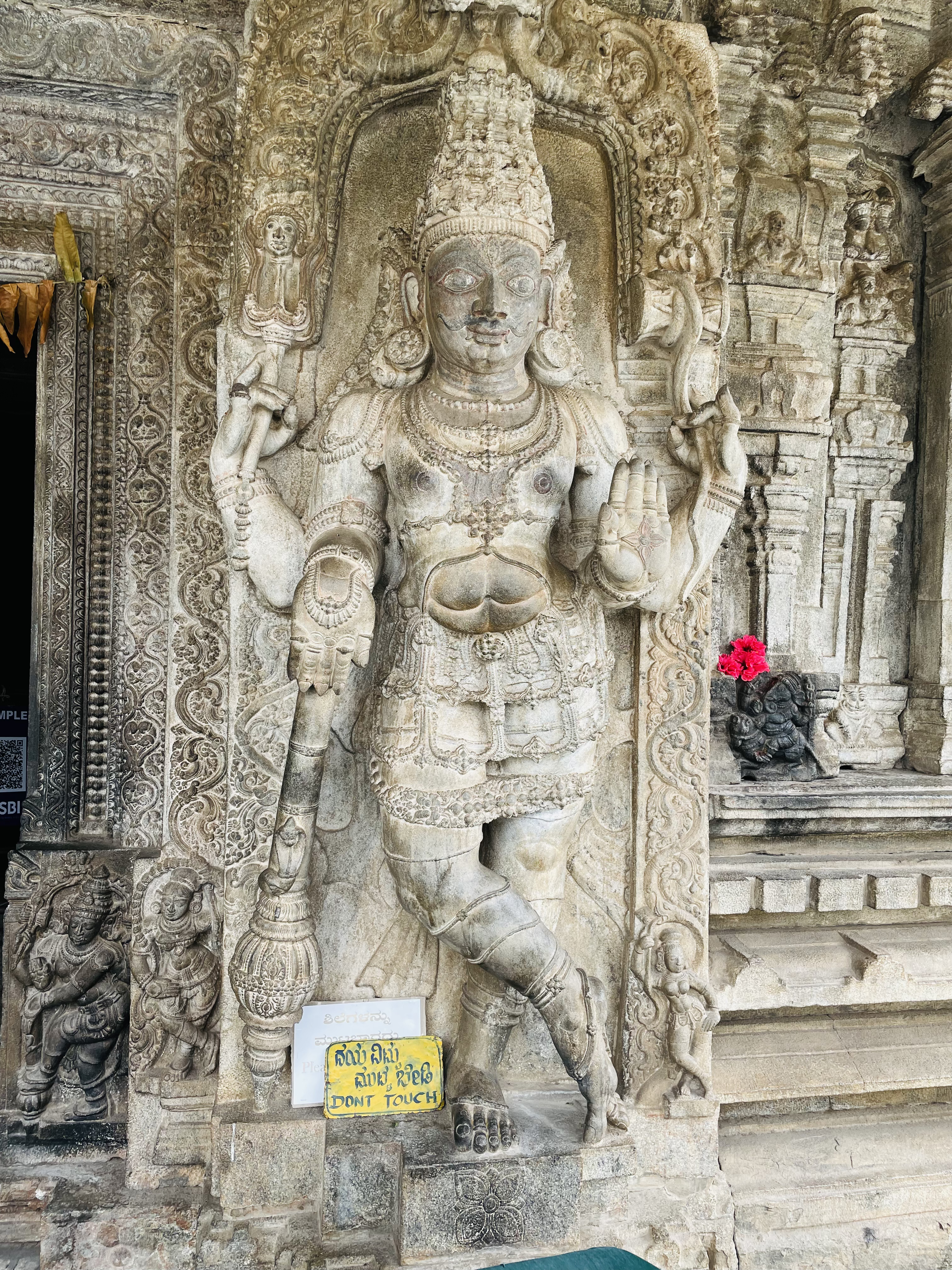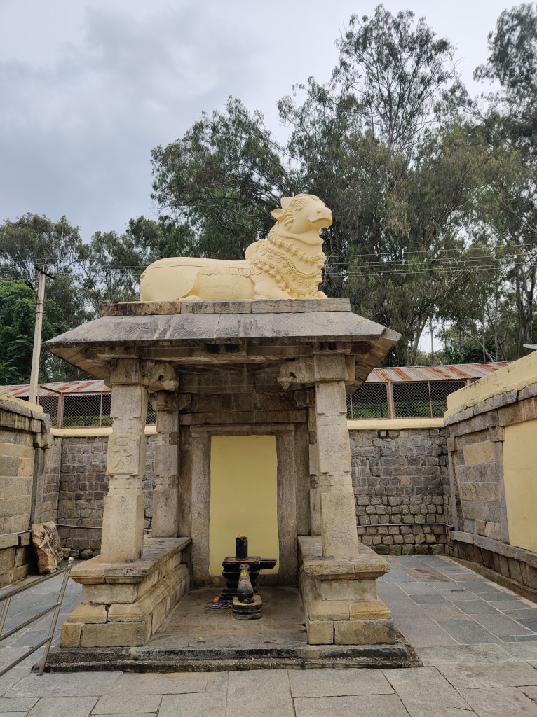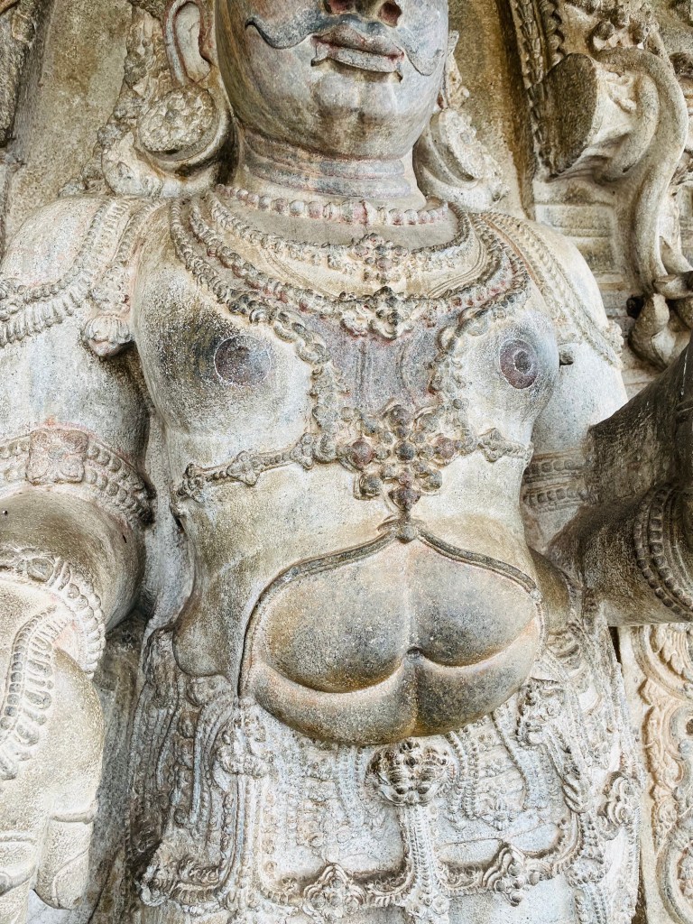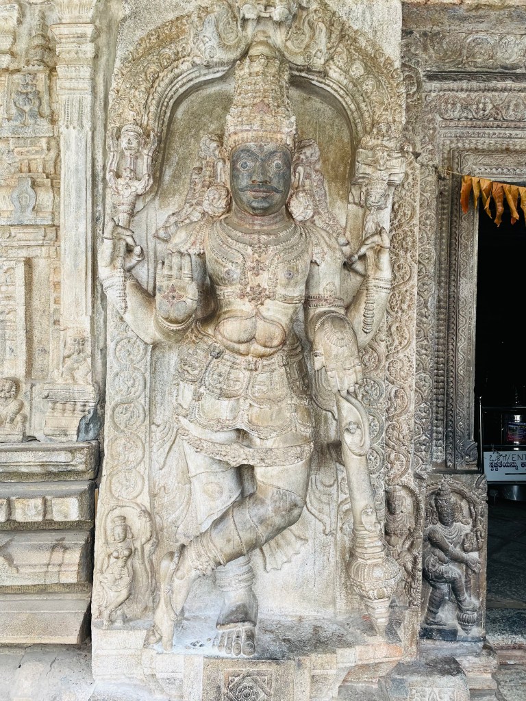 Despite the dusty landscape, we hired a tour guide who shared some intriguing anecdotes beyond the excavation tales. The Vaideshwar Temple stands out as the largest and most well-preserved among the shrines here, showcasing a blend of Ganga-Chola-Hoysala architectural styles. According to a popular story recounted by the priest, the temple’s idol represents Lord Shiva in a form wounded by two hunters named Tala and Kada, after whom Talakadu is named, who inadvertently aimed at the deity. It’s believed that Shiva healed himself using sandalwood paste, earning him the name Vaidyanatha, with “Vaidya” meaning doctor in Sanskrit. Hence, the idol is always adorned with a patch of sandalwood paste. Additionally, the faces of the 10-foot-tall Dwarapalakas flanking the temple entrance depict the navarasa forms Rudra (anger) and Shantha (peace), while the area around their bellies resembles a bull’s face, possibly symbolizing the story of the two hunters, Tala and Kadu.