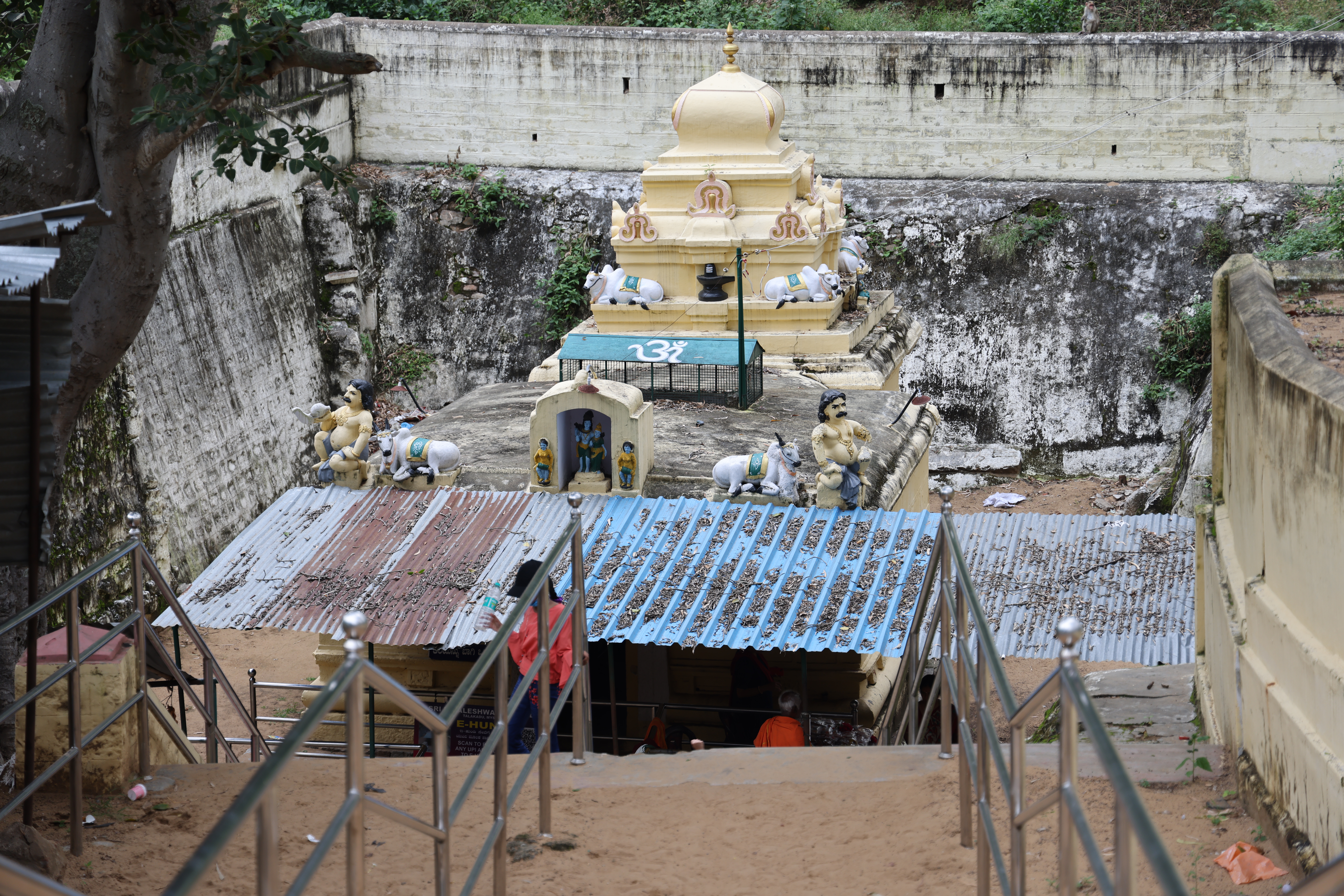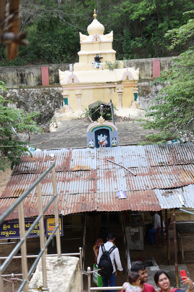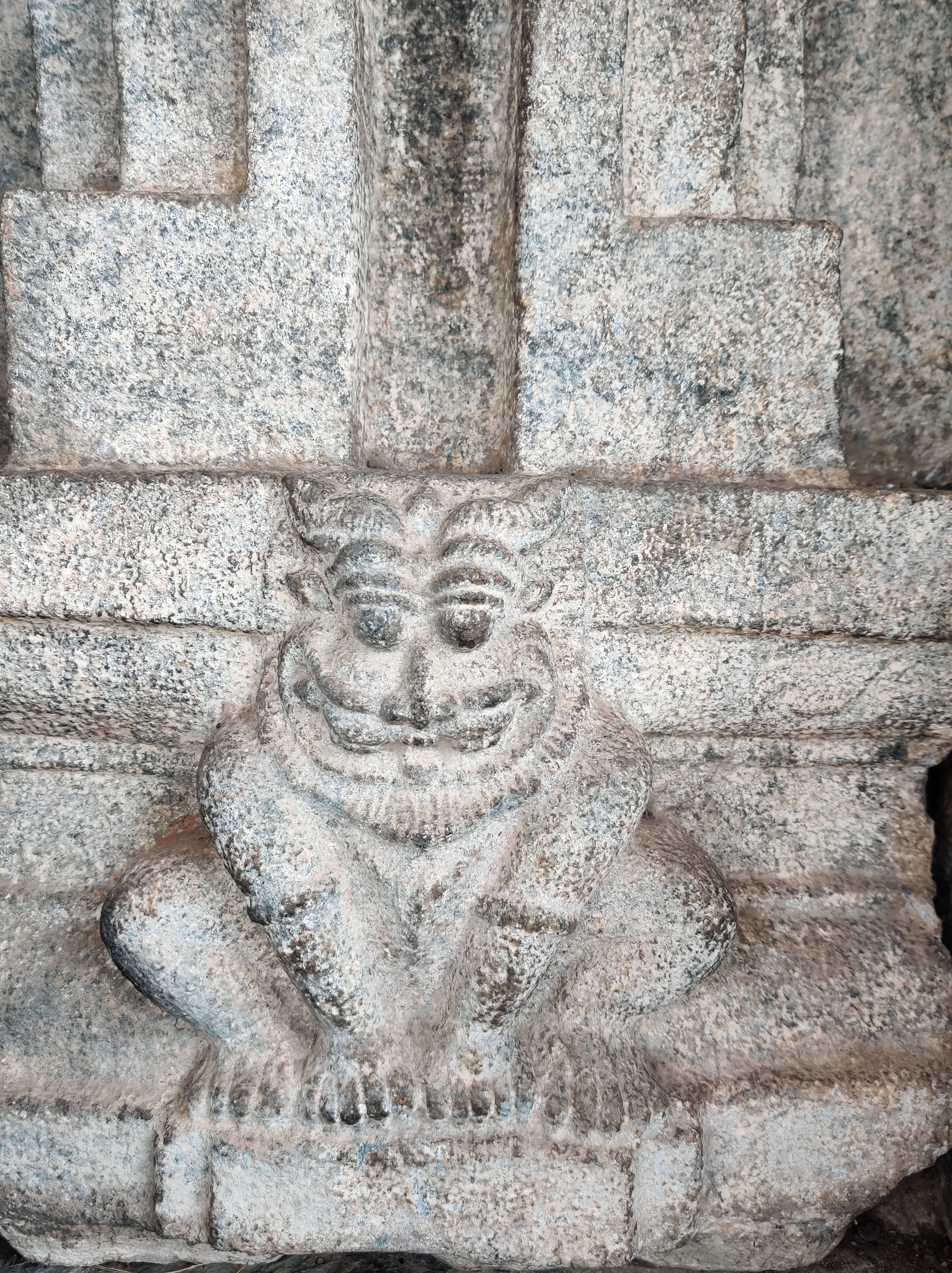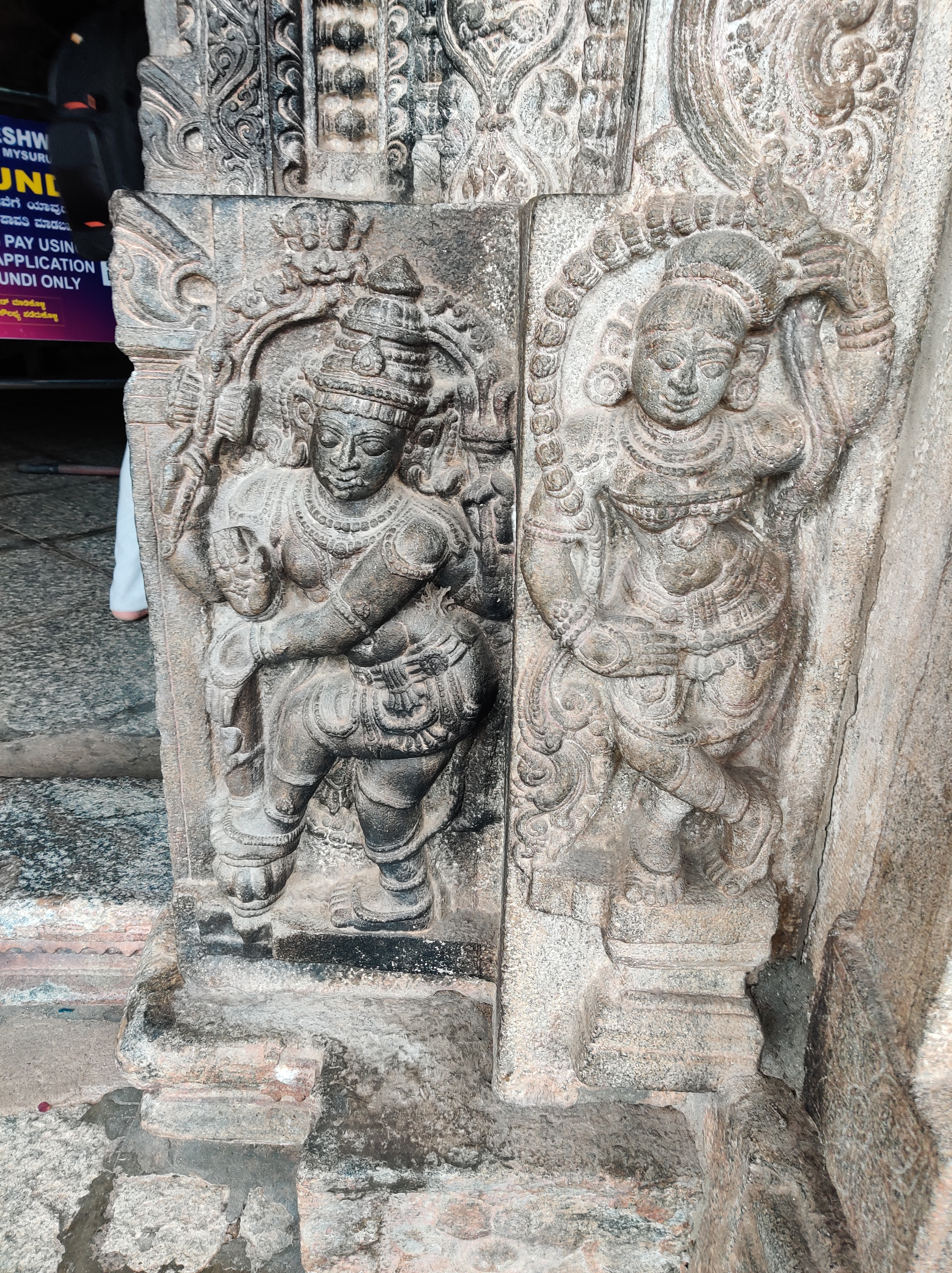Despite the dusty landscape, we hired a tour guide who shared some intriguing anecdotes beyond the excavation tales. The Vaideshwar Temple stands out as the largest and most well-preserved among the shrines here, showcasing a blend of Ganga-Chola-Hoysala architectural styles. According to a popular story recounted by the priest, the temple’s idol represents Lord Shiva in a form wounded by two hunters named Tala and Kada, after whom Talakadu is named, who inadvertently aimed at the deity. It’s believed that Shiva healed himself using sandalwood paste, earning him the name Vaidyanatha, with “Vaidya” meaning doctor in Sanskrit. Hence, the idol is always adorned with a patch of sandalwood paste. Additionally, the faces of the 10-foot-tall Dwarapalakas flanking the temple entrance depict the navarasa forms Rudra (anger) and Shantha (peace), while the area around their bellies resembles a bull’s face, possibly symbolizing the story of the two hunters, Tala and Kadu.