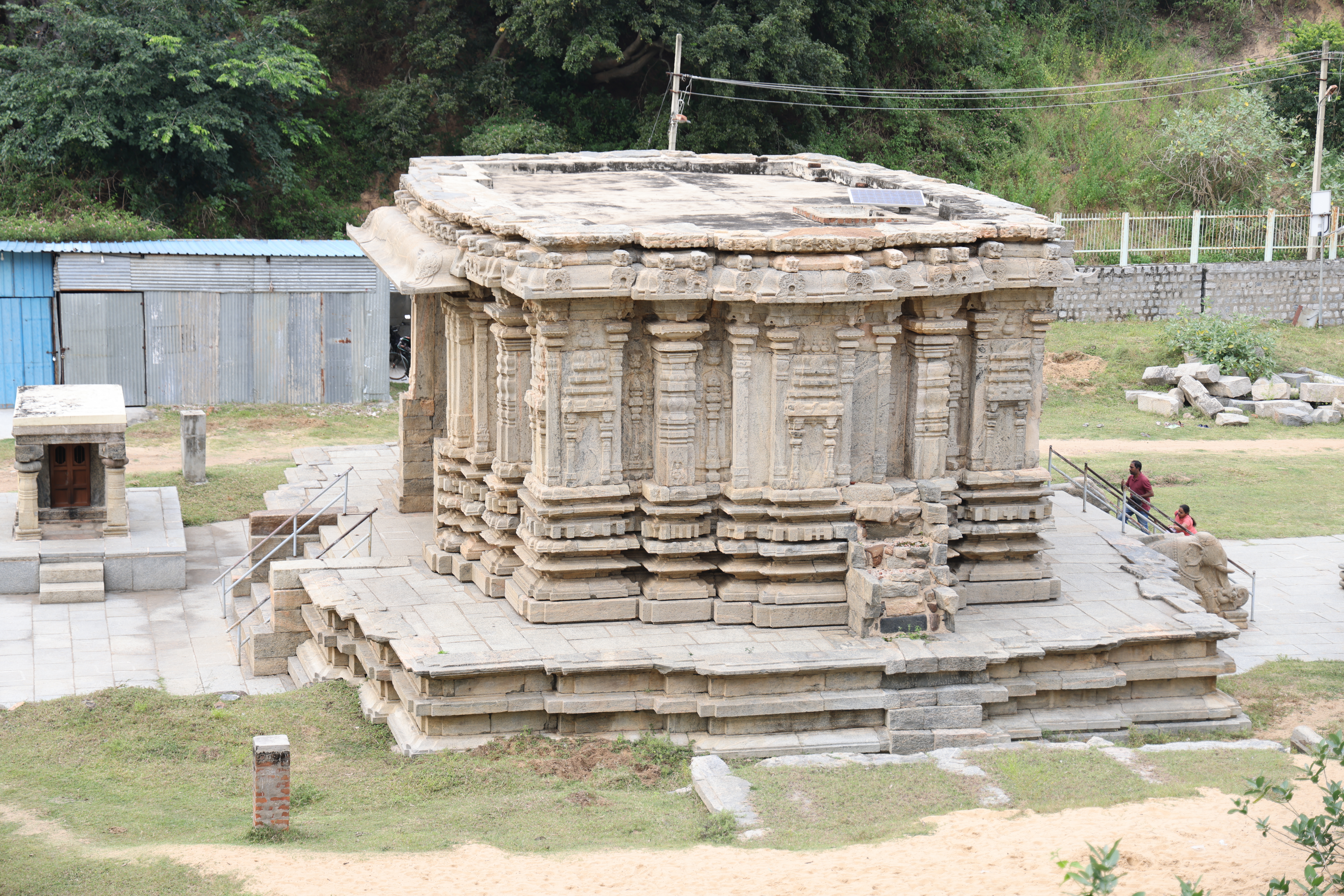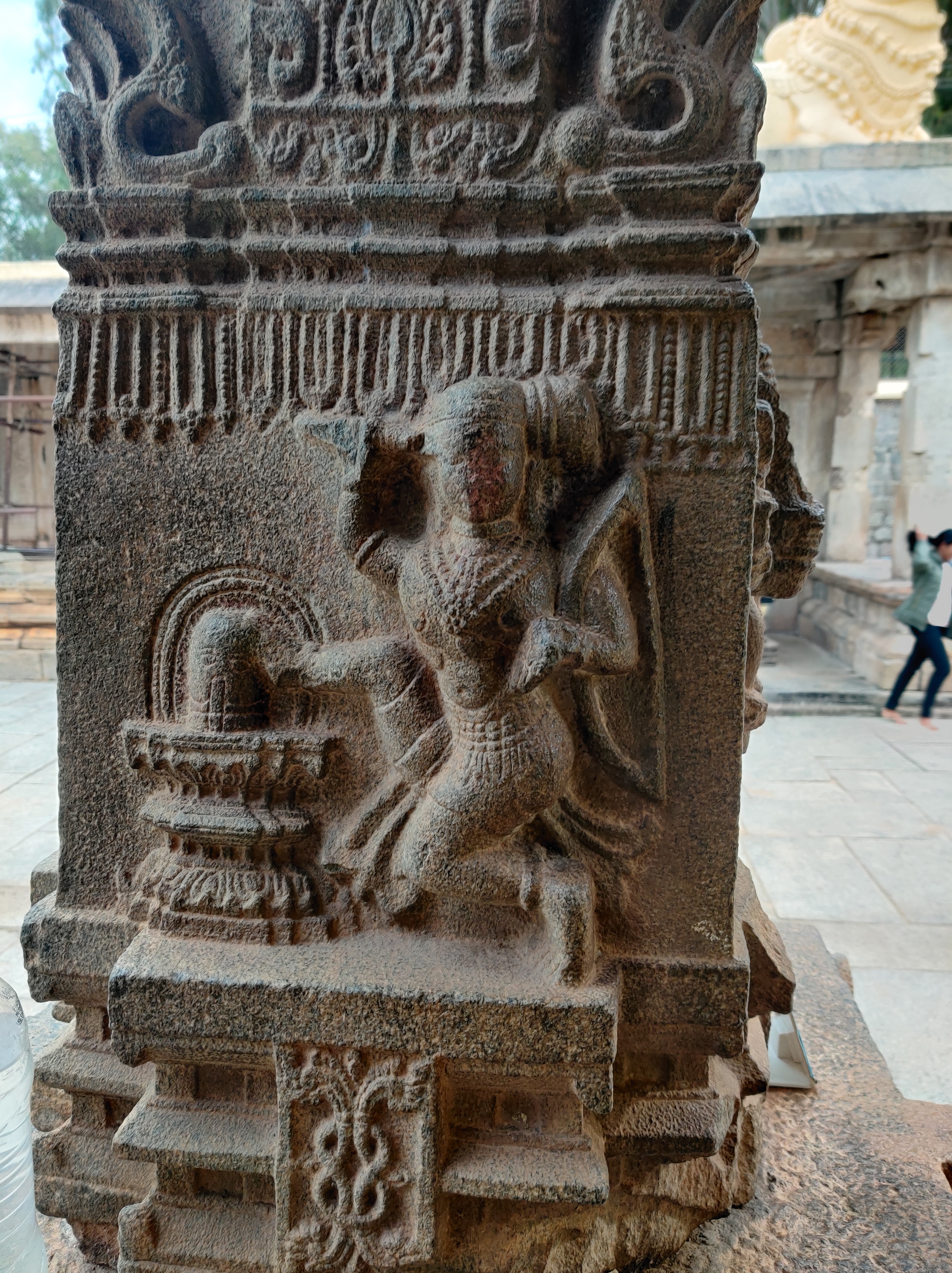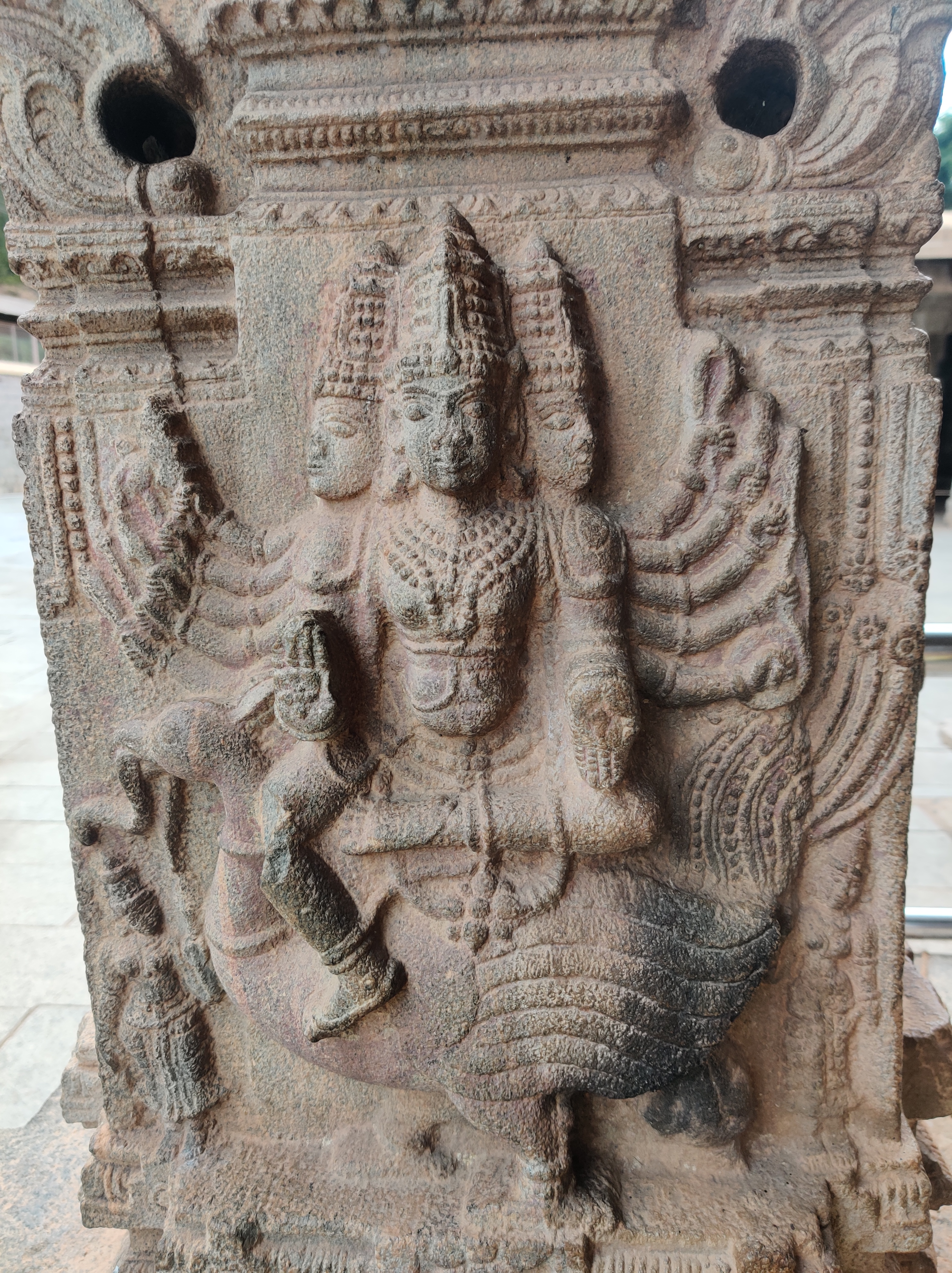 Among the other four Panchalingas, Pataleswara and Maraleswara temples lie surrounded by sand dunes. The Kirti Narayana temple, positioned 20 feet below, forms a sizable complex. Interestingly, the grand entrance of the temple reminded me of Hampi’s famous rock chariot, perhaps hinting at a connection to the Vijayanagara dynasty?! However, complex histories often get lost in translation! Honestly, by the time we reached this temple, especially after trekking through sand mounds, my patience for further exploration had waned. Nevertheless, it’s said that the shrine houses an 8-foot-tall statue of Kirti Narayana, depicting Vishnu in a unique representation.