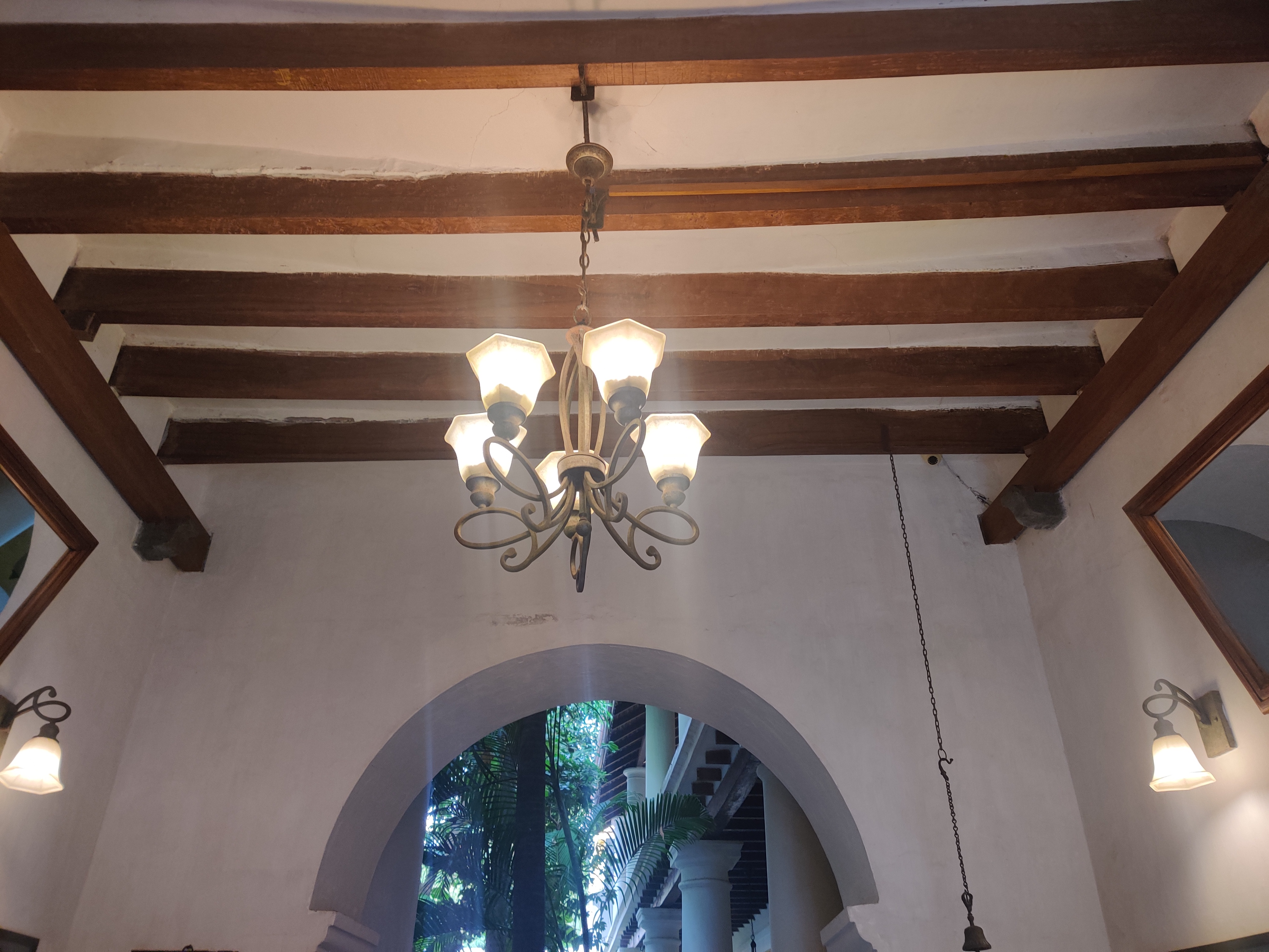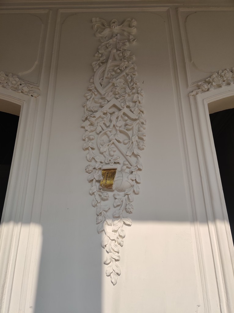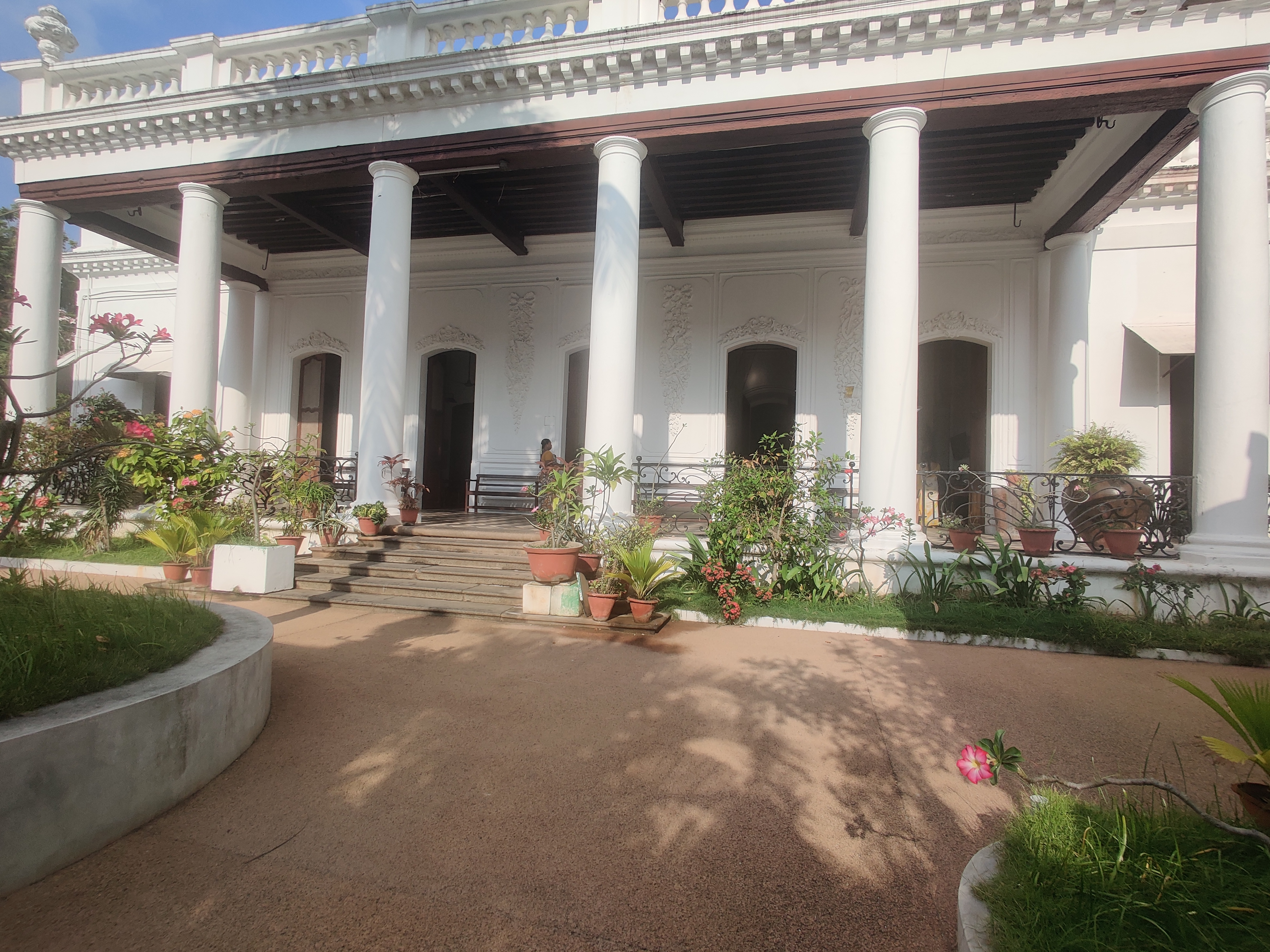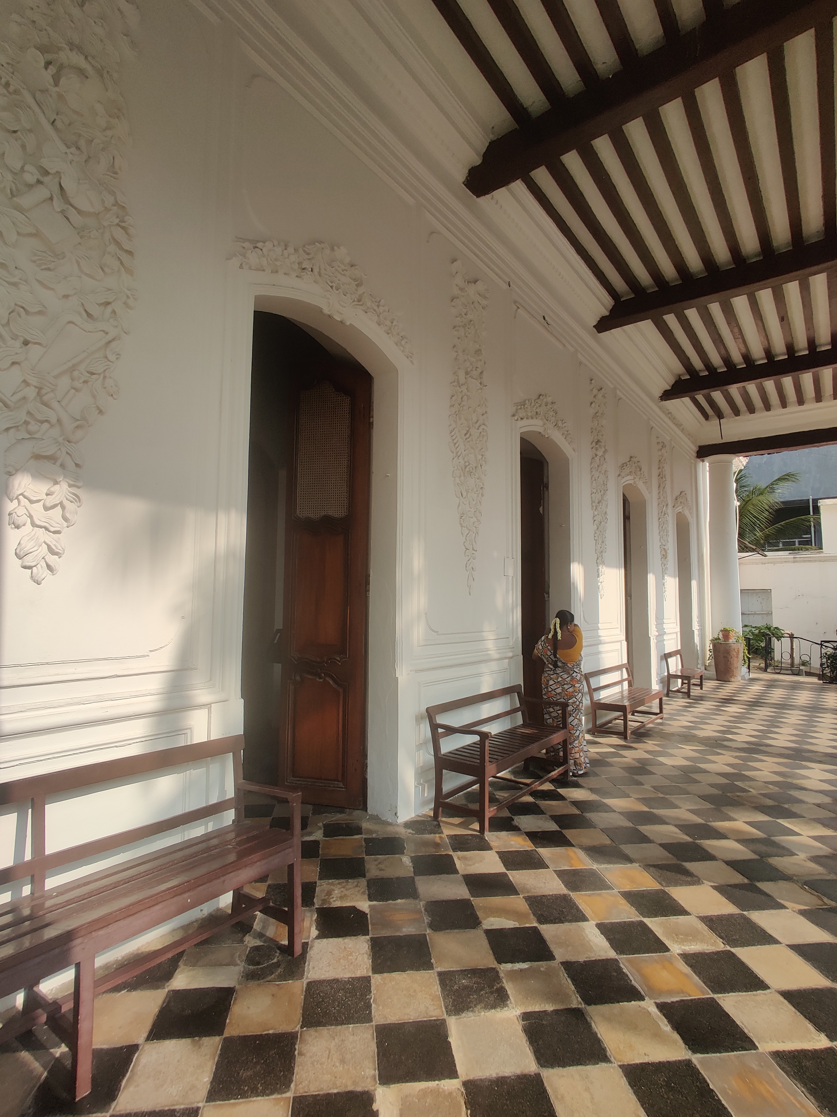 It boasts 12 foot tall arched doors, a wide portico overlooking a beautiful garden, and walls decorated with motifs, each of which symbolizes a unique contribution from the French.