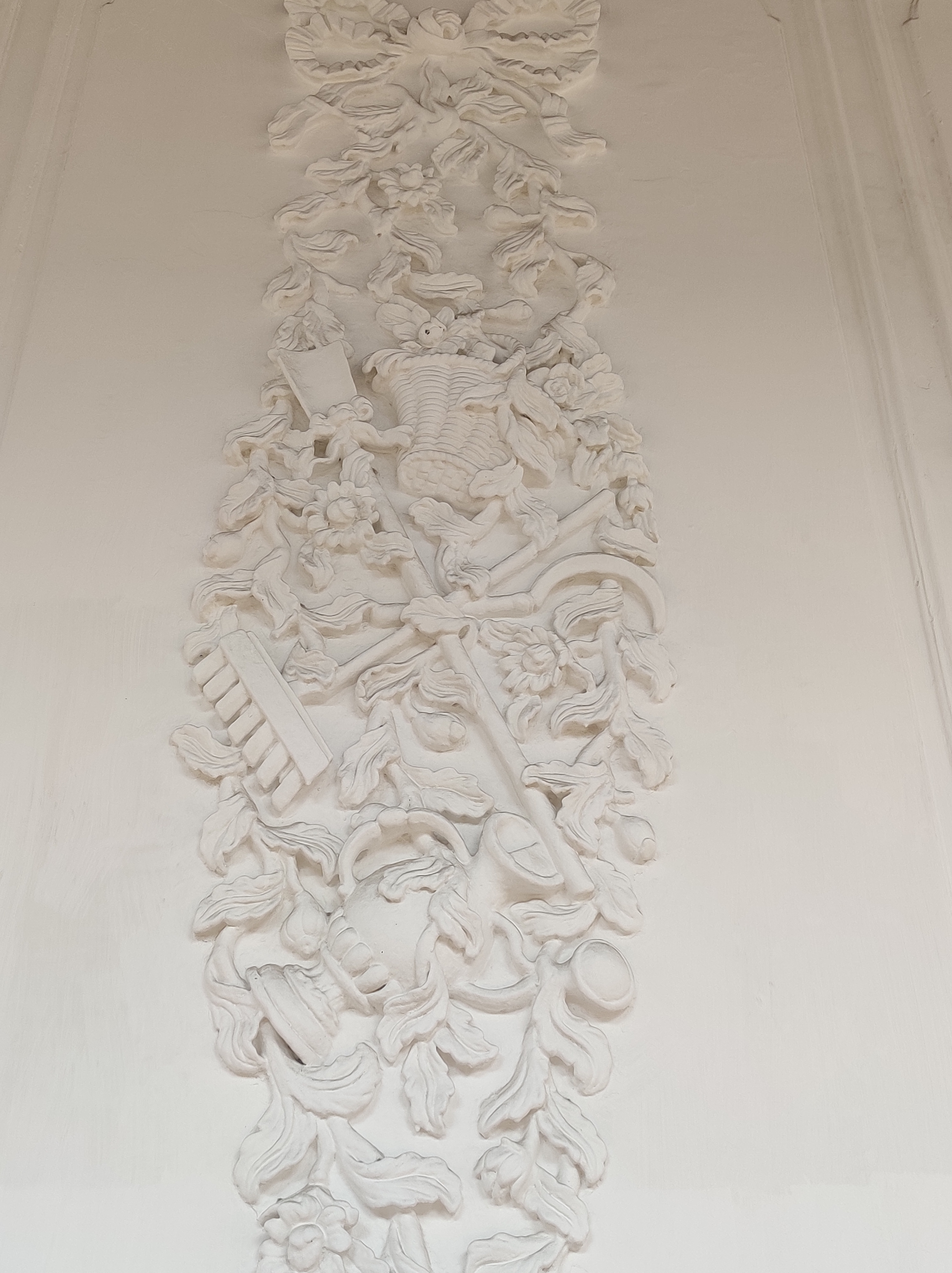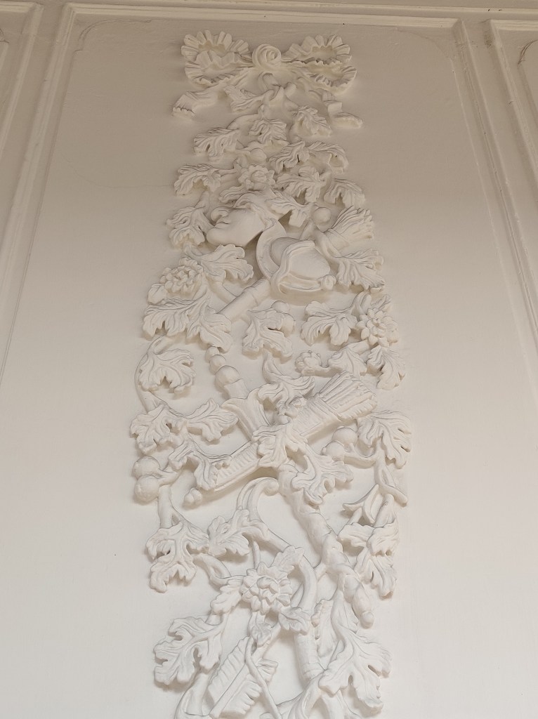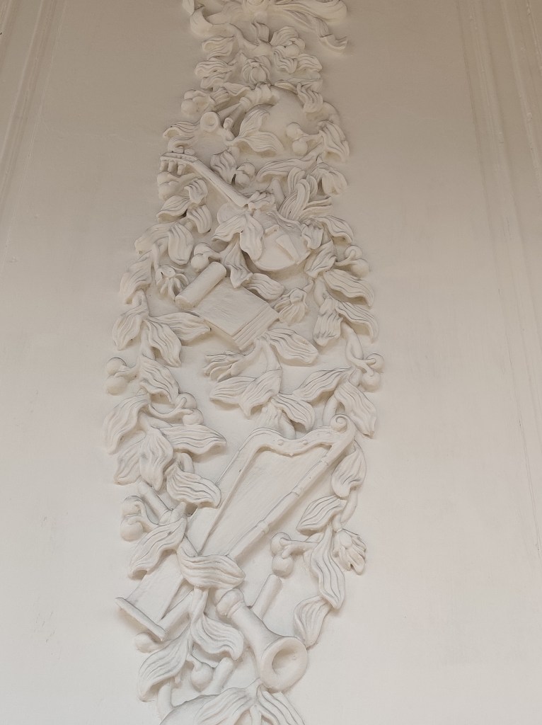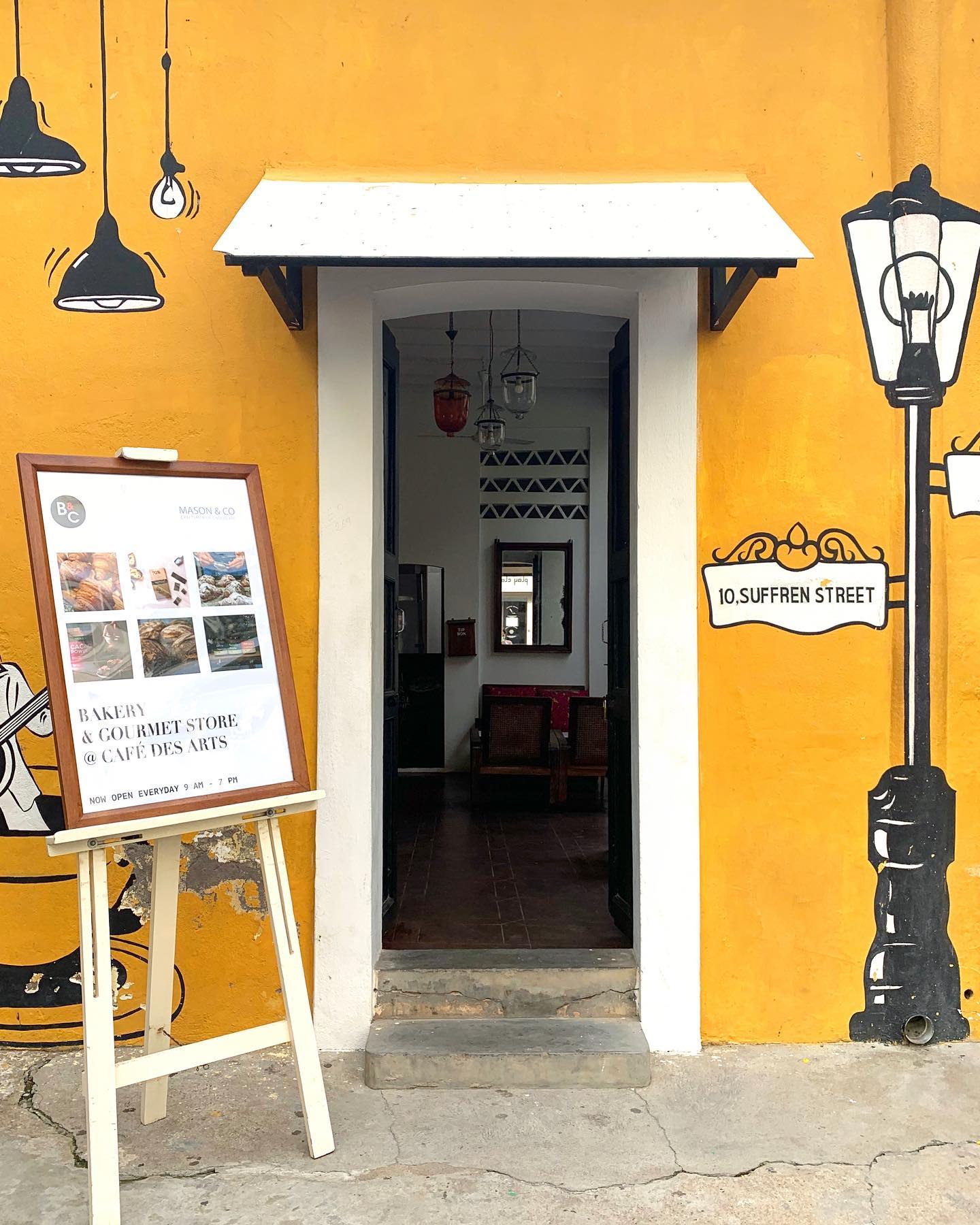 It boasts 12 foot tall arched doors, a wide portico overlooking a beautiful garden, and walls decorated with motifs, each of which symbolizes a unique contribution from the French.