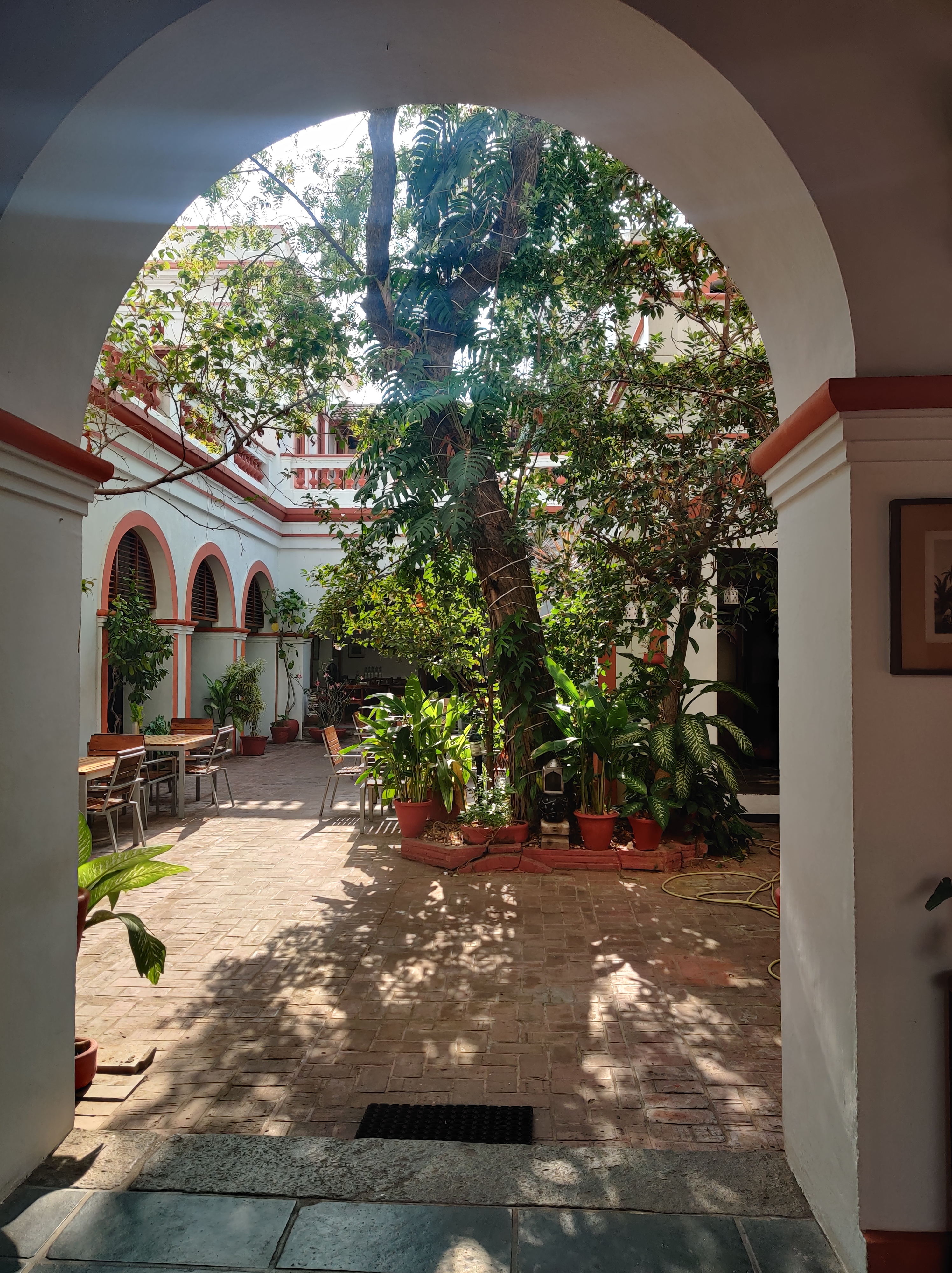 The majority of these French homes had full or partial street coverage and were constructed using identical ground designs with minor differences. To further guard against the tropical weather and its quirks, the principal façade have colonnaded porticoes. The remaining building rooms open onto the private inner courts created by the walled gardens. While Indian society has used courtyards for gatherings and drying spices, the French added a romantic charm to their designs by their ‘jardins‘ or gardens.