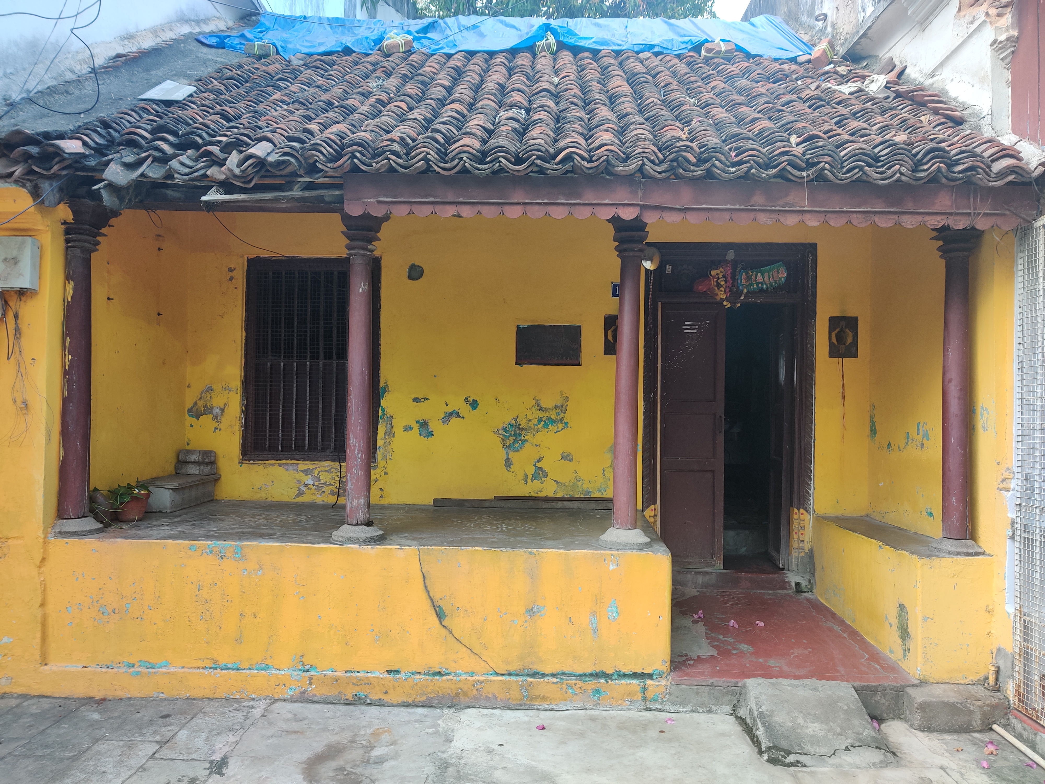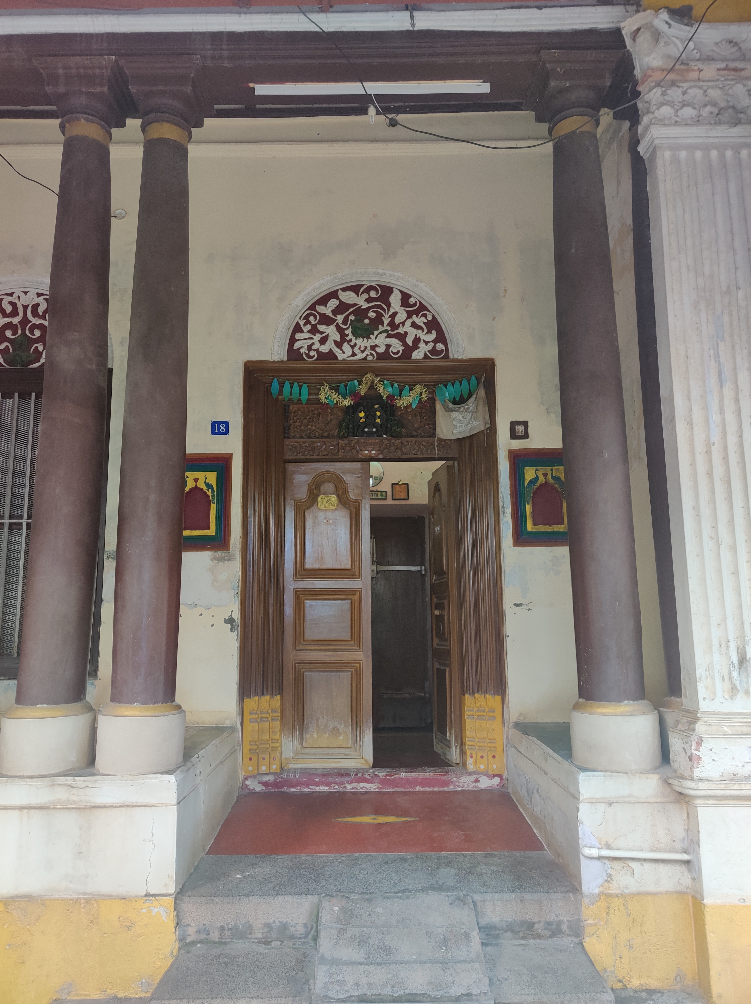 The street serves as the entryway to a traditional Tamil home. The house’s exterior facades include a thalvaram (street veranda), which serves as a social extension of the home, and a thinnai (semi-public veranda space), which is used by visitors and pilgrims and has concrete benches. Due to their personal scale and engaging features, these facades are known as “talking streets” and are a distinctive feature of Tamil architecture. The houses have the recognizable red Madras sloped roofs. No two houses are exactly alike, despite the fact that they all may appear to be identical. After passing through the thinnai, a beautifully carved door is used to enter the house.