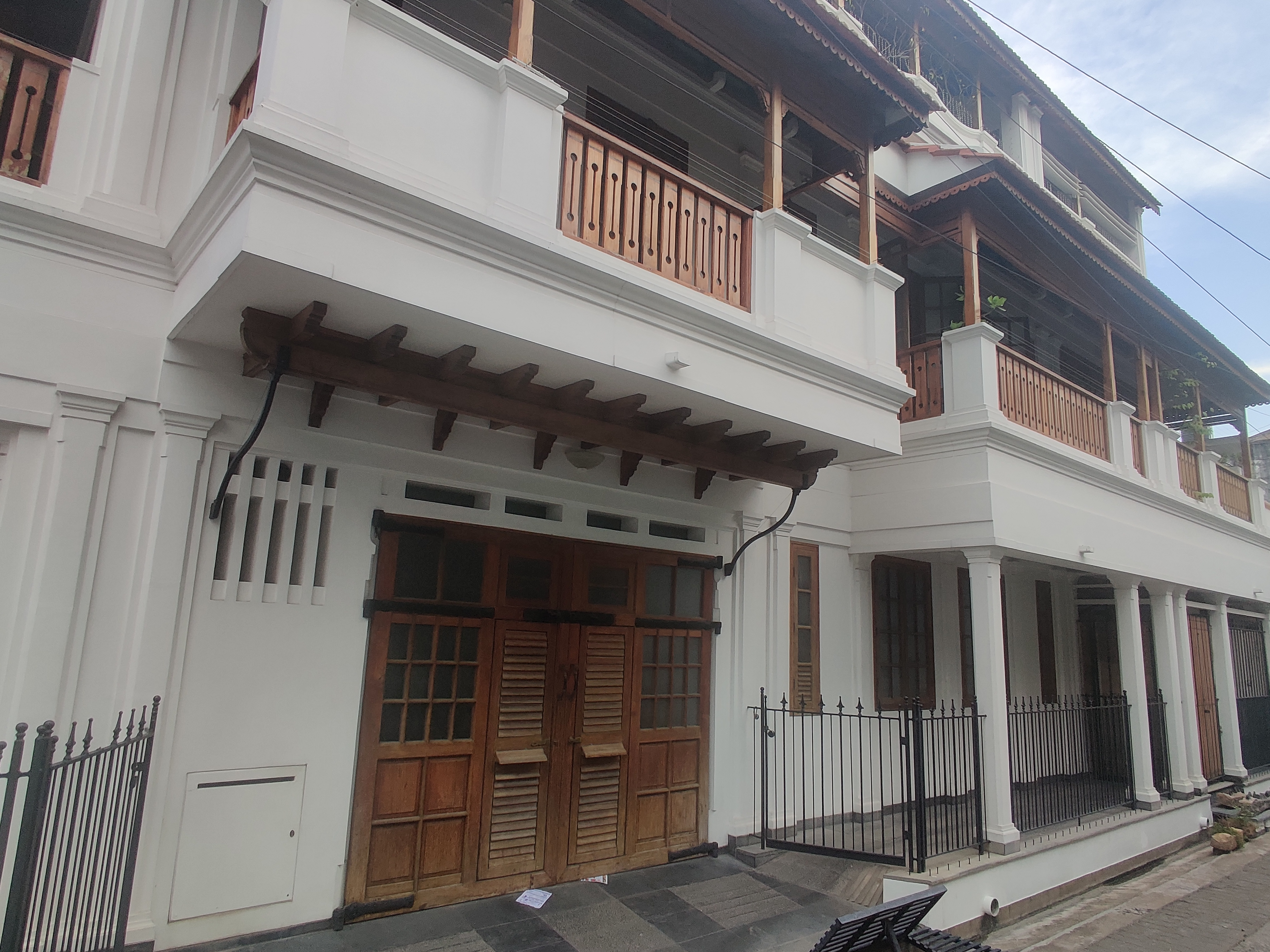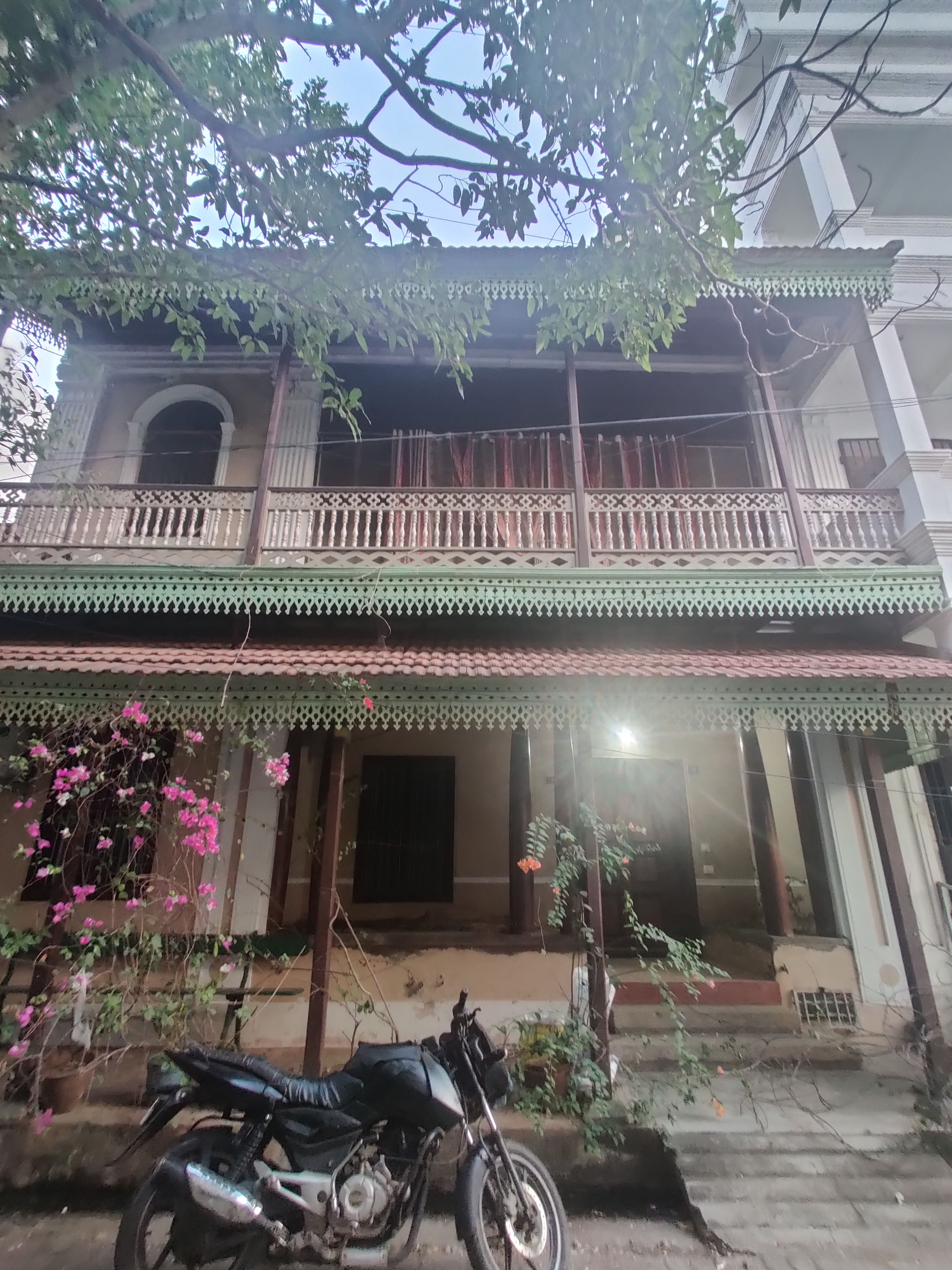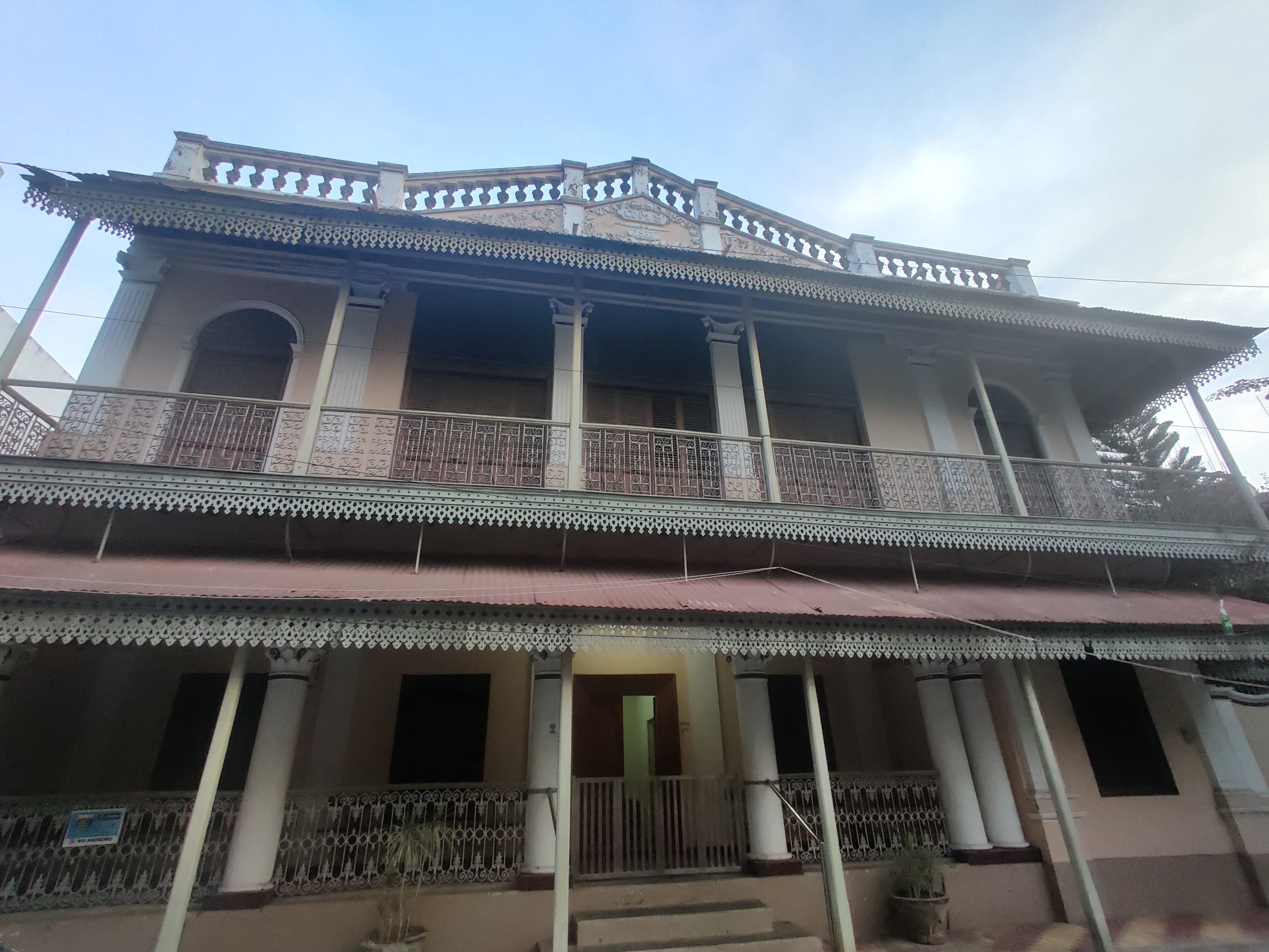 Instead of the pitched roofs of Parisian homes, flat, terraced roofs were used to adapt French architectural styles to local climatic circumstances. High garden walls, ornate entrances, and continuous wall-to-wall construction made up the street facades. These homes were primarily characterized by wooden balconies supported by iron brackets and continuous parapets with plain architectural details. The windows either had bands and louvered wooden shutters or were segmentally arched and flat.