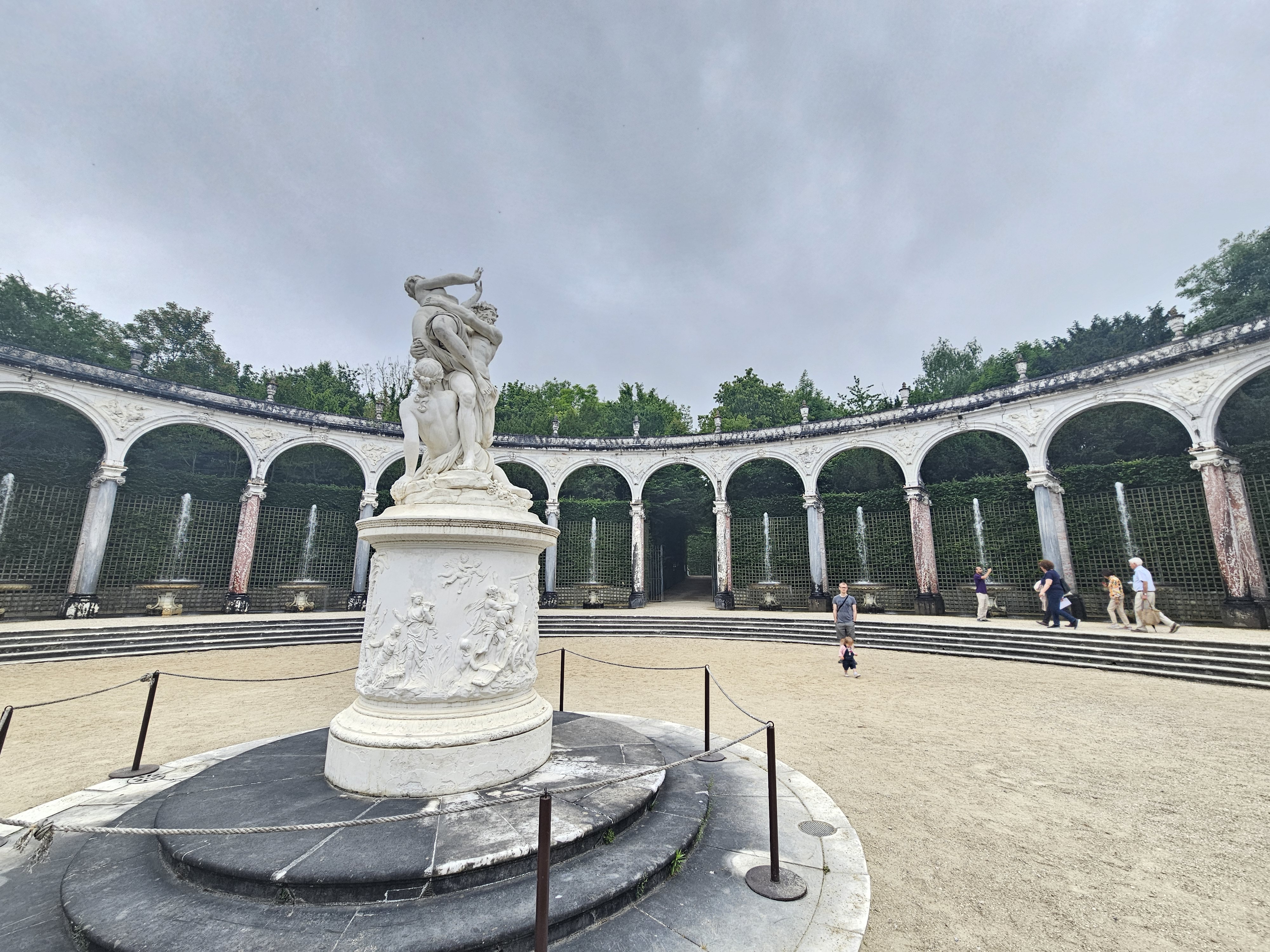 Under the reign of Louis XIV the gardens of Versailles contained fifteen groves. Contrasting with the strict regularity of the general layout of the gardens, they had a variety of décors and shapes. The Ballroom Grove was the last grove to be laid out in the gardens by Le Nôtre. The works began in 1680 and were completed in 1685. The Grand Dauphin, the son of Louis XIV, organized a great dinner there to celebrate its inauguration. The grove was designed as an amphitheater of greenery, intended for dancing. In fact, at the time of my visit, some of my fellow visitors decided to honor the old tradition and work up some waltz befitting the atmosphere!