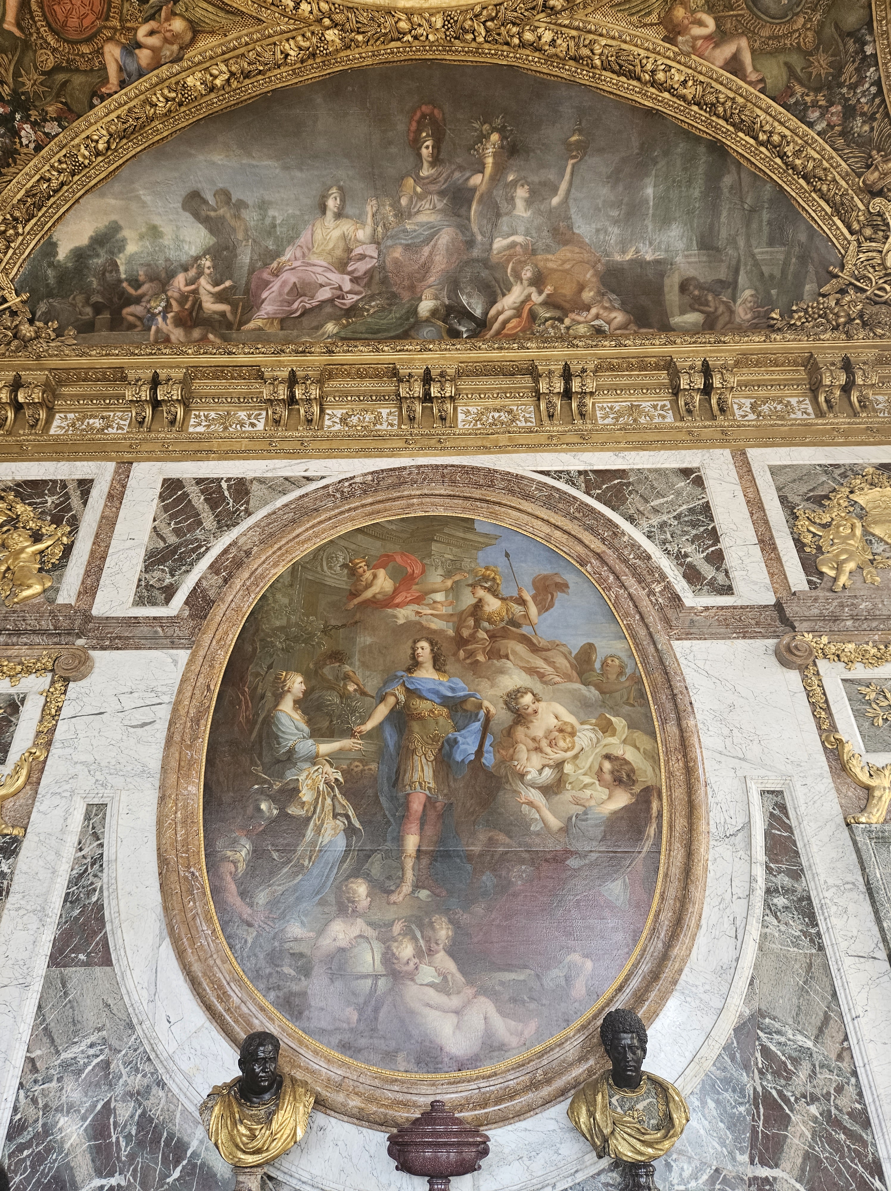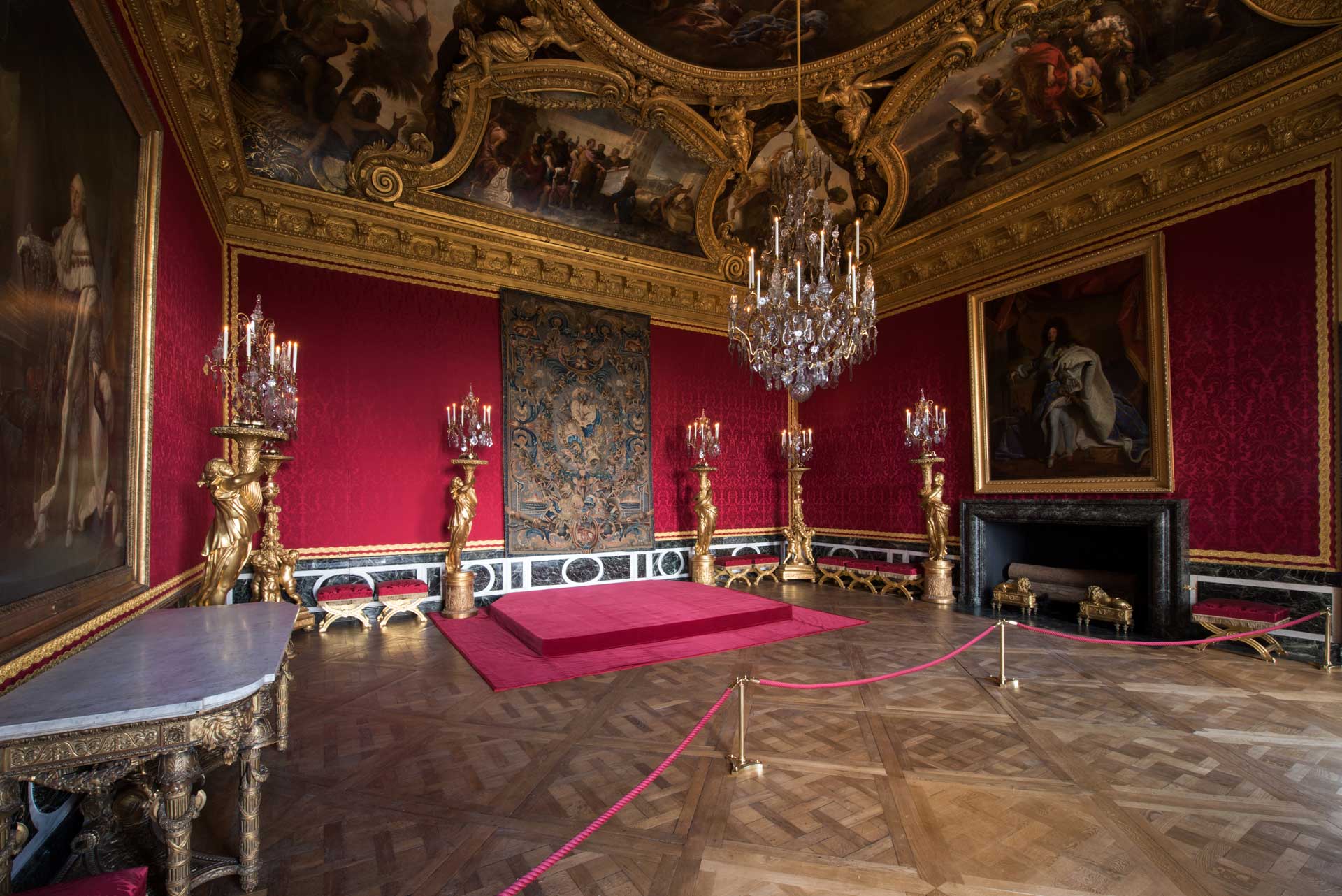 Over the fireplace is the most famous portrait of Louis XIV, by Hyacinthe Rigaud. The painter made the original portrait in 1701 upon a personal request by the king, who wanted to give it to his grandson who had recently become king of Spain. Exceedingly pleased with the result, Louis XIV decided to keep the original for himself and commissioned copies from the artist. The copy in Versailles was made in 1702. The original painting hangs now in the Musée du Louvre. The ceiling paintings of the room consists of “Apollo in the Chariot of the Sun accompanied by the Seasons” by Chalres de la Fosse. The arches in the vault illustrate the king’s magnificence and magnanimity though various examples from Antiquity such as Vespasien building the Colosseum; Augustus building the port of Miseno, Porus before Alexander and Coriolan entreated by his wife and mother to spare Rome.
