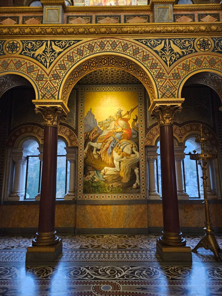 The interiors of Neuschwanstein are a lavish tribute to Wagner’s operas, featuring scenes from “Lohengrin,” “Tannhäuser,” and “Parsifal.” The overall grandiose designs reflect Ludwig’s fascination with medieval knighthood and Christian mysticism. Mind you, since the interiors are part of a guided tour, photography is strictly prohibited. These were the few that I managed to capture just because I had to. And to be honest, I did get caught while being sneaky!