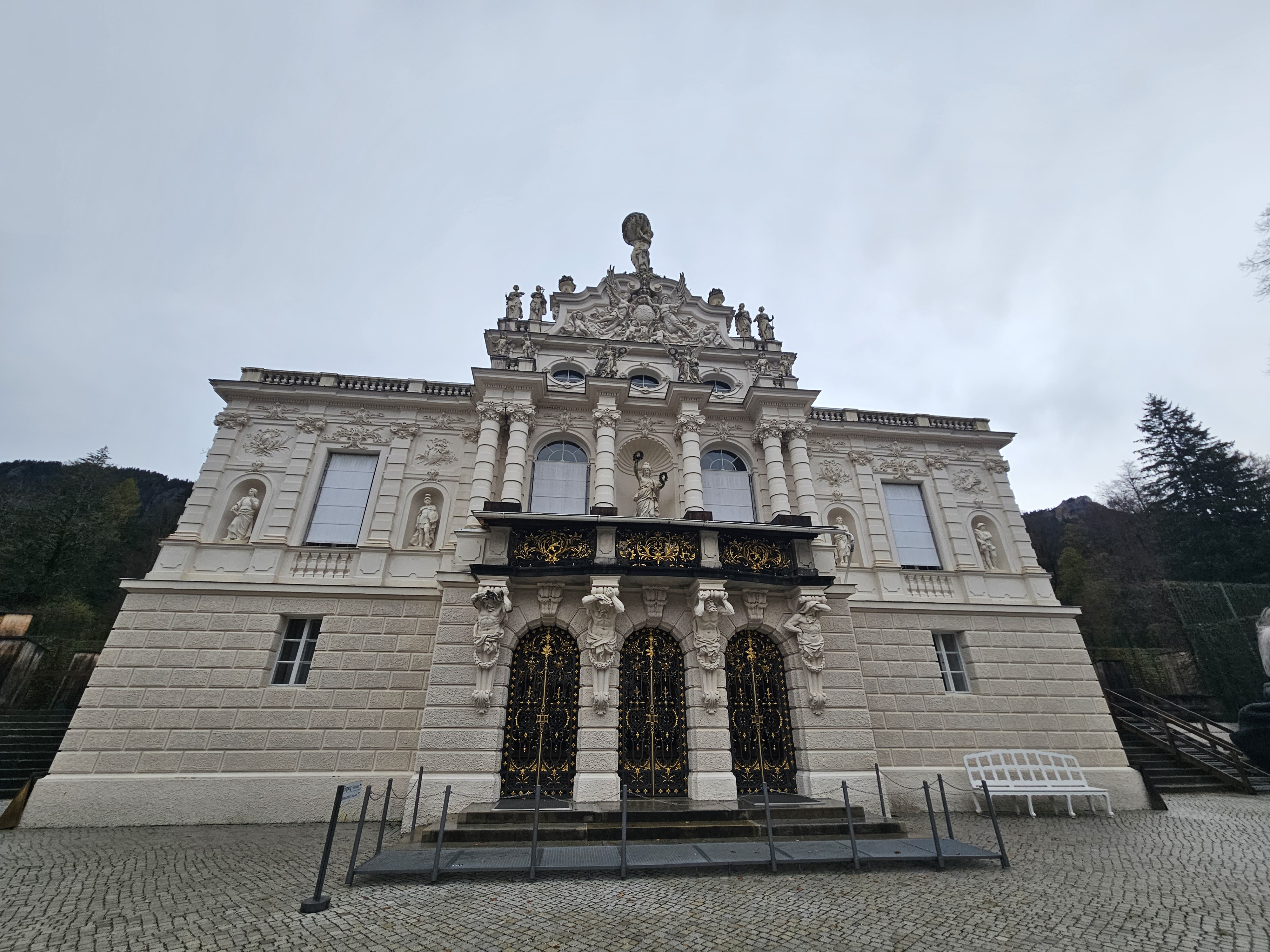 Ludwig’s architectural ambitions were not limited to Neuschwanstein. An 1867 visit to the Palace of Versailles in France had brought the lifestyle of Kings Louis XIV, XV, and XVI to life for Ludwig. He loved the the opulence and aristocratic feel of the palace. Just as the Jugend Mountain had been an ideal setting for Neuschwanstein, the isolated Graswang Valley was perfect for his next creation, called Linderhof. Schloss Linderhof, a smaller but equally opulent palace, was inspired by the French Rococo style. Instead of deep, dark wood paneling and heavy murals, Ludwig chose gold, gold and more gold for his palace. Unlike the sunny south-facing bedroom of Versailles, Ludwig’s bedroom faced north, perhaps symbolizing his identity as the Moon King in contrast to Louis XIV’s Sun King. Outside his window, a stunning series of thirty terraced marble steps cascaded water into a statue-filled pool.
