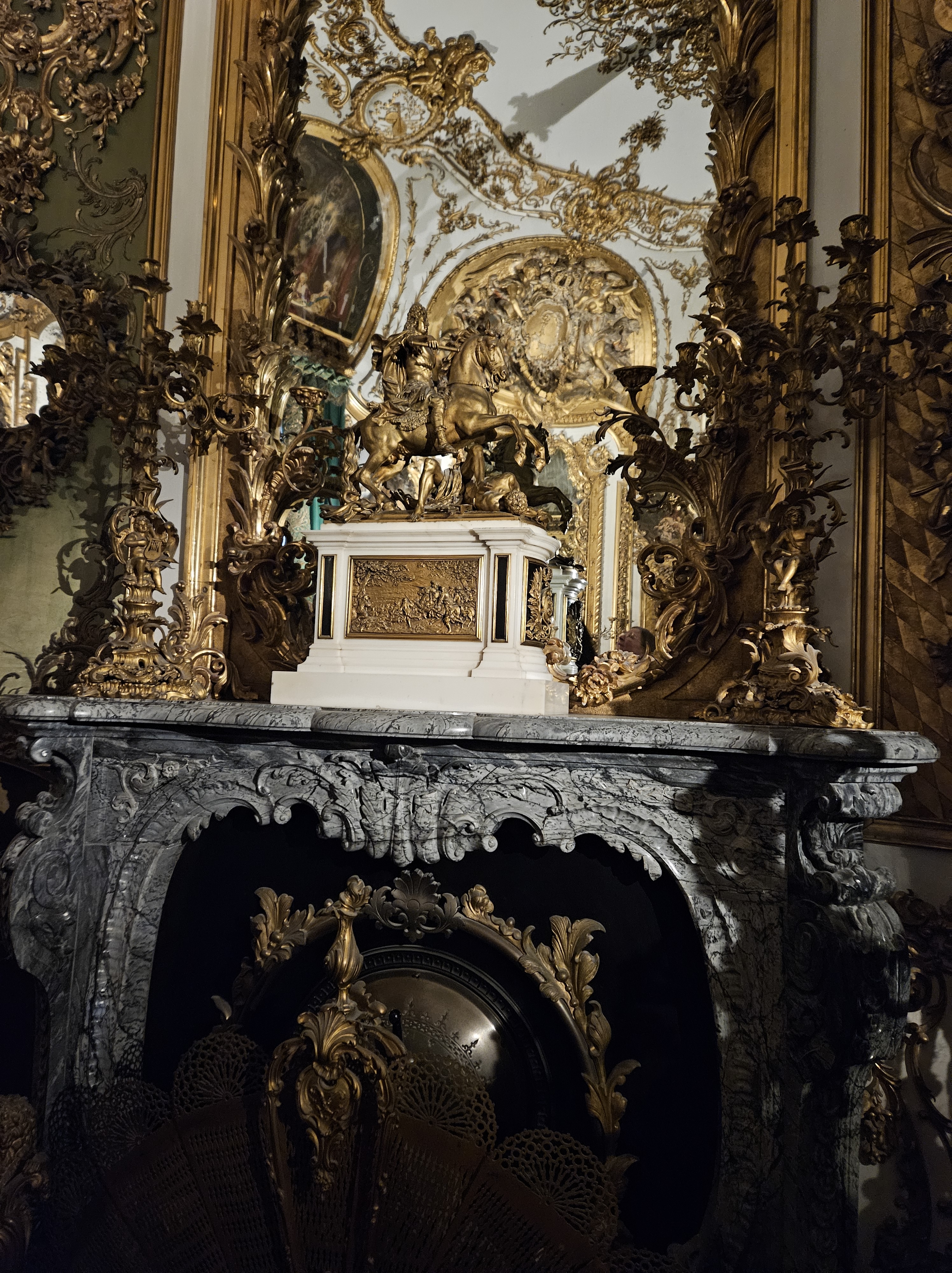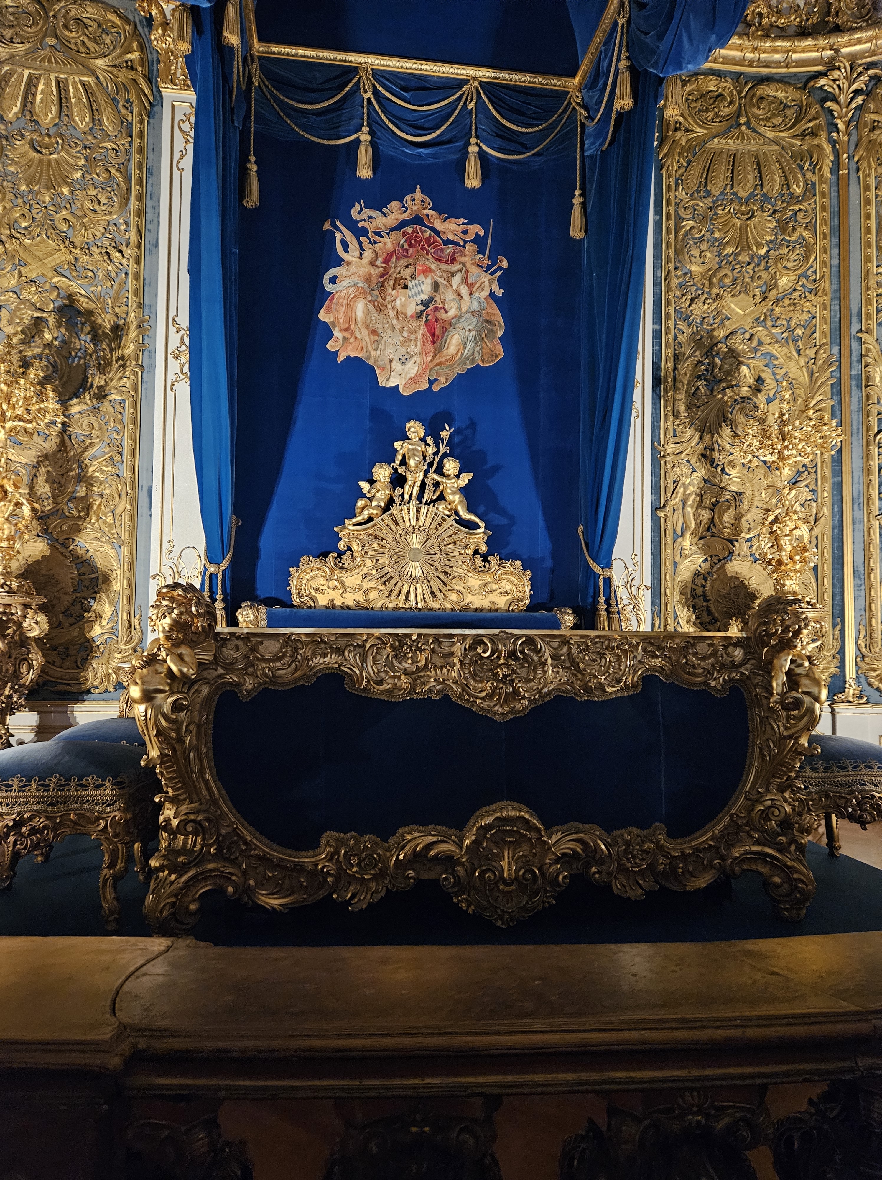Louis XIV’s astronomical expenditure stimulated a huge expansion of French crafts and specialist applied art, led directly to the emergence of Rococo art (dominated by France), and created an momentum for French painting and sculpture that paved the way for Paris to become the arts capital of the world. The Apollo Salon at Versailles is a dedication to the Roman god of the sun. It was initially designed as the King’s chamber before becoming the throne room. Until 1689, it housed a 2.60 metre throne which was melted down in order to pay for costly wars. All the other furniture – of solid silver – were also melted down. Today a gilded wooden chair has been placed on a dais on a Persian carpet.